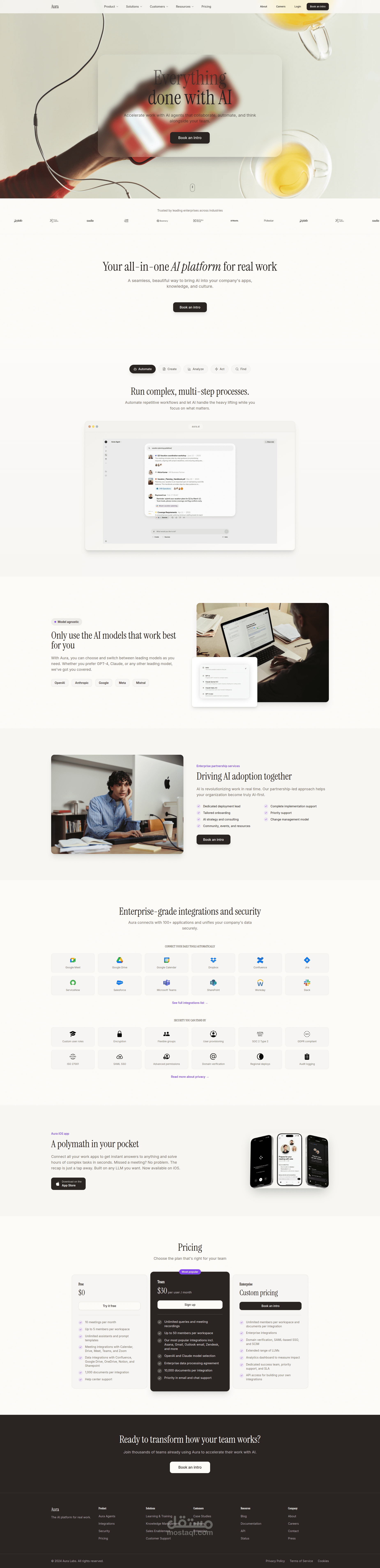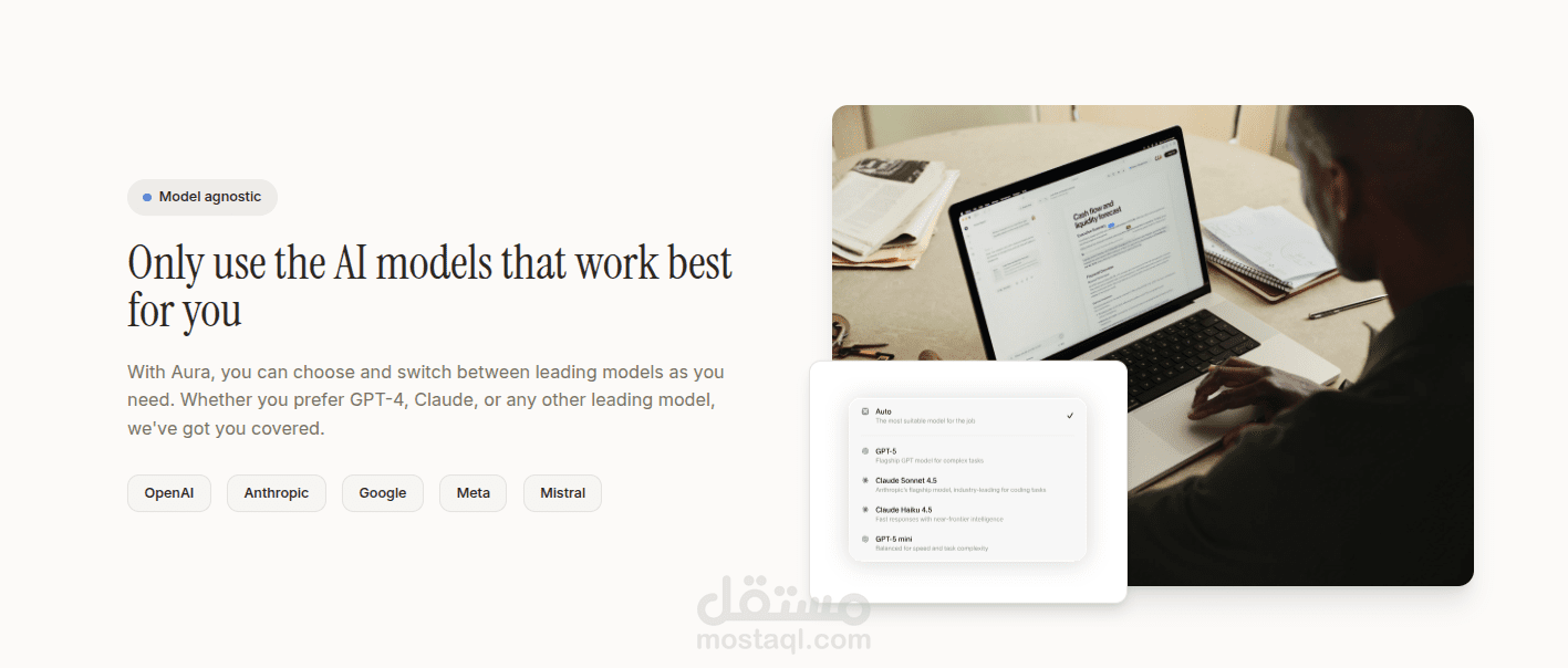 منصة Aura هي منصة ويب متكاملة تعتمد على الذكاء الاصطناعي، تهدف إلى تمكين الفرق والمؤسسات من أتمتة الأعمال، إنشاء وتحليل المحتوى، وتحسين الإنتاجية من خلال واجهة حديثة وسريعة الاستجابة مبنية بتقنيات React وTypeScript وVite وTailwind CSS، مع دعم التكاملات، إدارة الشراكات، وتقديم تجربة مستخدم احترافية تدعم النمط الليلي والفاتح، مما يجعلها الحل الأمثل لتعزيز الكفاءة والتحول الرقمي في بيئة العمل.