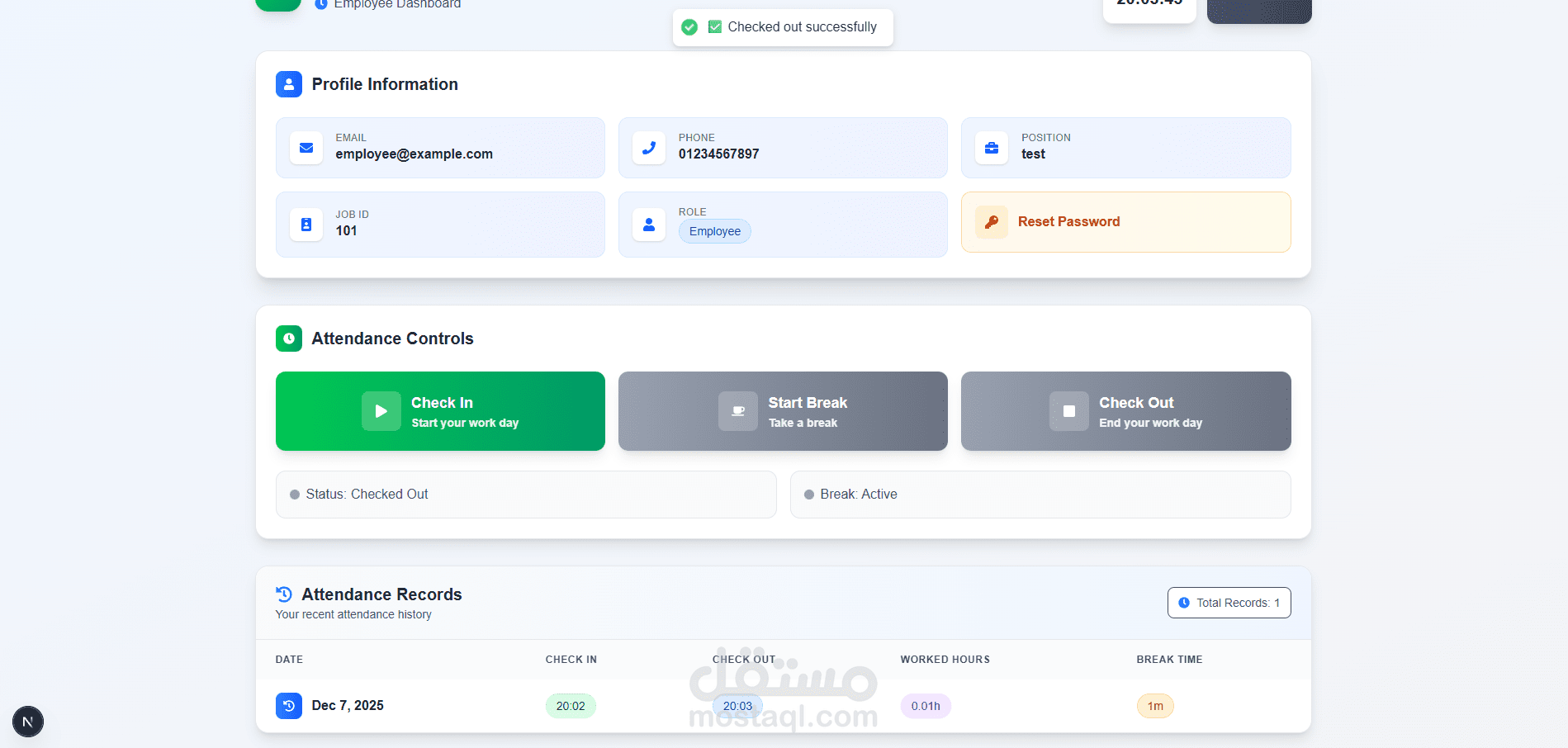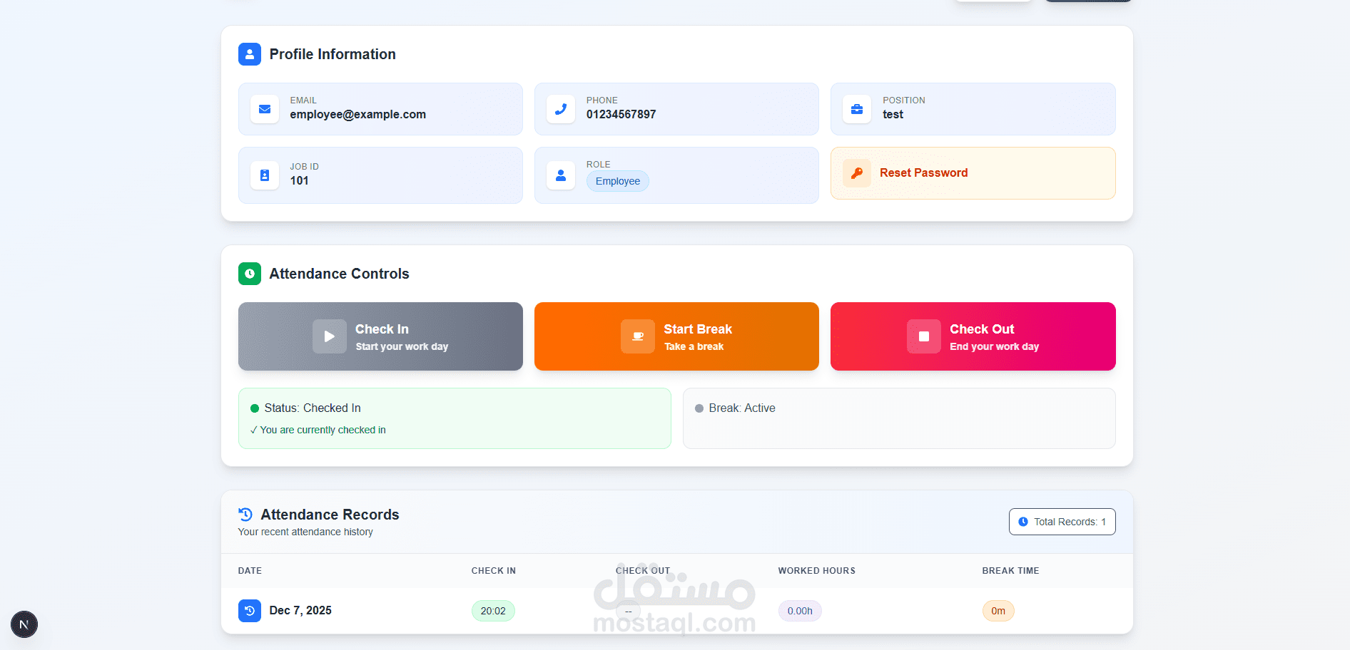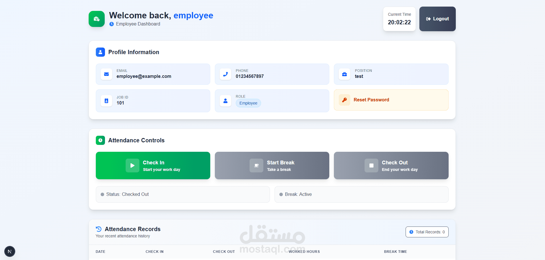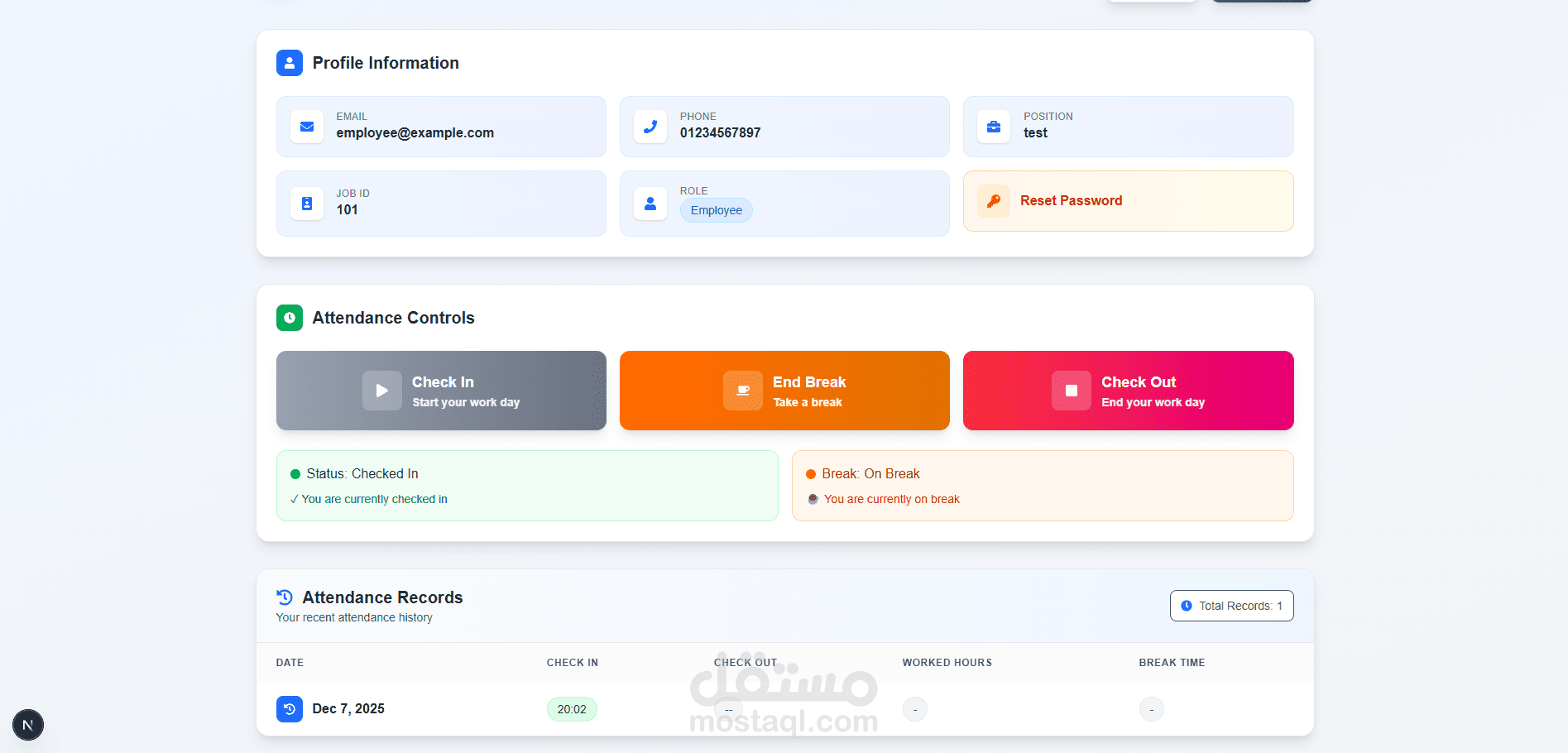 المشروع هدفه إنشاء نظام تسجيل حضور وانصراف (Attendance System) داخلي للموظفين بطريقة بسيطة وسريعة وسهلة الاستخدام.