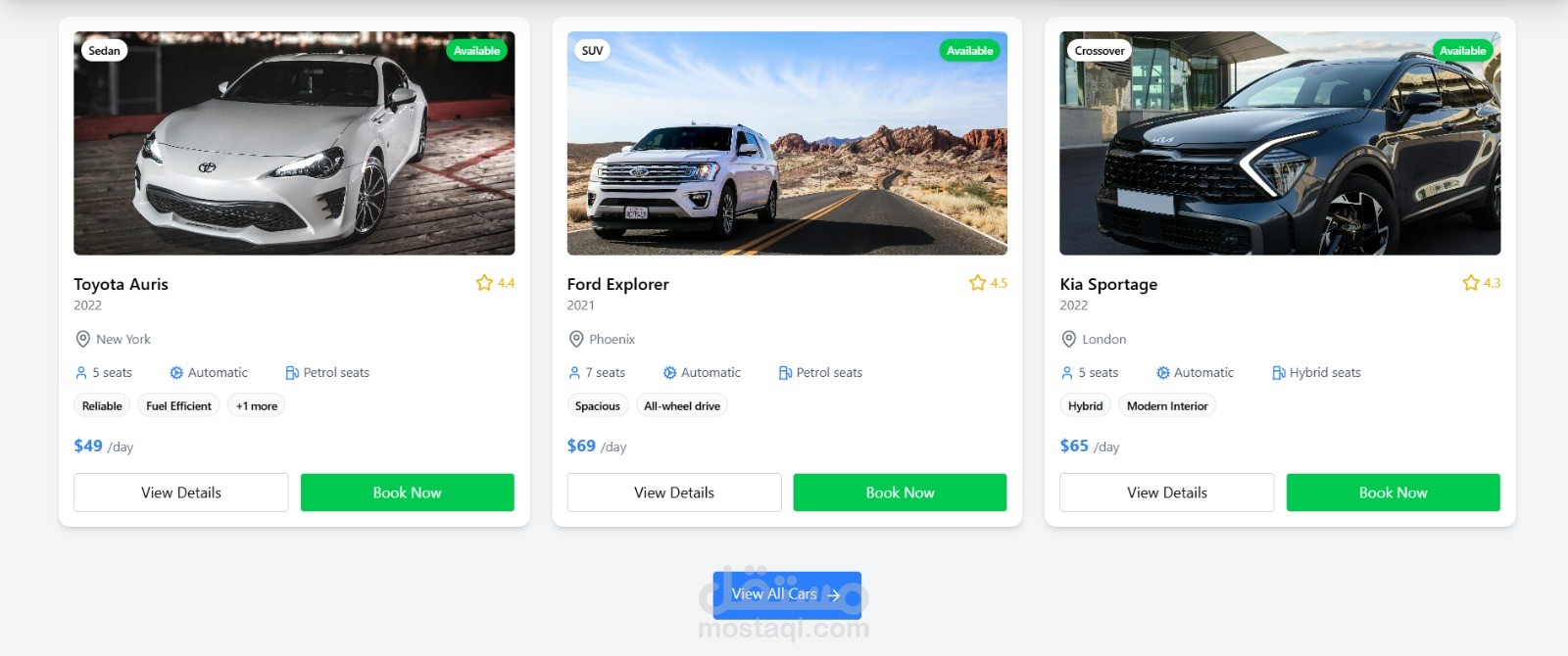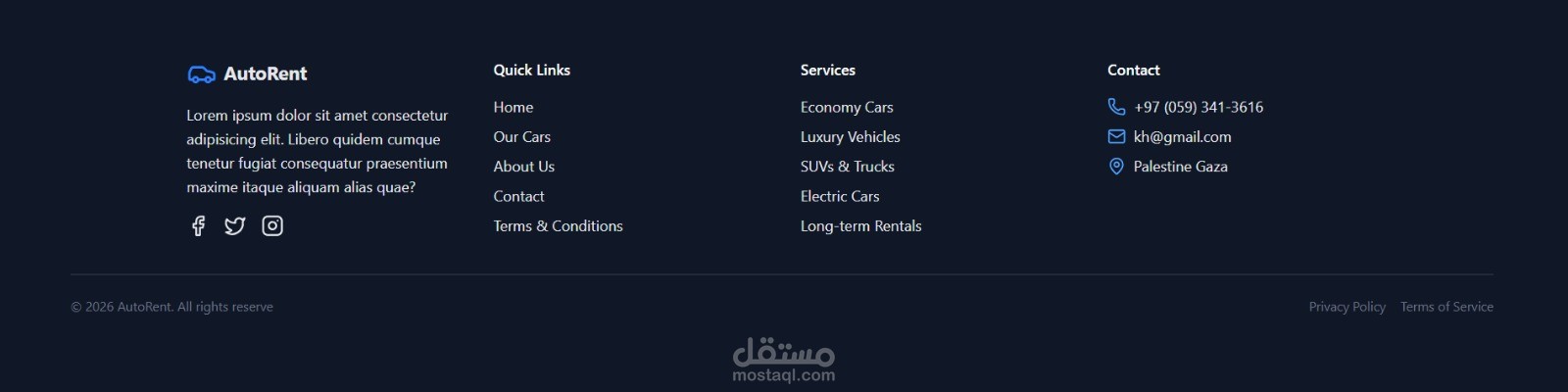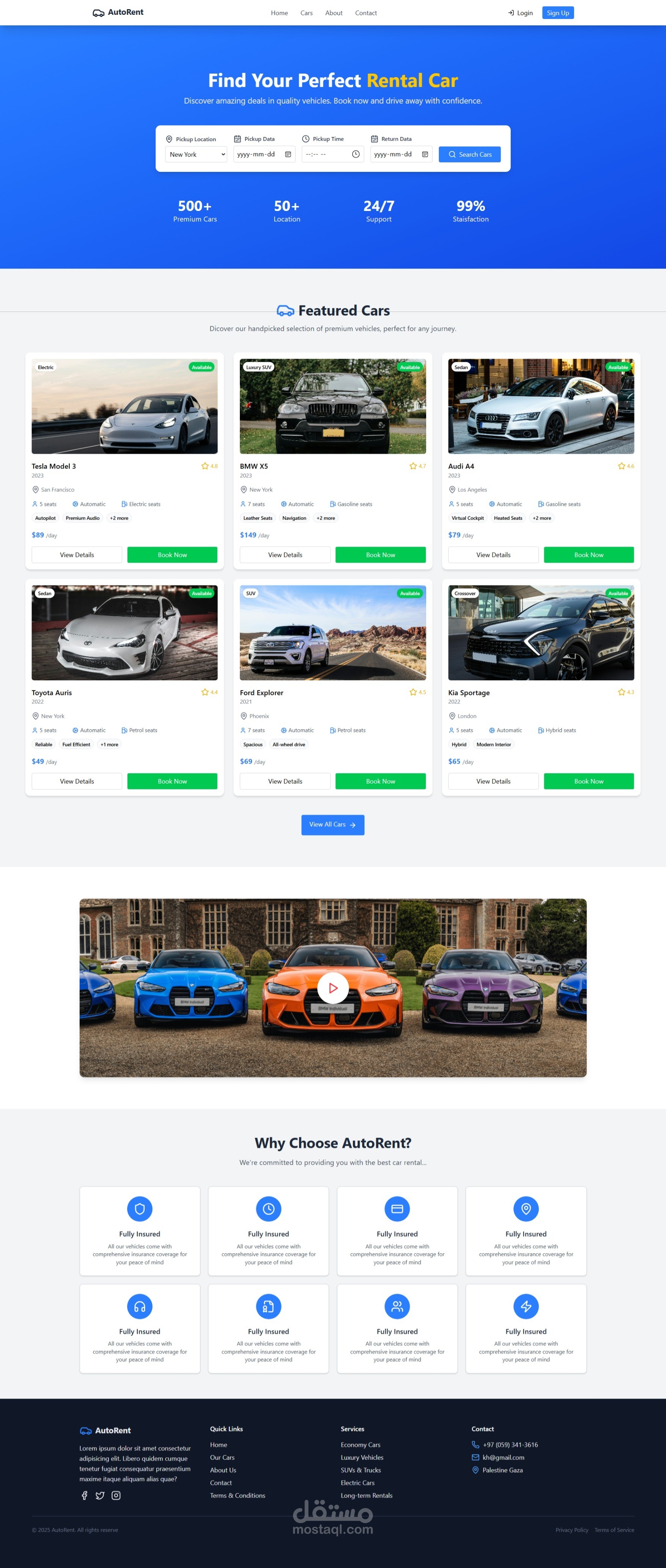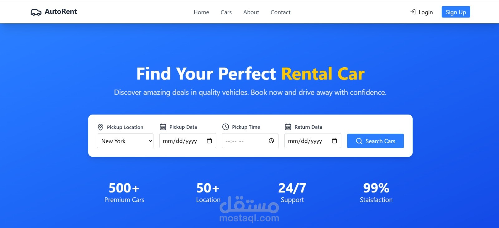 هو موقع حديث بتصميم عصري لتأجير السيارات، معمول باستخدام React و Tailwind CSS عشان يكون سريع، سلس، ومتجاوب على كل الأجهزة