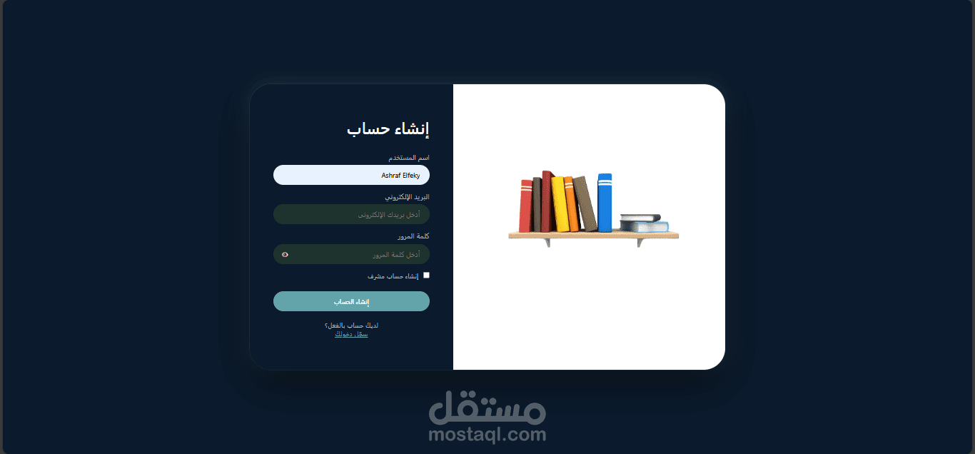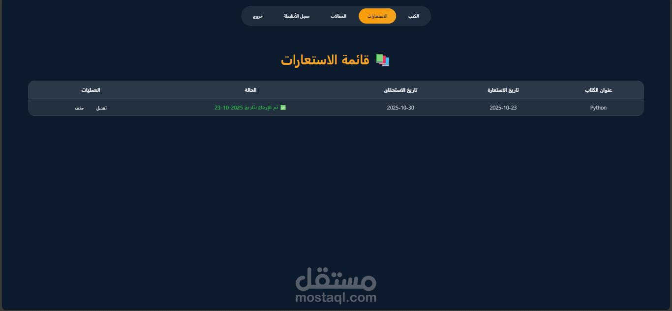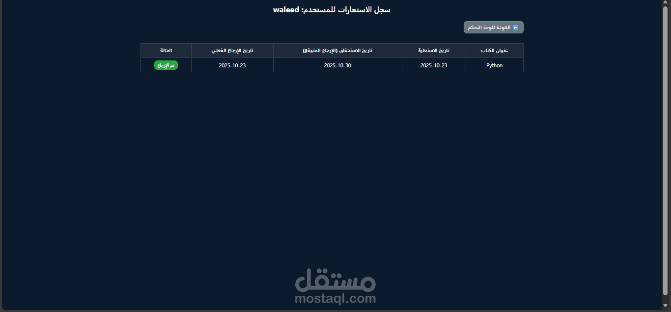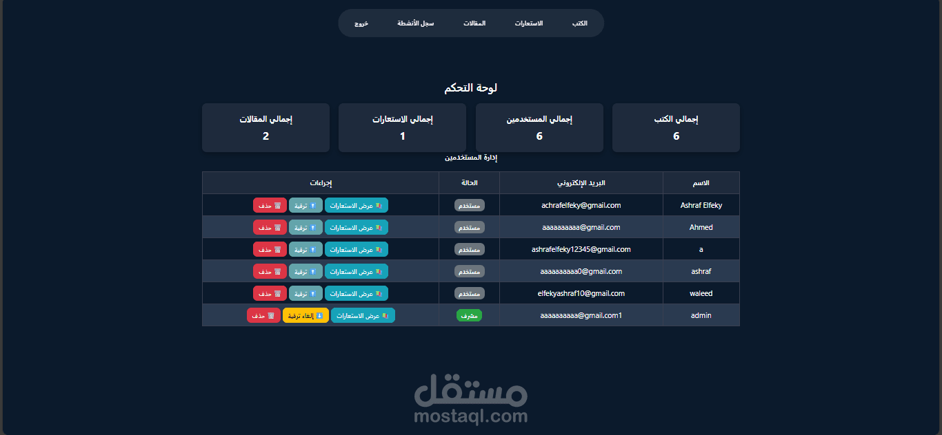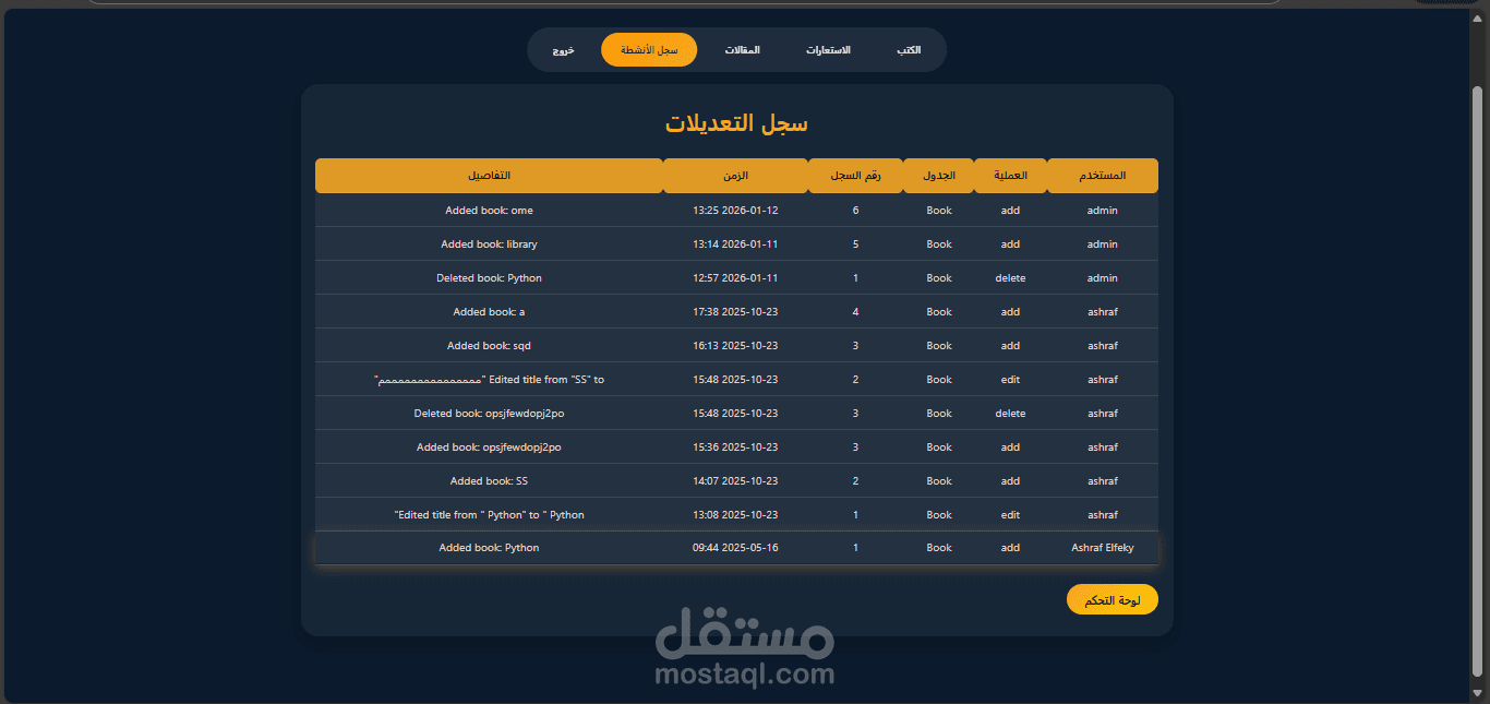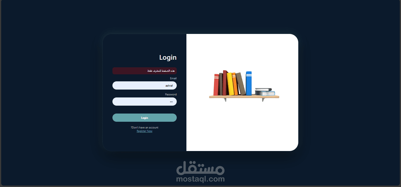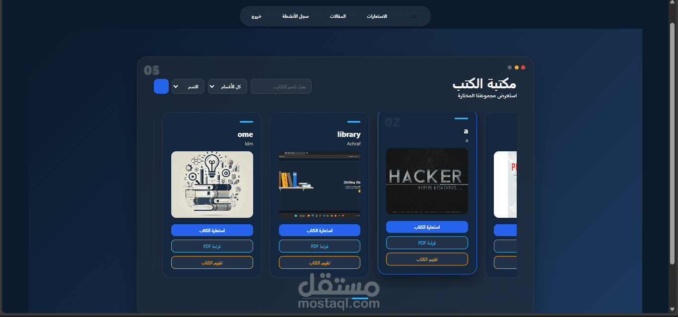 يحتوي المشروع على لوحة تحكم للمشرف تعرض إحصائيات شاملة للمكتبة، إدارة المستخدمين، وسجل الأنشطة، مع واجهة مستخدم حديثة ومتجاوبة تم تصميمها باستخدام Bootstrap لضمان تجربة مستخدم سلسة وجذابة.