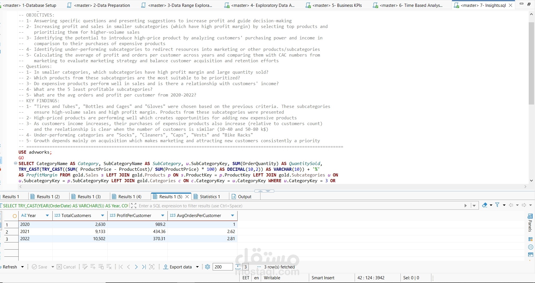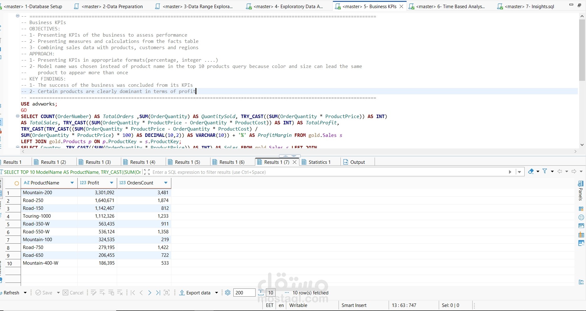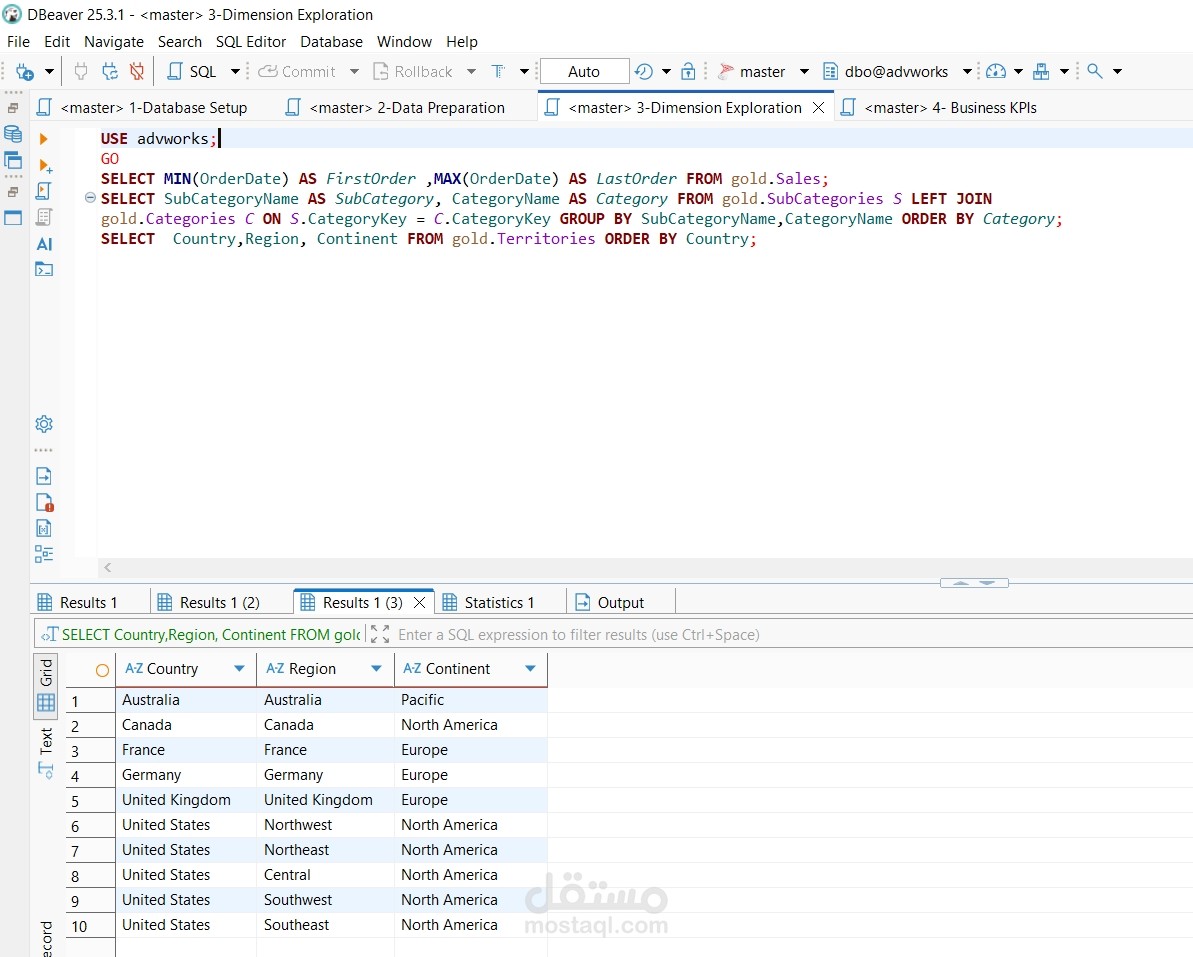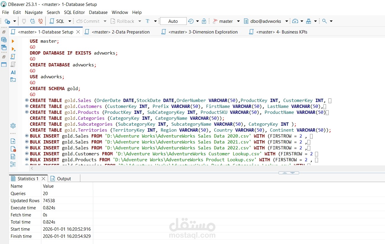 تم كتابة سكربتات SQL باستخدام DBeaver (عميل SQL) وعلى SQL Server (قاعدة بيانات محلية).