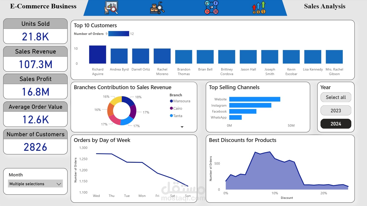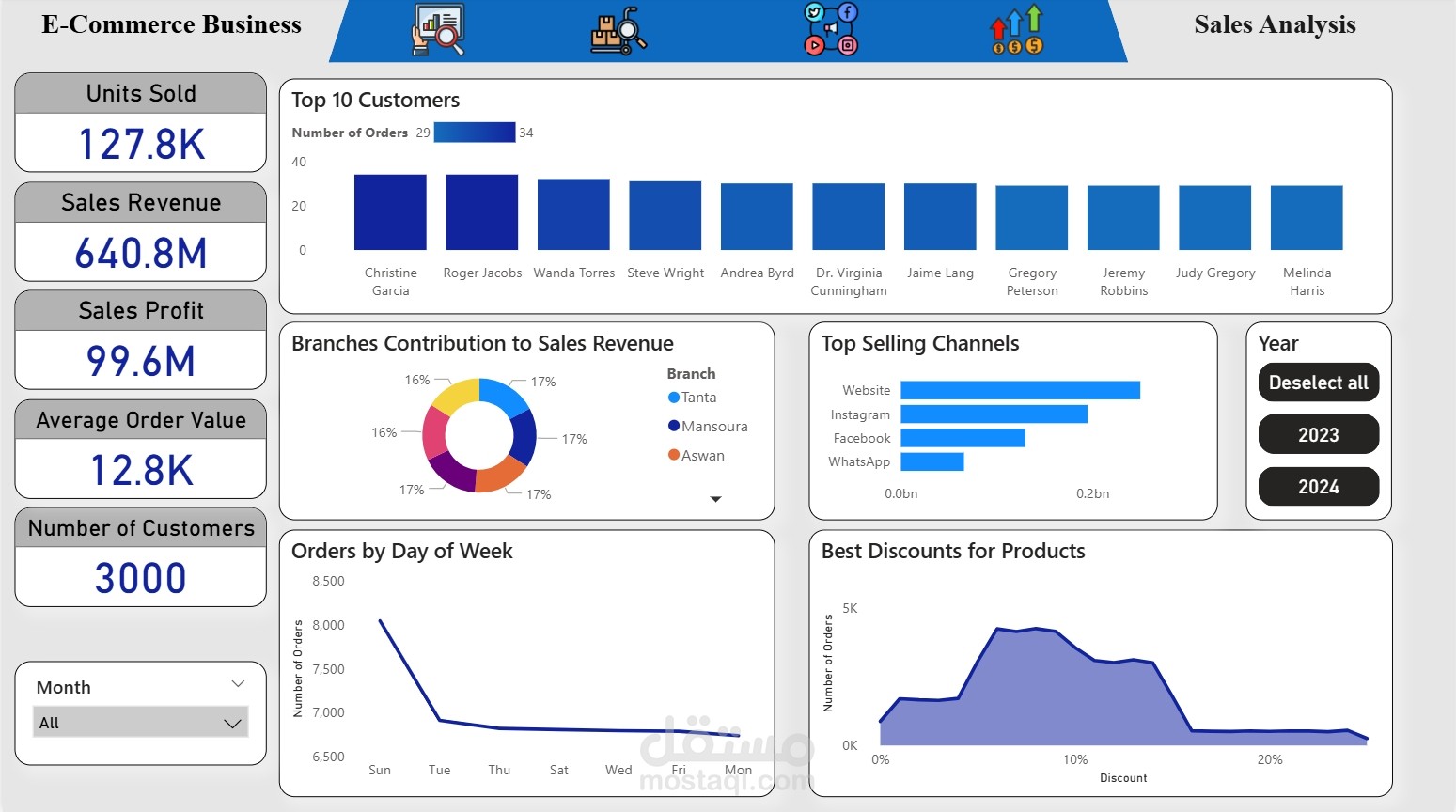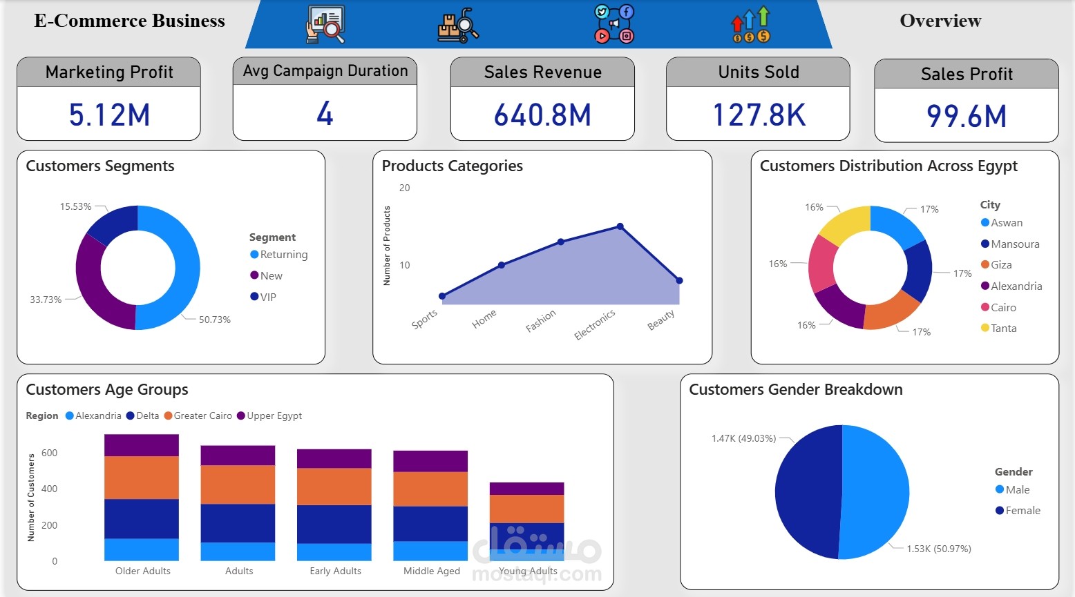 لوحة تحليلات متقدمة تفاعلية للتجارة الإلكترونية تم بناؤها باستخدام Power BI اعتمادًا على بيانات أعمال اصطناعية.