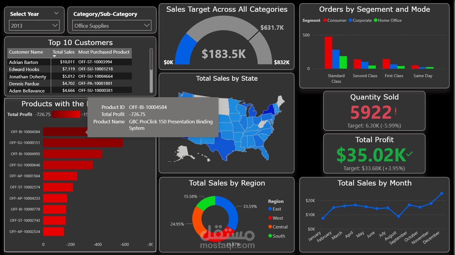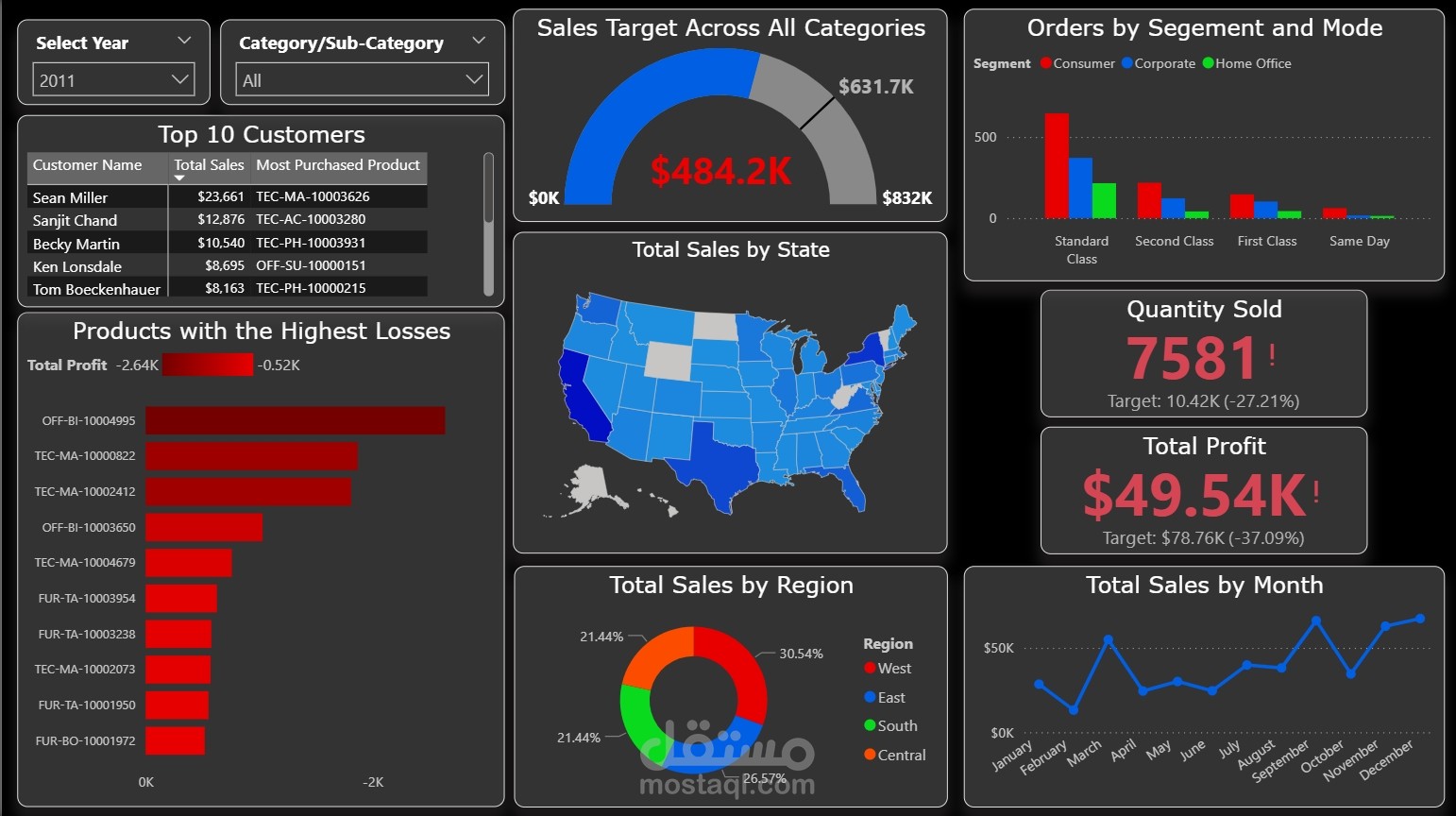 تقوم هذه اللوحة التحليلية بتحليل أداء مبيعات Superstore في الولايات المتحدة باستخدام مؤشرات الأداء الرئيسية (KPIs) ومقاييس أخرى.