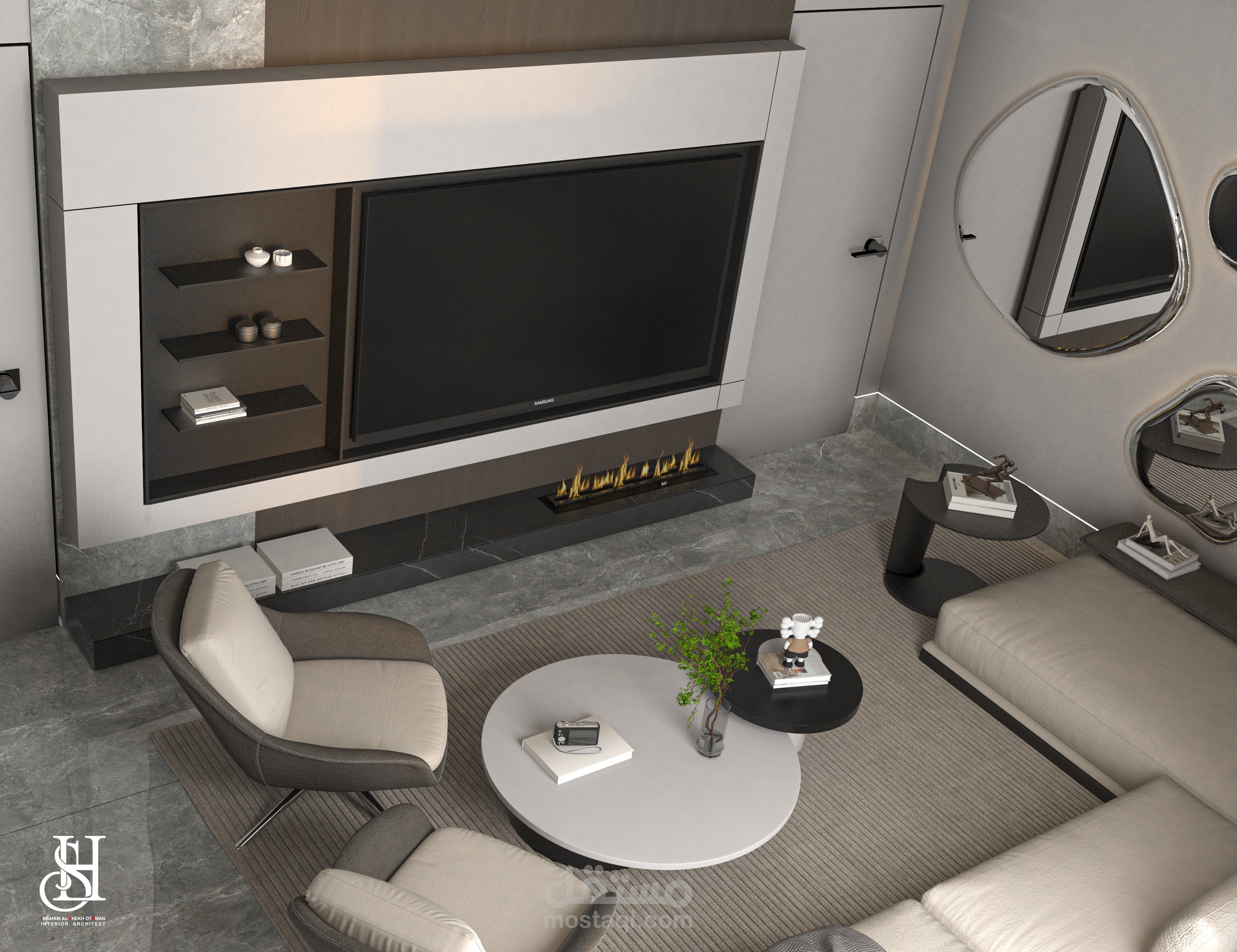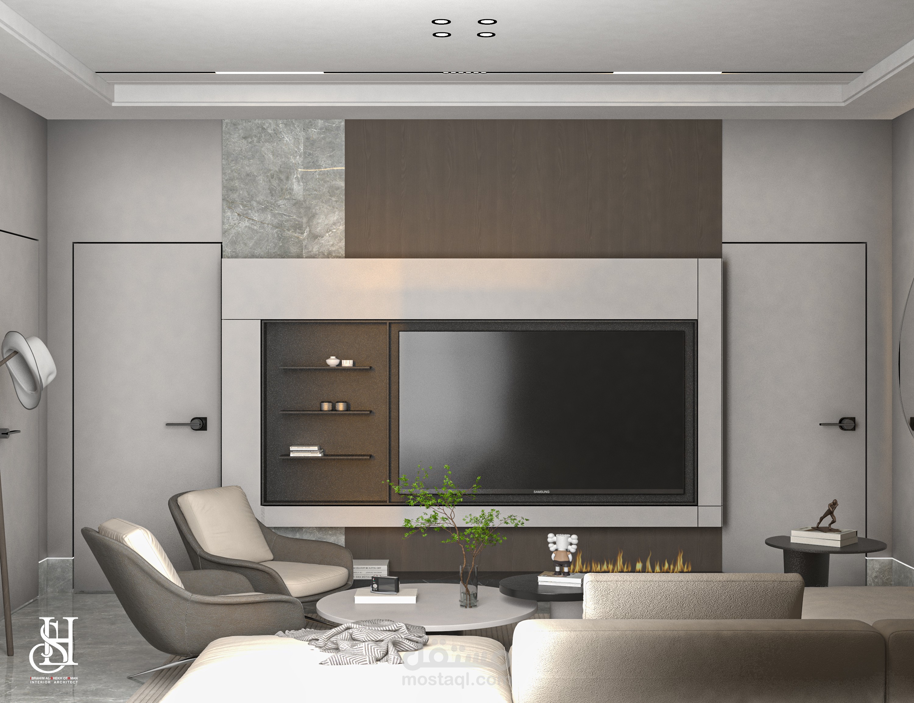 تم توظيف الجدار الرئيسي كوحدة بصرية متكاملة تضم شاشة تلفاز مدمجة ومدفأة حديثة، ما يخلق نقطة تركيز أنيقة دون إثقال الفراغ.