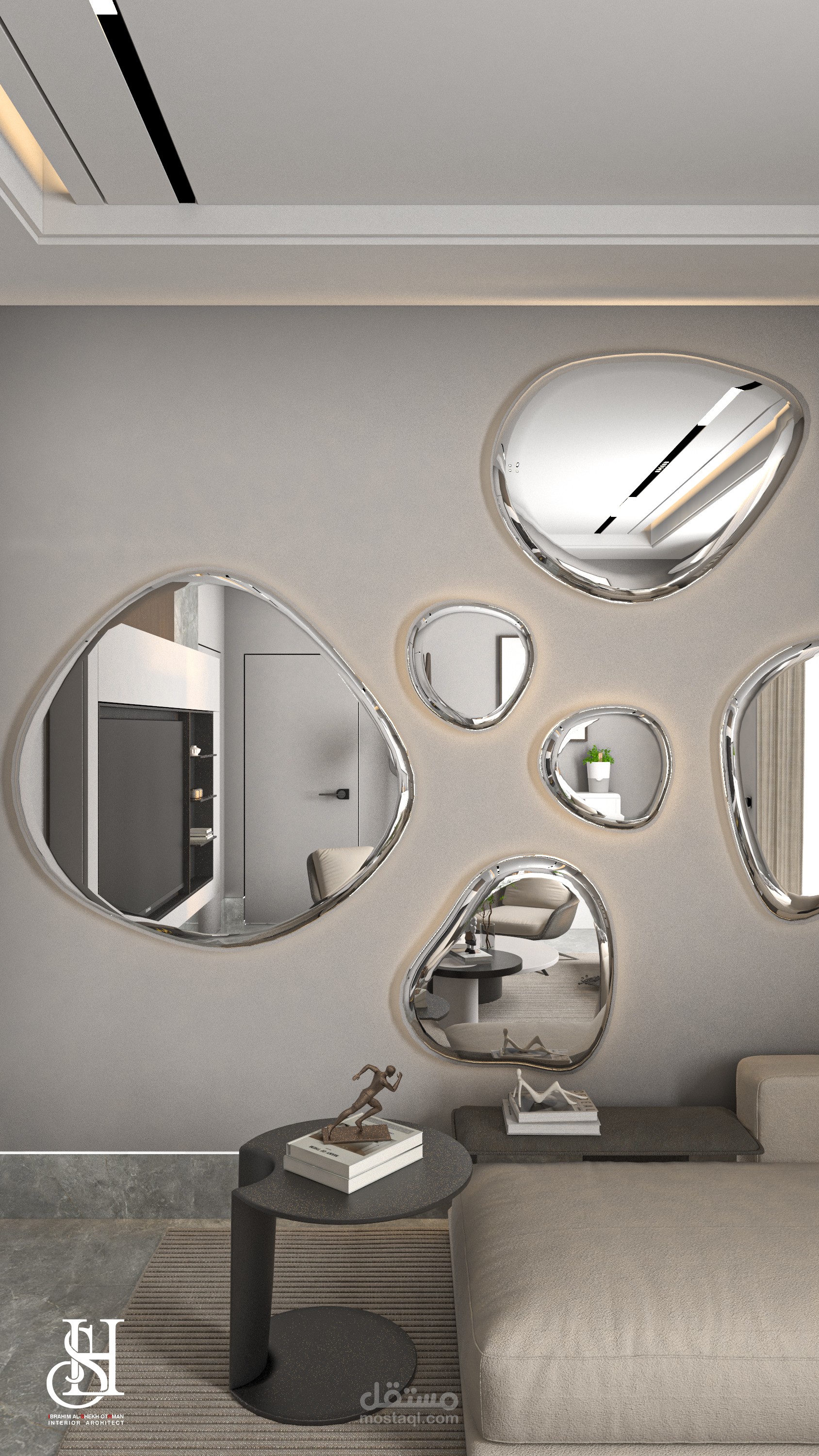 كما أُضيفت مرايا عضوية الشكل بتكوين فني يعكس الإضاءة الطبيعية ويمنح المساحة عمقًا واتساعًا بصريًا.