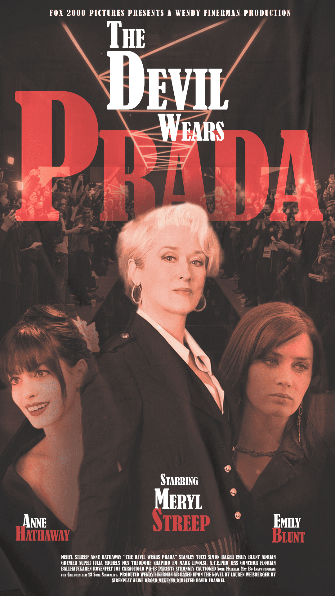 ملصق يتميز بـتكوين هرمي متوازن: يضع ميريل ستريب في المركز كرمز للسلطة، محاطة بشخصيتين جانبيتين. يستخدم ألوان محدودة (أسود، أحمر، أبيض) تعكس الأناقة والدراما، مع إضاءة أمامية قوية تبرز ملامح الشخصيات. العنوان "PRADA" بخط أحمر جريء يهيمن على التصميم، بينما الخلفية المظلمة ترمز لعالم الموضة المزدحم.