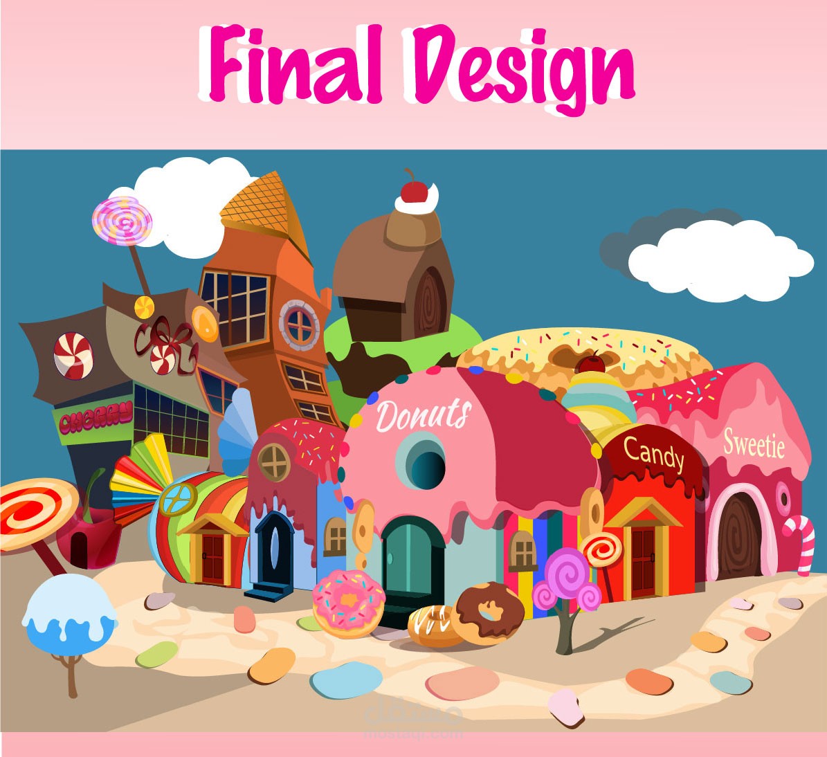 Candy City is a fully illustrated, imaginative world where every building is inspired by sweets. The environment is vibrant, playful, and designed to delight children and creative audiences. Architecture takes the form of cupcakes, donuts, candy canes, ice cream swirls, lollipops, chocolate bars, and gummy shapes, creating a whimsical cityscape full of color and fantasy. The project aims to build a lively, magical city entirely through illustration.