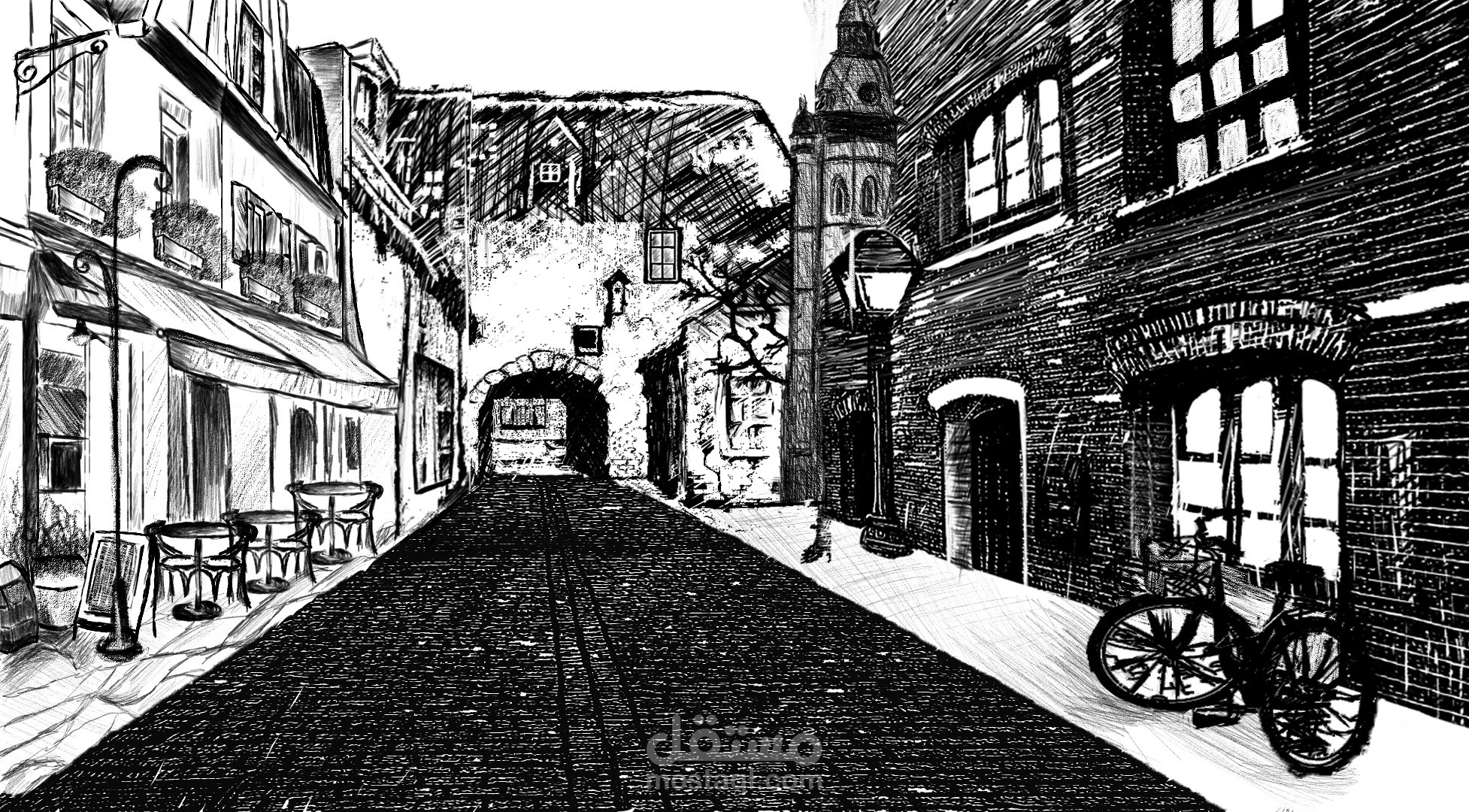 This project transforms a real alley photograph into a fully inked illustration using Photoshop inking brushes. The final artwork blends photo-based inking, hand-drawn ink details, and custom digital textures to achieve a traditional pen-and-ink look similar to classic etching or crosshatching artwork.