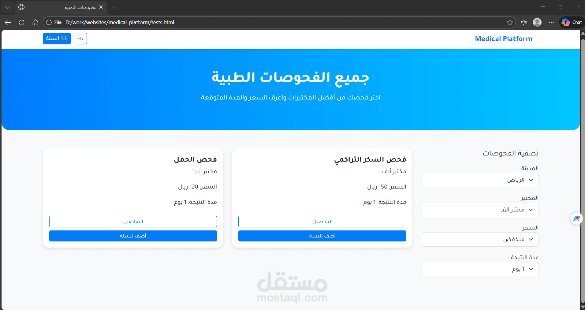 تجميع العيادات والفحوصات الطبية داخل موقع واحد، مع إمكانية تصفح الخدمات، إضافة الفحوصات إلى السلة، واختيار طريقة التواصل أو الحجز بسهولة.