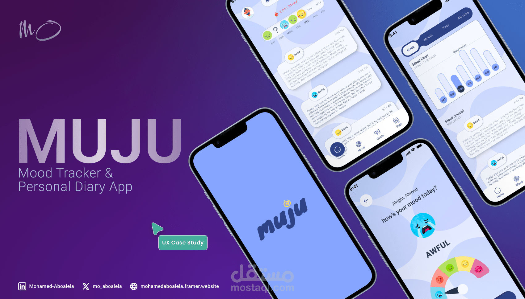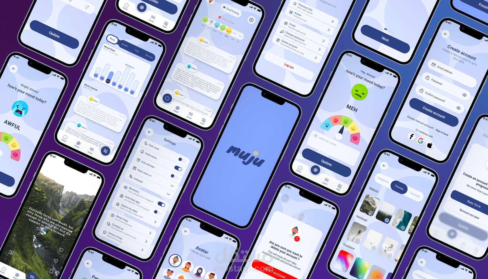 Muju تطبيق بيساعد المستخدمين يسجلوا حالتهم المزاجية، يكتبوا يومياتهم، ويستكشفوا اقتباسات تحفيزية، علشان يفهموا مشاعرهم ويتابعوها مع الوقت.