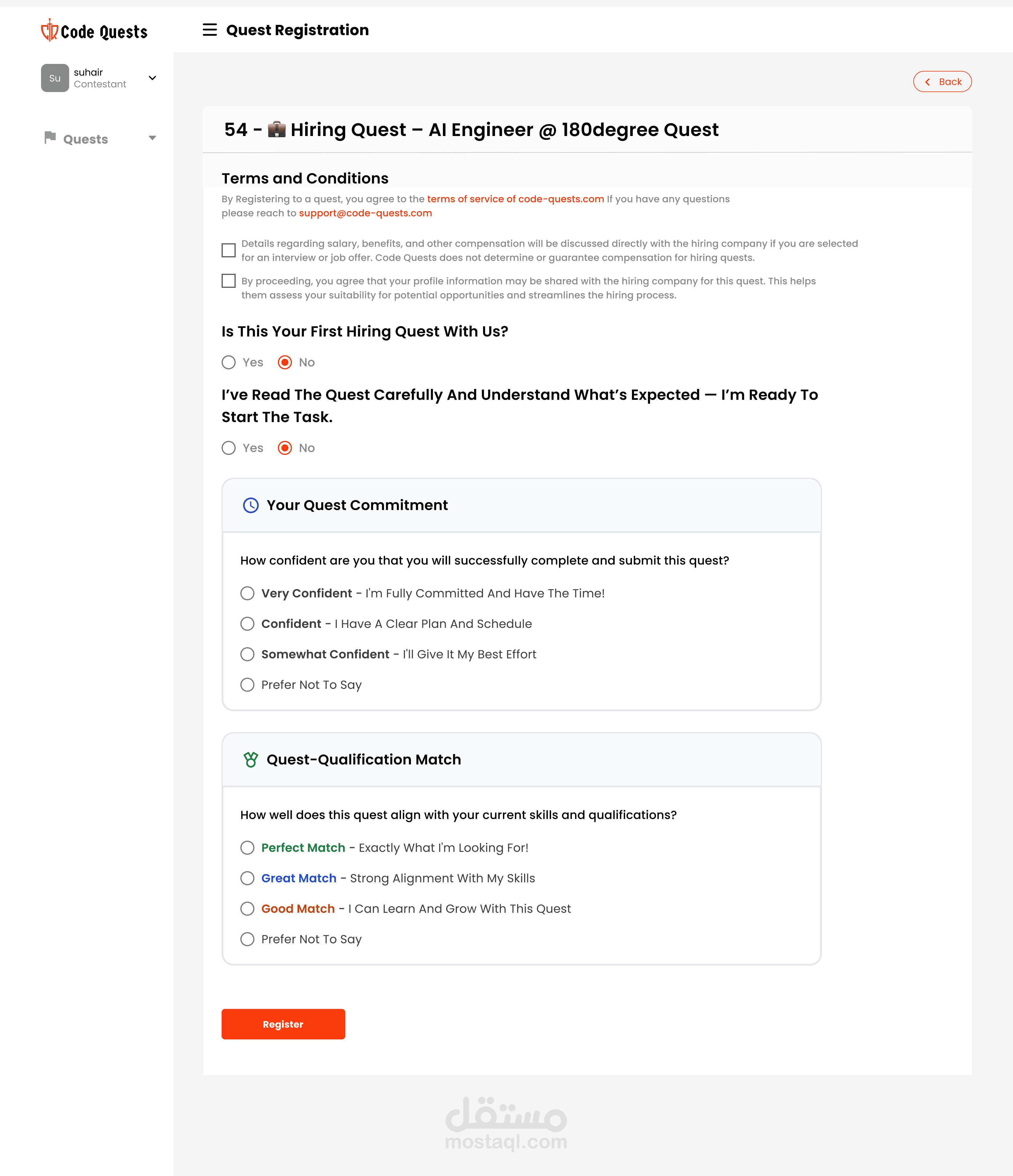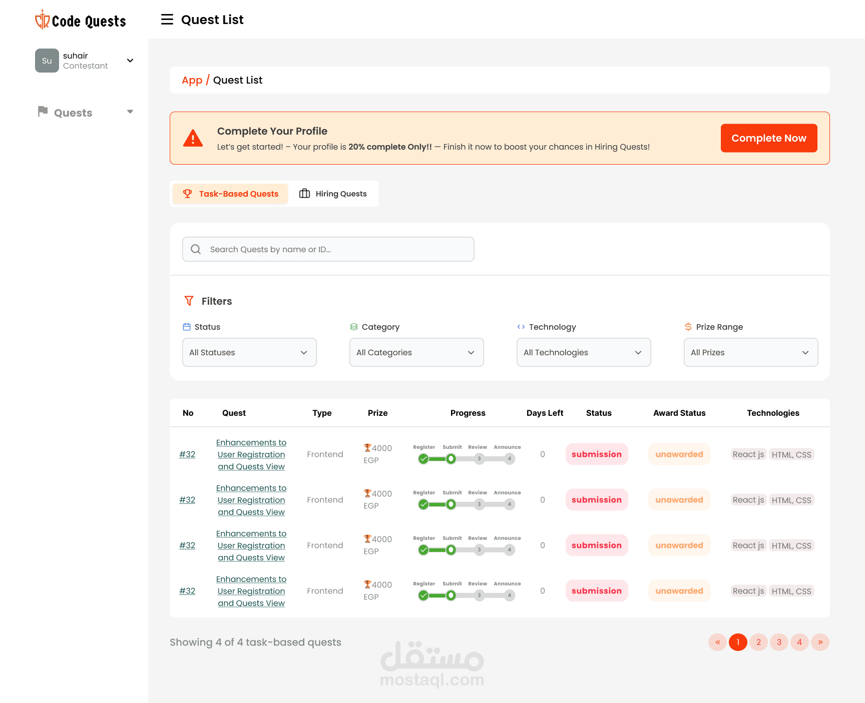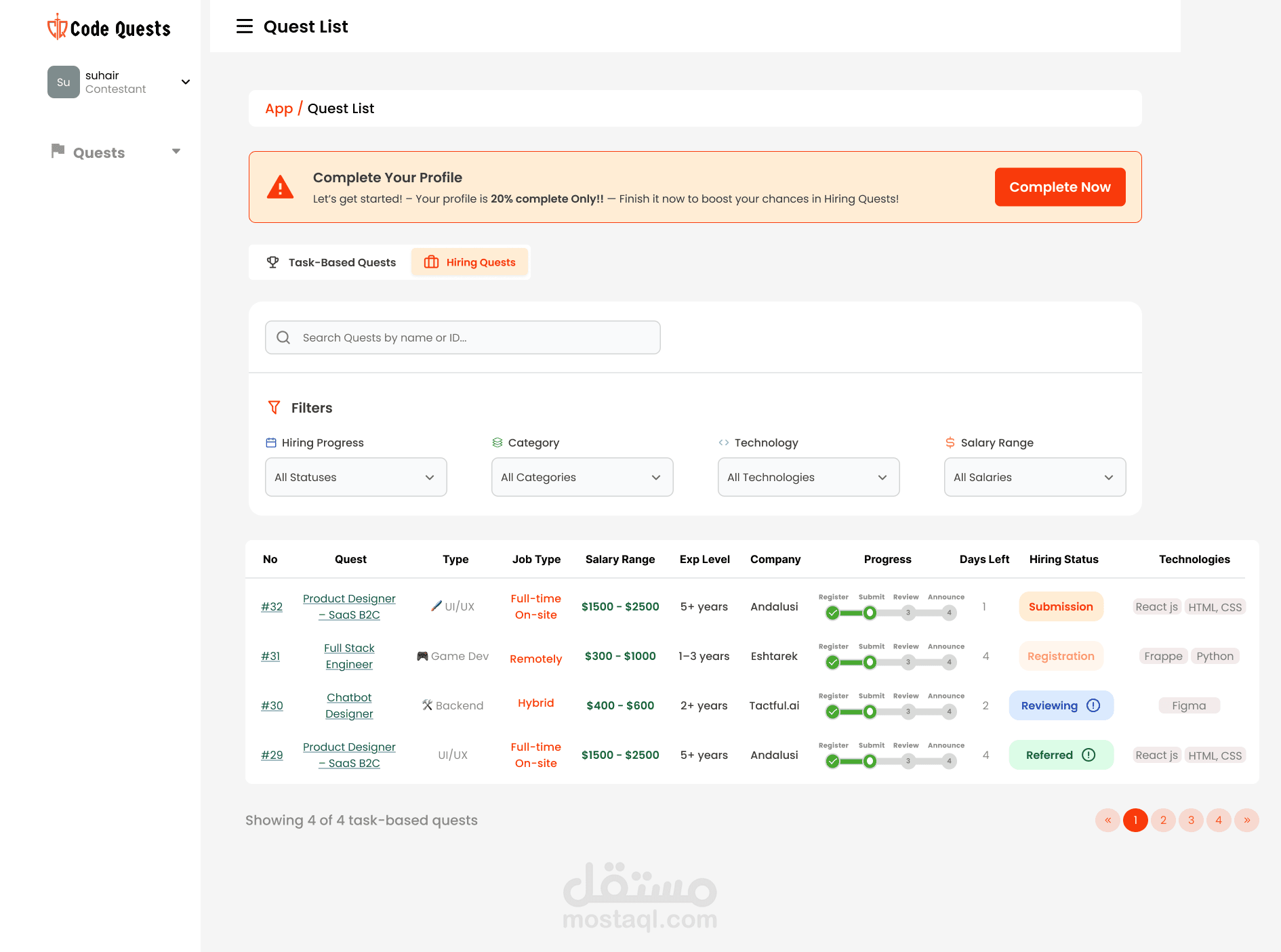 Redesigned the complete Code-Quests user experience, enhancing signup, onboarding, quest listing, quest details, registration, and submission flows. Focused on improving clarity, engagement, and usability while maintaining consistency with the existing design system. Delivered polished, developer-ready UI designs that clearly differentiate between Task-Based and Hiring Quests, ensuring a smoother and more enjoyable experience for all users.