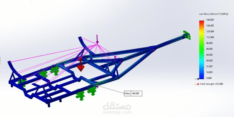 استخدمنا برنامج SolidWorks للتصميم، وأجرينا تحليلًا دقيقًا للإجهاد، واكتشفنا نقاط الضعف، ثم قمنا بتدعيمها لضمان قوة الهيكل ومتانته.