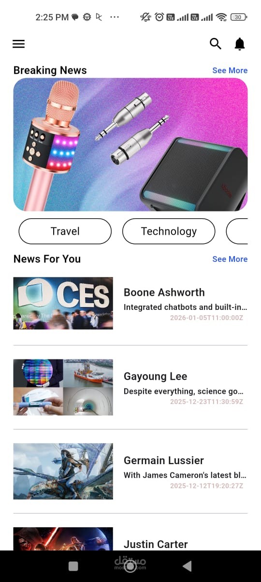 تطبيق أخبار بسيط وأنيق مبني باستخدام Flutter، يعتمد على BLoC / Cubit لإدارة الحالة، مع تكامل كامل مع REST API لعرض آخر الأخبار بشكل ديناميكي وسلس.