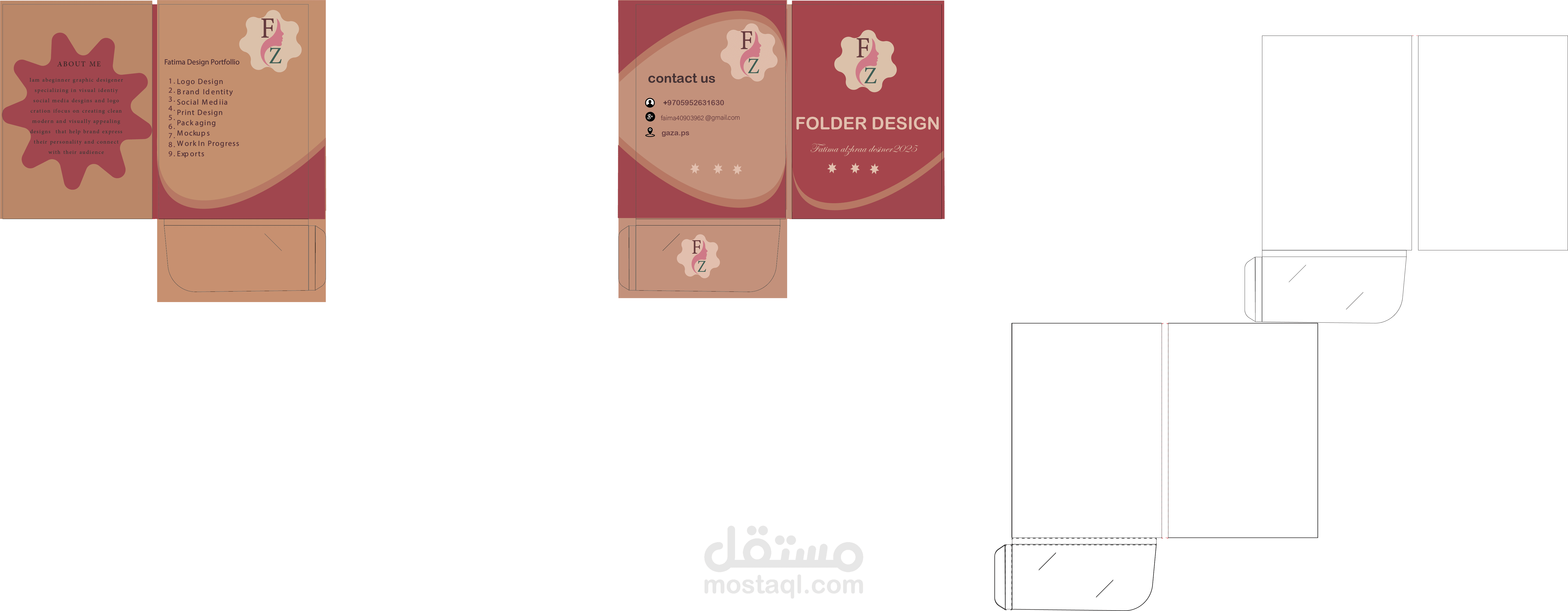تصميم ملف (Folder Design) أنيق مخصص لبورتفوليو مصممة جرافيك، يعتمد على هوية بصرية دافئة تجمع بين درجات الأحمر والخوخي مع لمسات ناعمة وانسيابية.