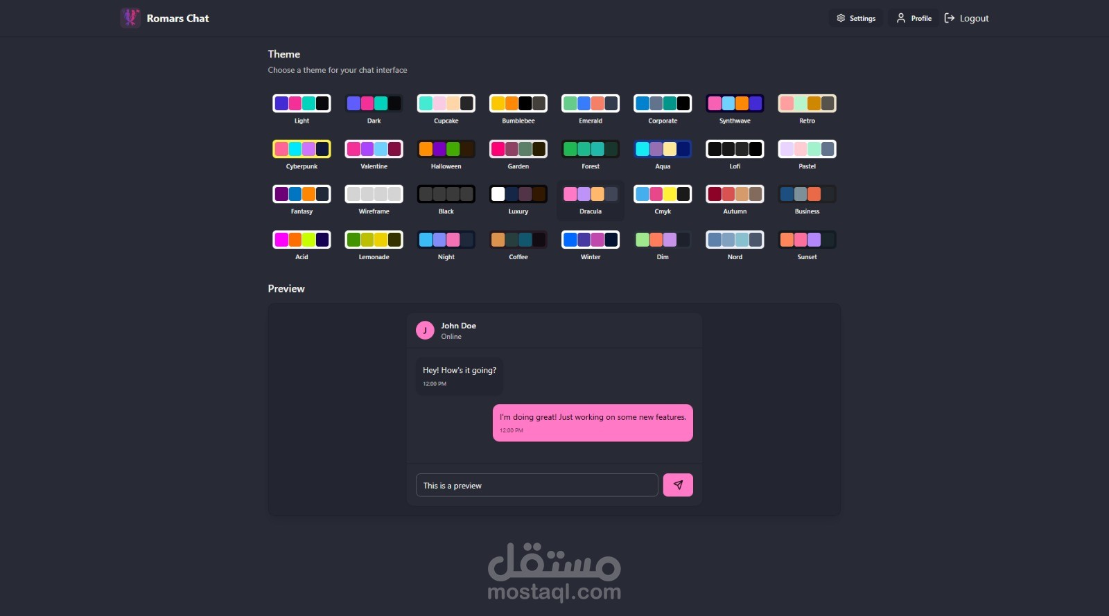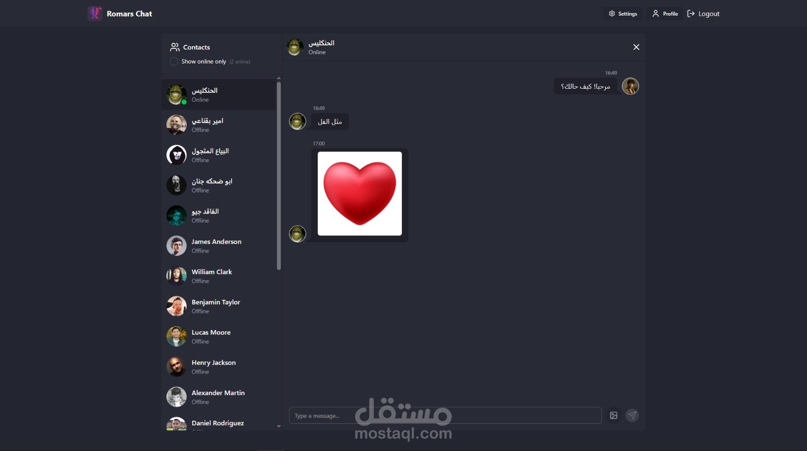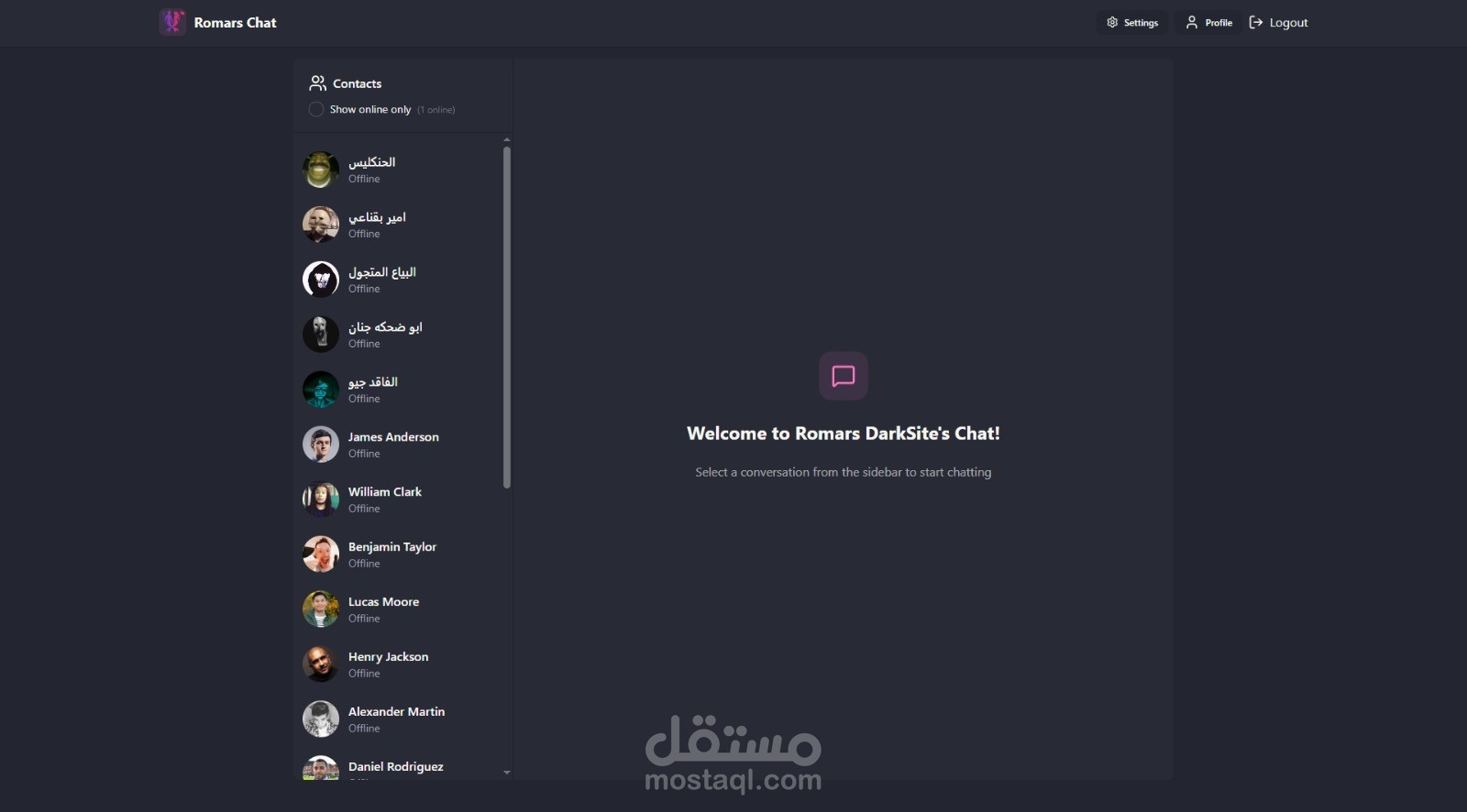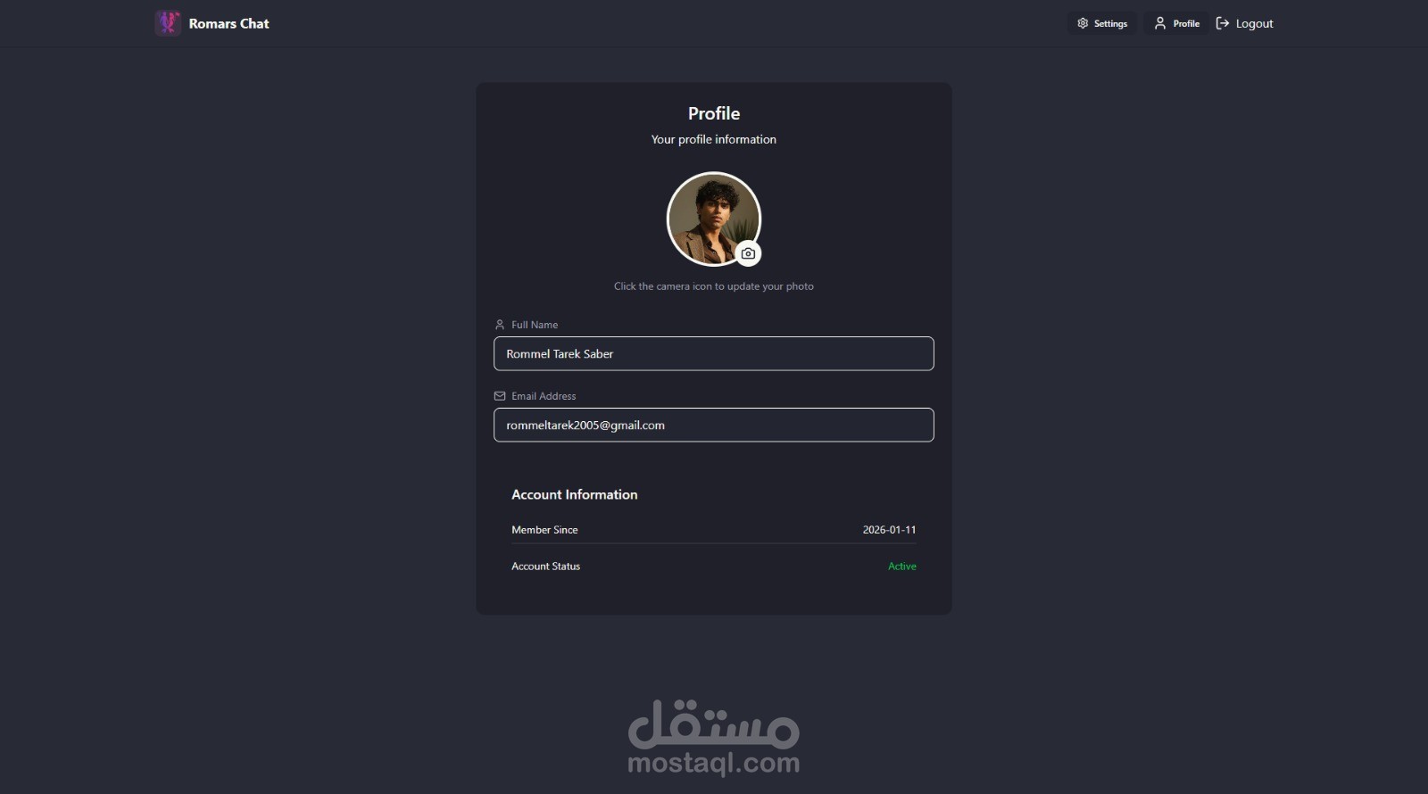 Romars Chat هو تطبيق دردشة فوري (Real‑Time Chat App) مبني بـ MERN Stack، يوفّر تجربة محادثة حديثة بين المستخدمين مع واجهة داكنة أنيقة وتجربة استخدام قريبة من تطبيقات الشات الاحترافية.