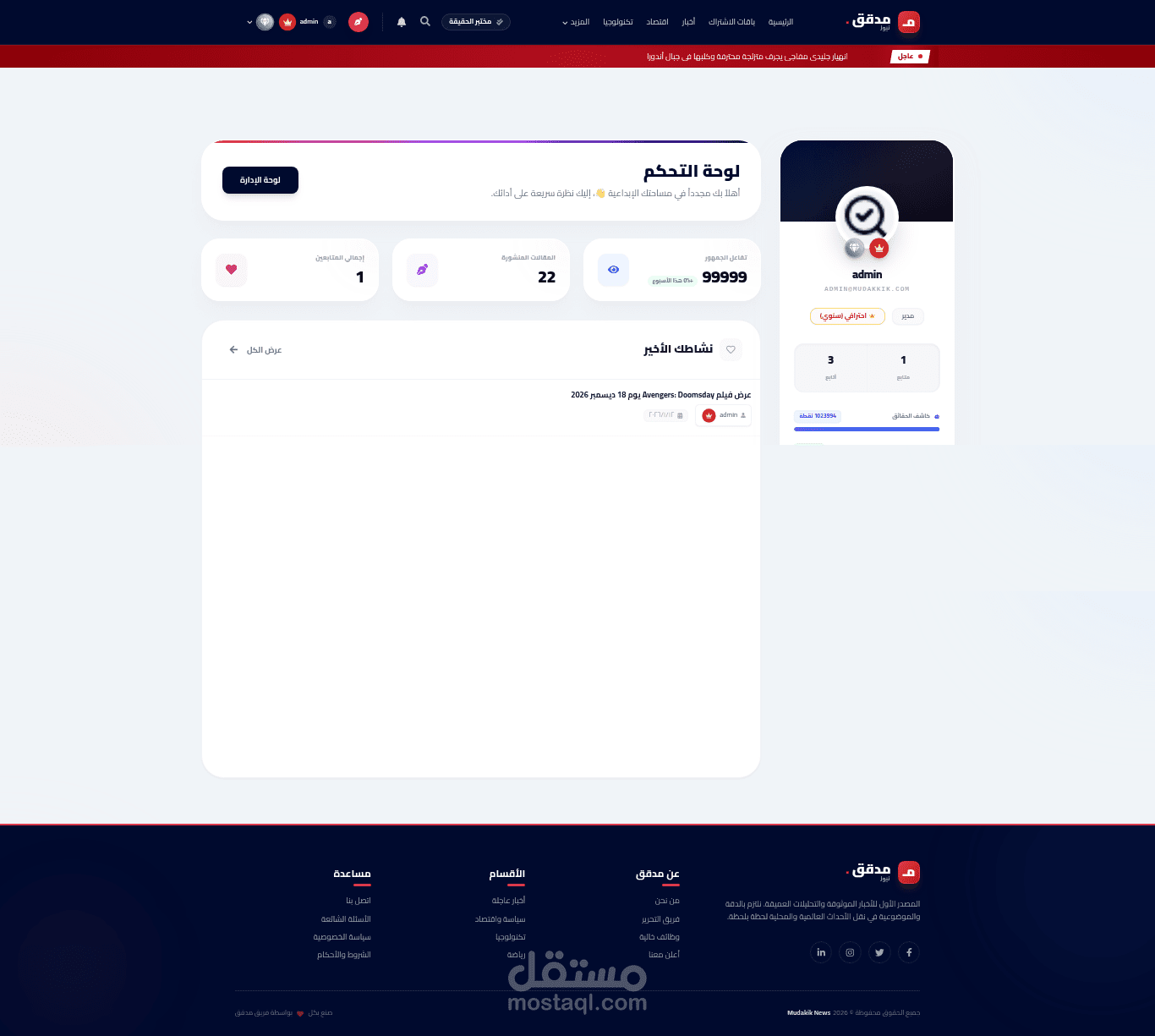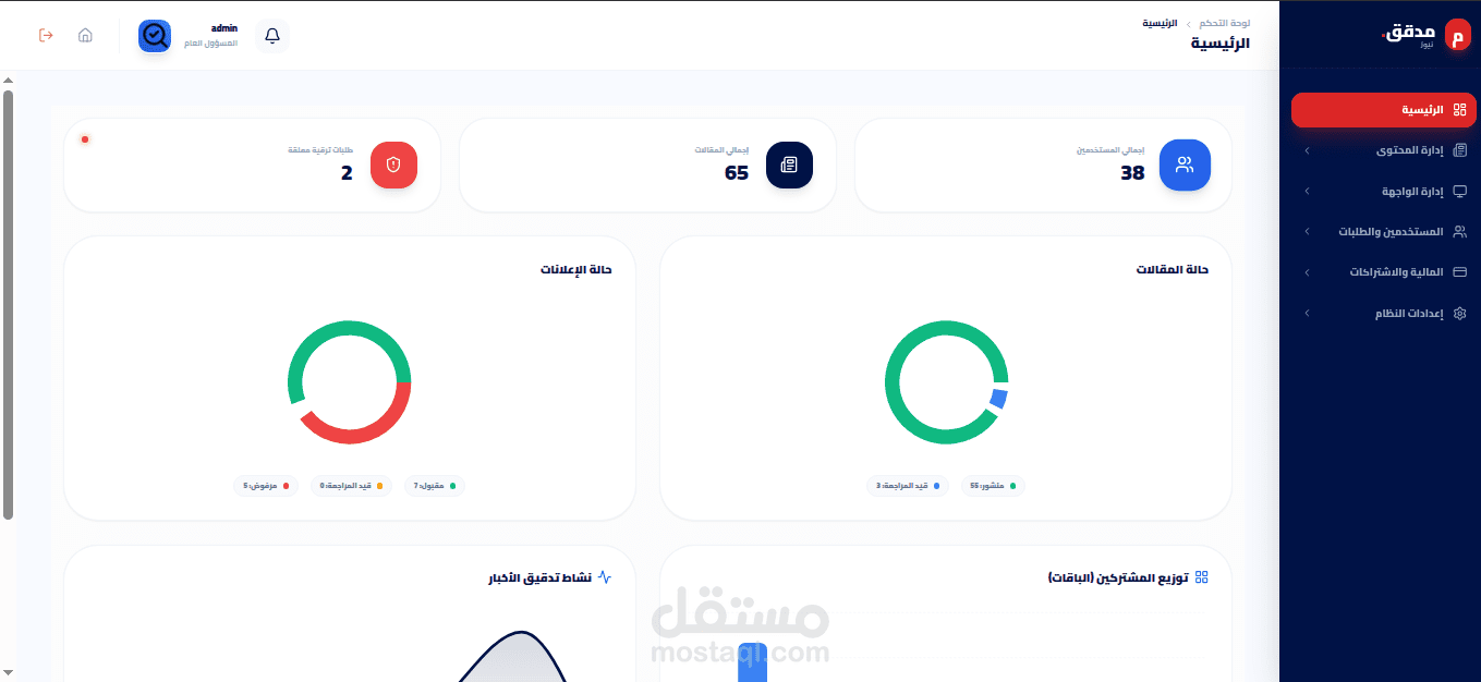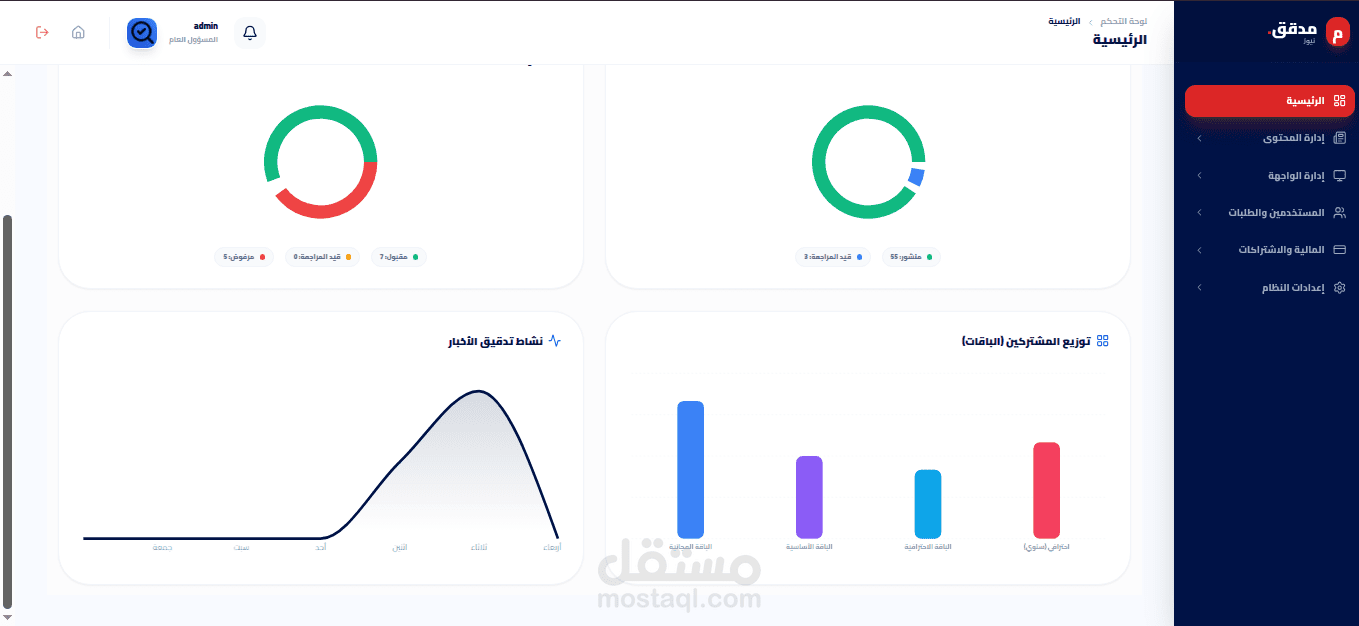 تطوير لوحة تحكم الإدارة: أنشأت أجزاء مهمة من لوحة تحكم المشرفين، لتسهيل إدارة المستخدمين، مراقبة المحتوى، وتتبع الاشتراكات.