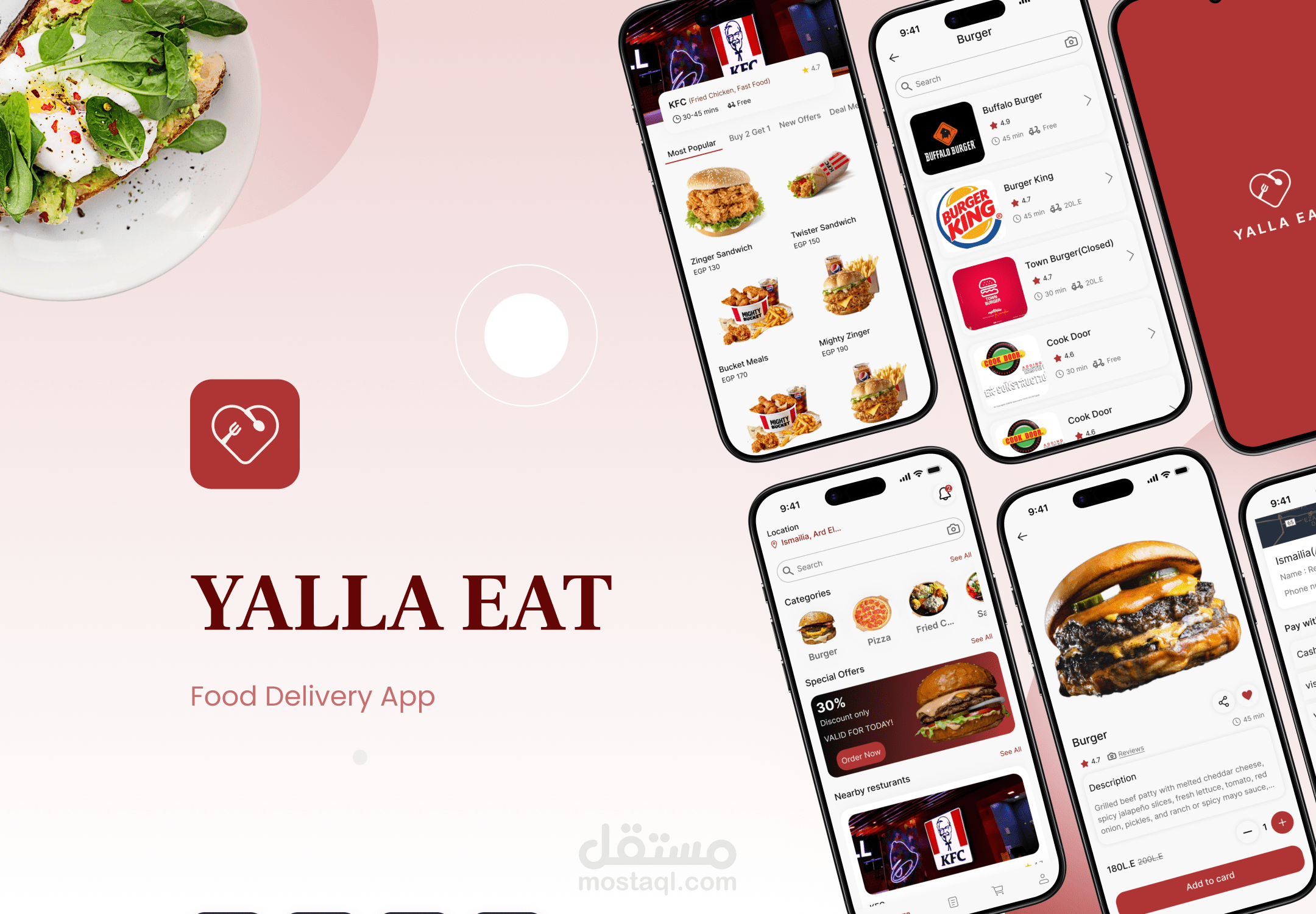 صميم واجهات تطبيق موبايل خاص بخدمة توصيل الطعام، يركز على سهولة الاستخدام وسرعة الوصول للمطاعم والوجبات.