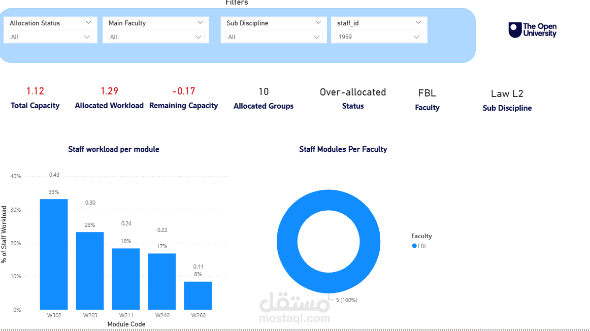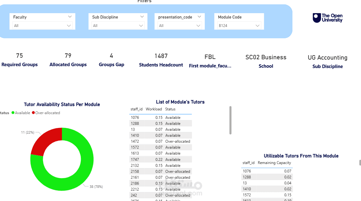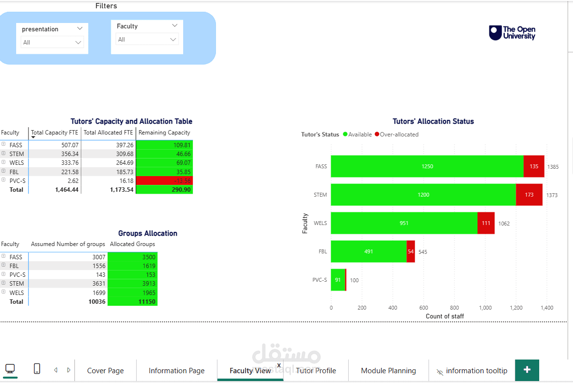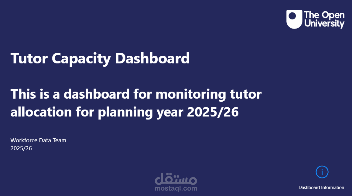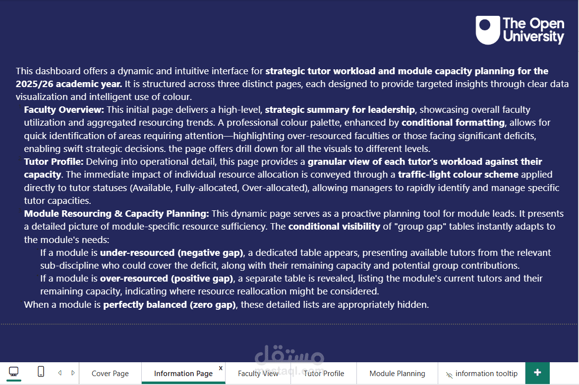 This dashboard offers a dynamic and intuitive interface for strategic tutor workload and module capacity planning for the 2025/26 academic year. It is structured across three distinct pages, each designed to provide targeted insights through clear data visualization and intelligent use of colour.