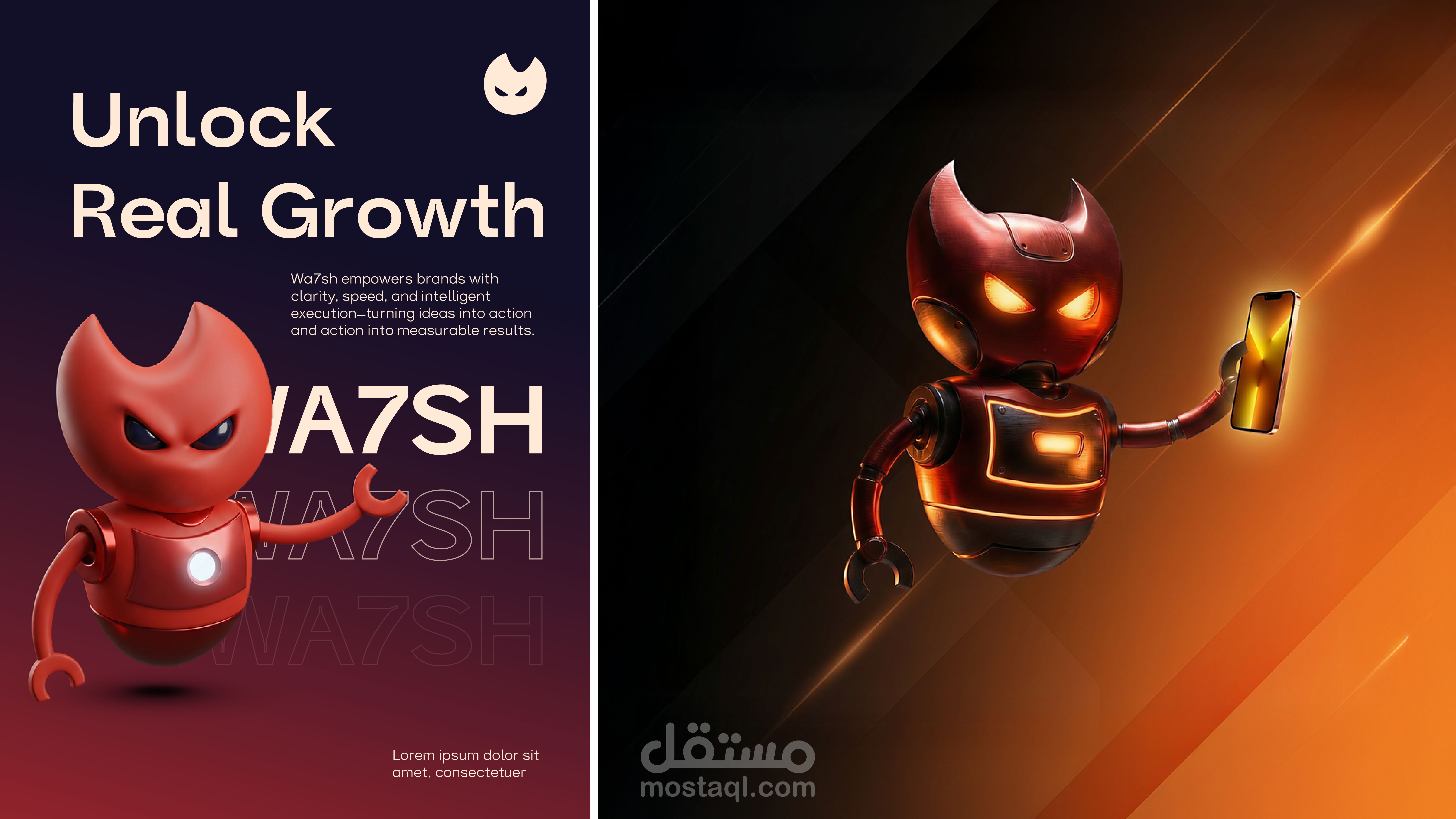 تم تصميم هذا المشروع لبراند وحش، وهو نظام ذكاء اصطناعي عربي يهدف إلى مساعدة الشركات والعلامات التجارية على التنفيذ السريع وتحقيق نتائج حقيقية. تمثّل التحدي الرئيسي في ترجمة القوة والذكاء والسرعة إلى هوية بصرية واضحة دون تعقيد أو ازدحام بصري. اعتمد التصميم على أيقونة قوية، وأسلوب تقني داكن، وهوية عربية حديثة تخاطب أصحاب الأعمال والفرق التسويقية في السوق العربي.