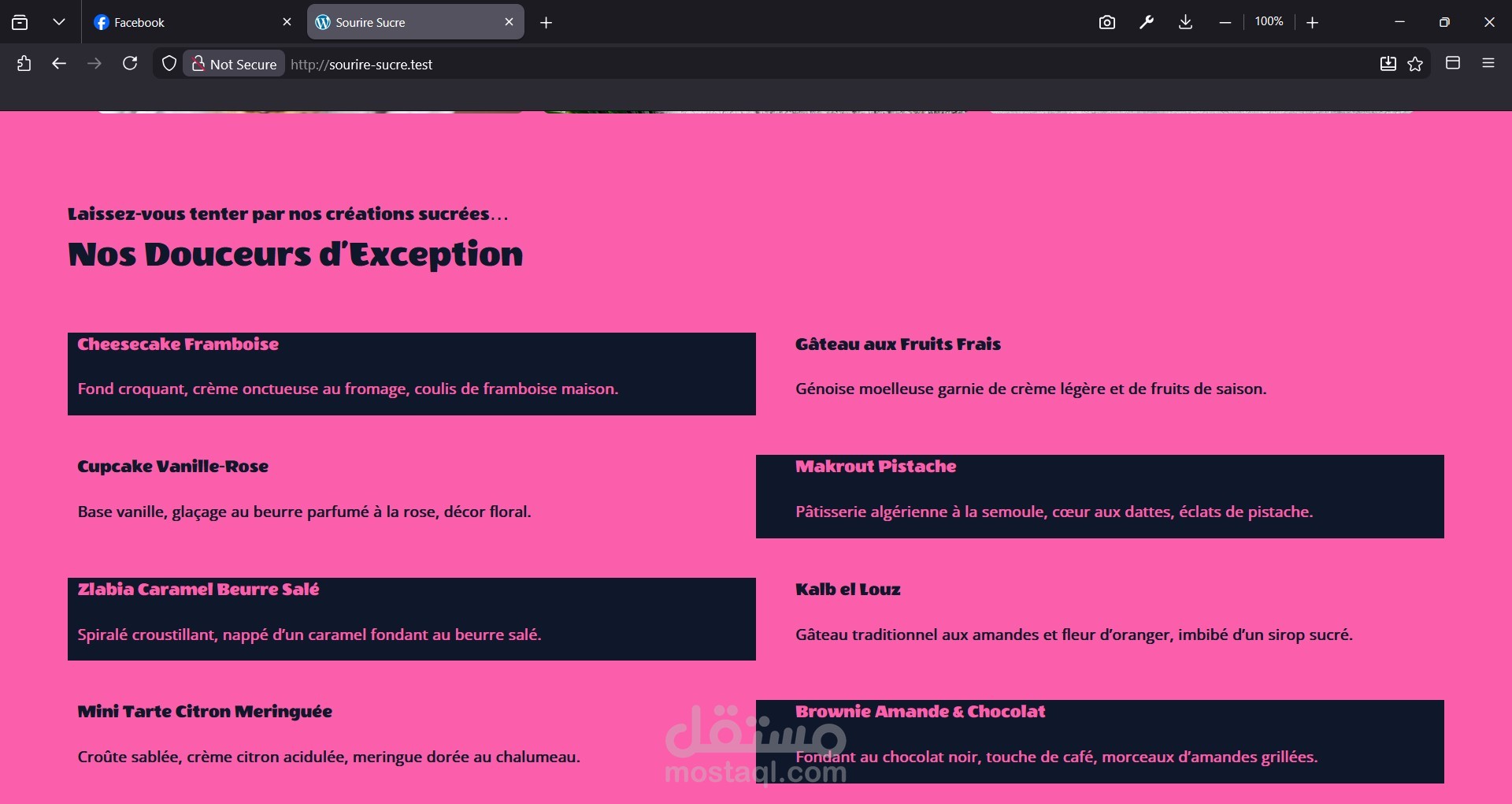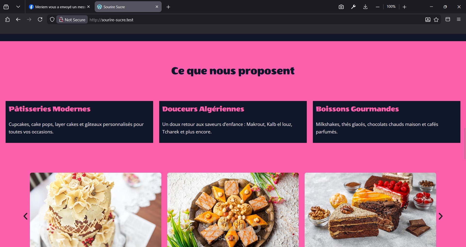تم إنجاز موقع إلكتروني تعريفي لمحل الحلويات Sourire Sucrée باستخدام WordPress، بتصميم أنيق وناعم يعكس طابع الحلويات واللمسة الحلوة للمحل، مع التركيز على سهولة الطلب والتواصل مع الزبائن.