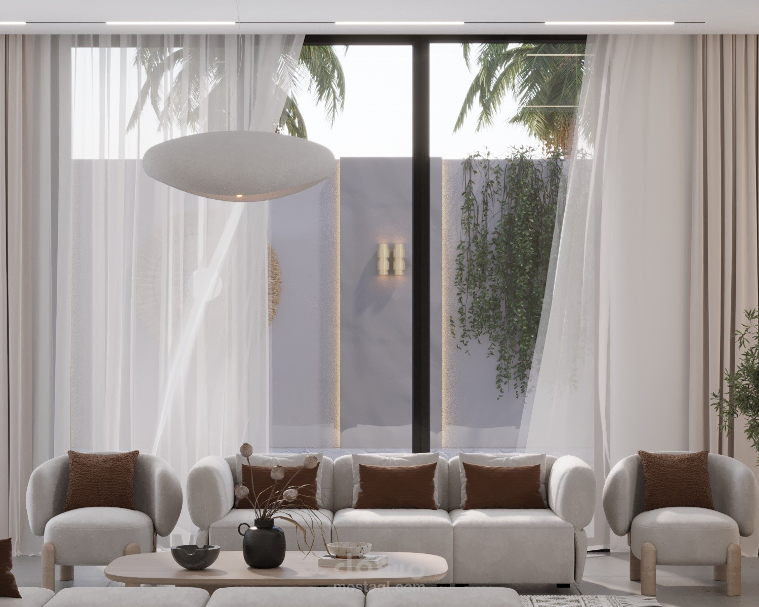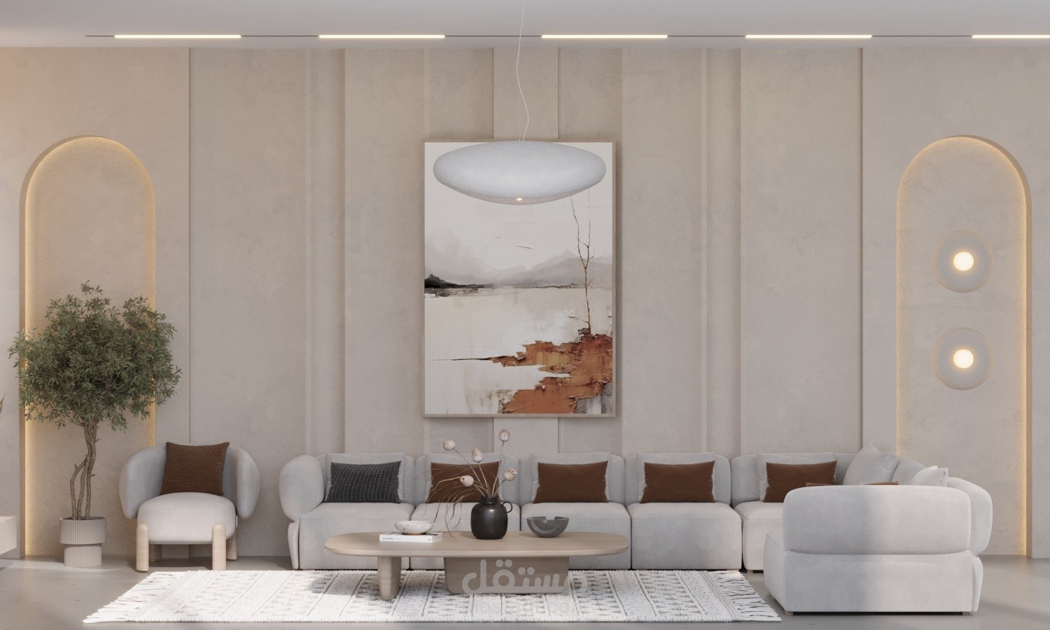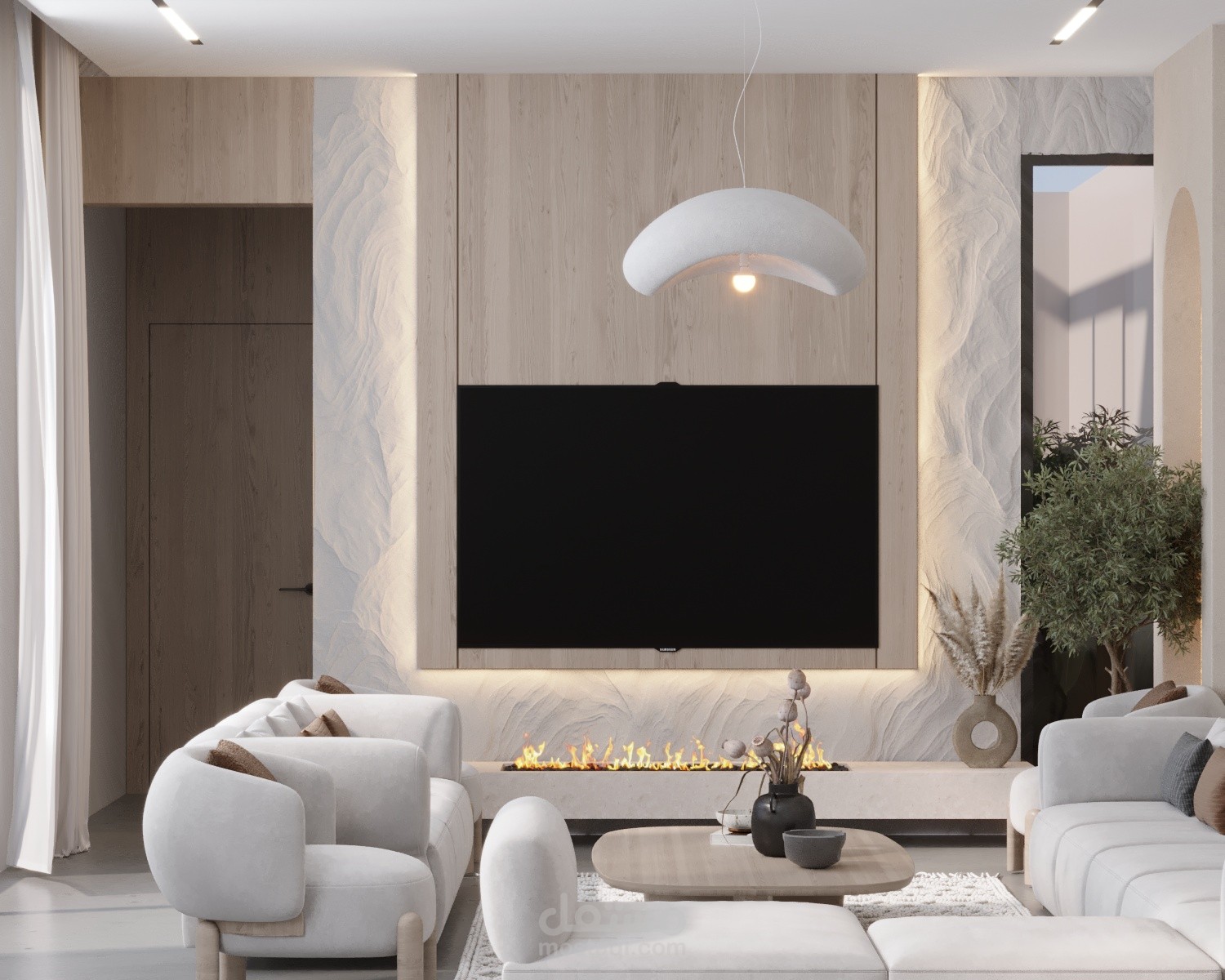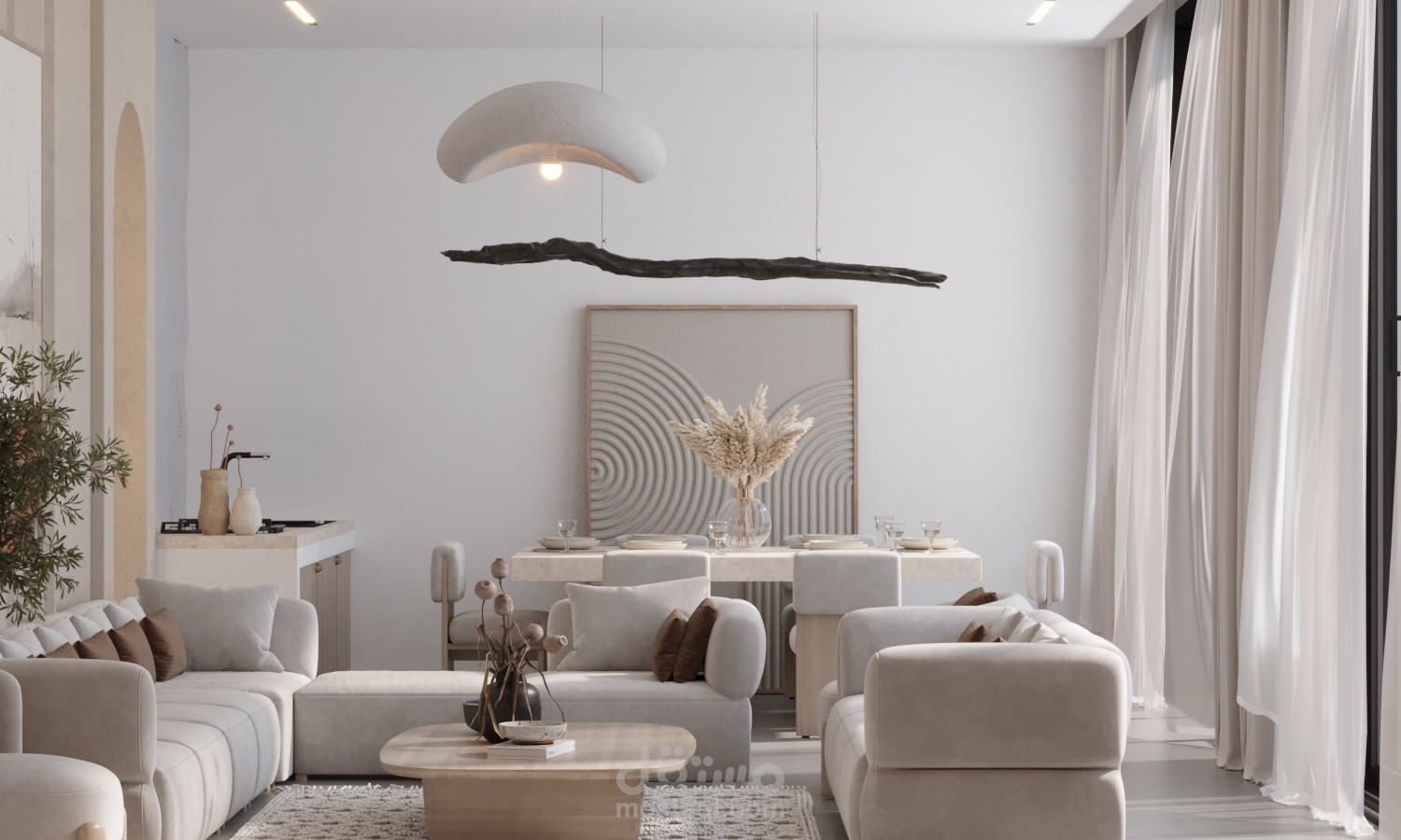 Wabi sabi living room with dining and cold kitchen