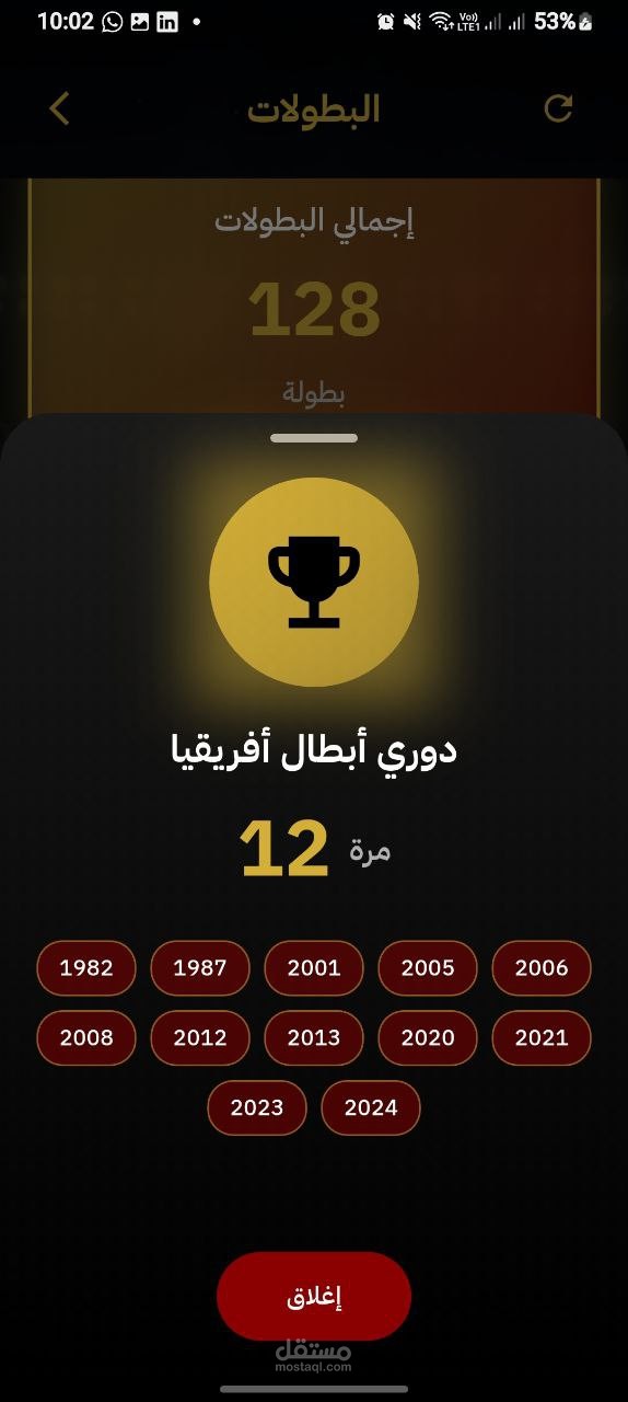 دولاب البطولات (Hall of Fame): أهم جزء في التطبيق، تصميم بيستعرض الـ 128 بطولة بشكل يليق بتاريخ الأهلي، مع تفصيل لعدد بطولات الدوري وأفريقيا.