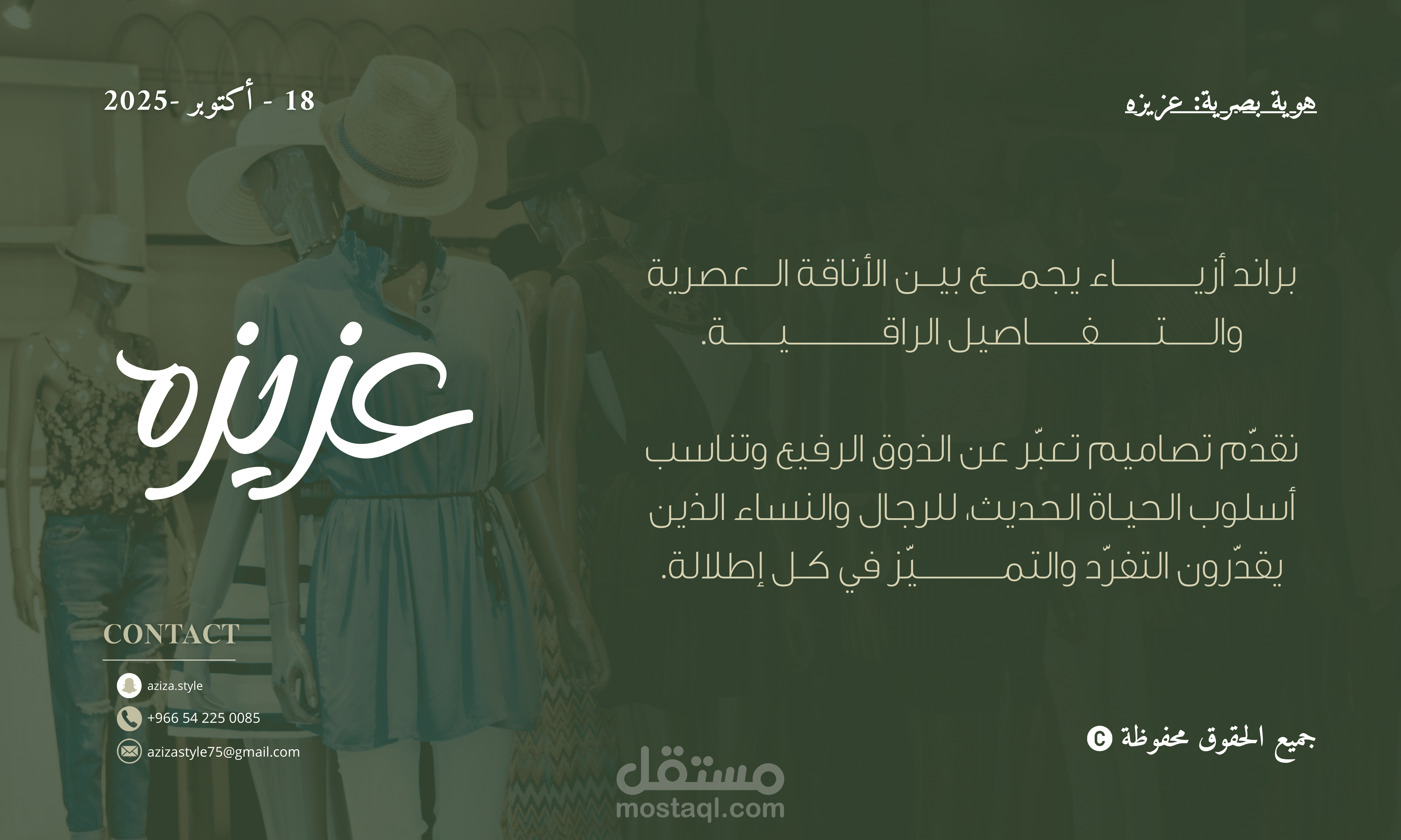 براند عِزّة هو علامة أزياء معاصرة تعبّر عن الكرامة والثقة بالنفس بأسلوب هادئ وغير متكلّف. لا يلاحق الصيحات السريعة، بل يقدّم تصاميم ثابتة تعكس شخصية مستقلة وحضورًا قويًا دون ضجيج. عِزّة ليست للفت الأنظار، بل لمن يعرف قيمته.