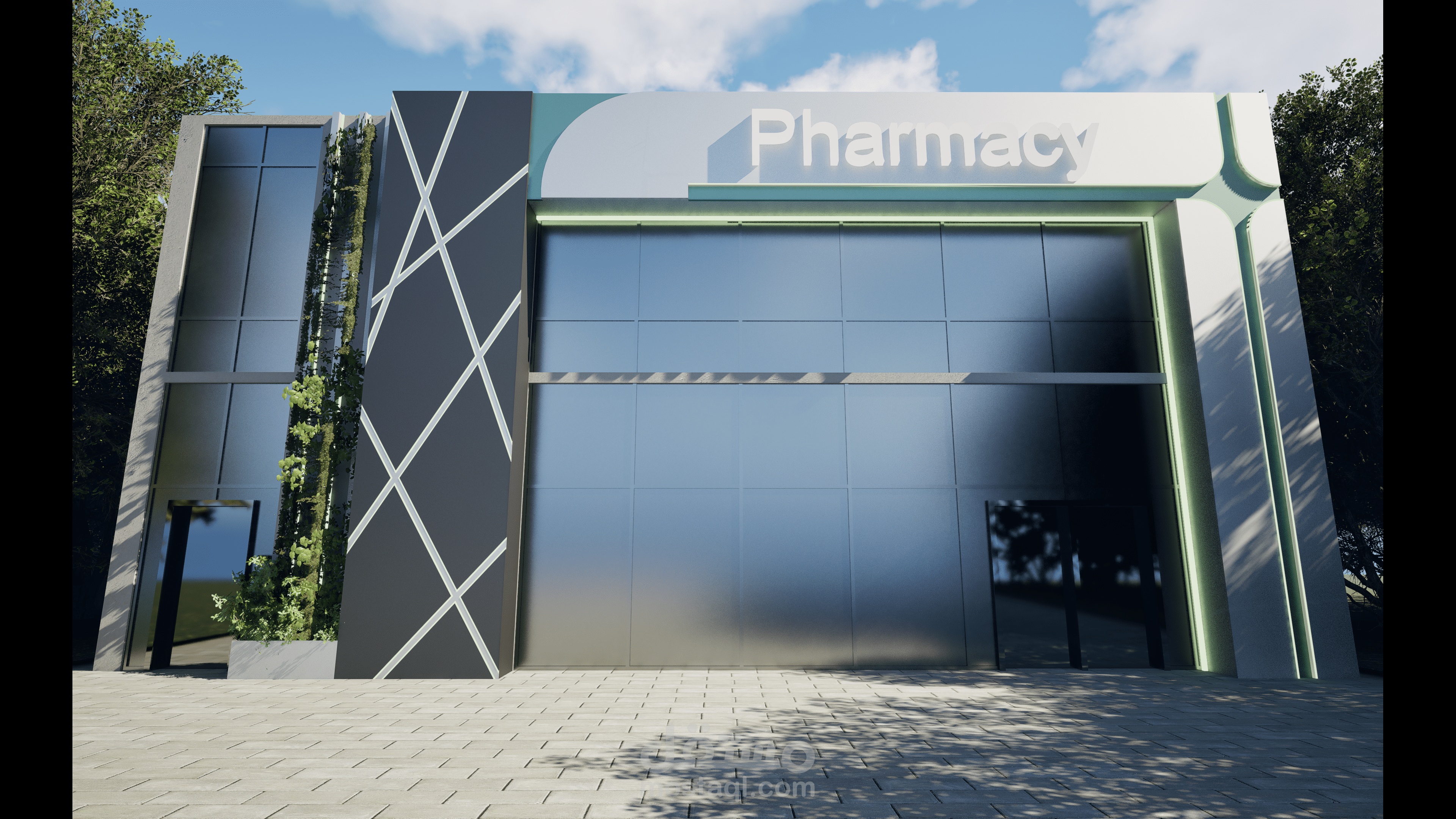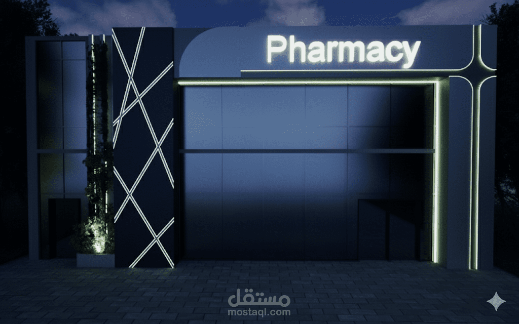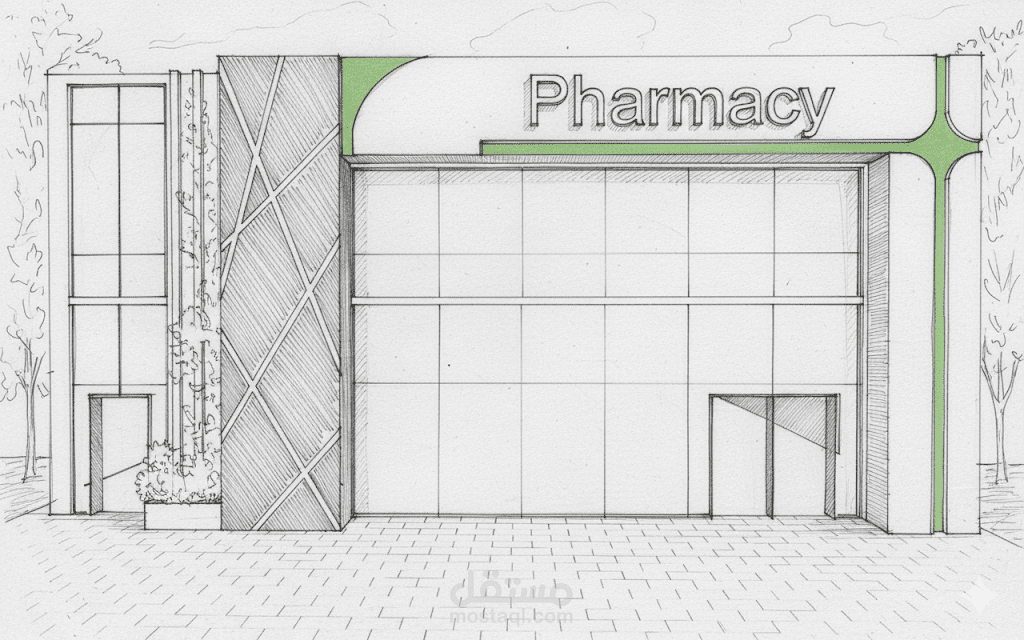تصميم واجهة معمارية لصيدلية و بجانبها مطعم في السعودية