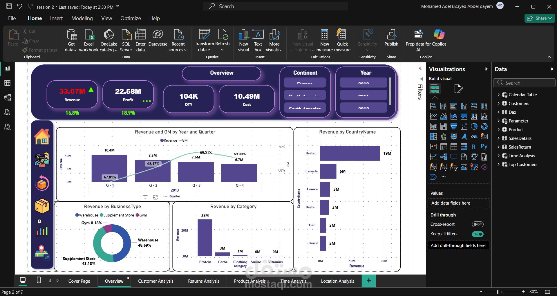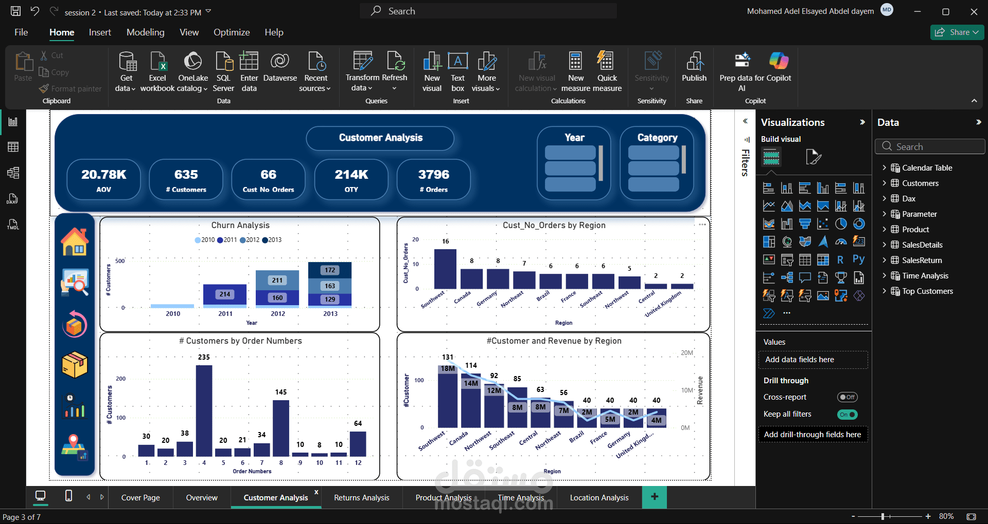 بدأت بتنظيم وهيكلة البيانات باستخدام Data Modeling لضمان سهولة التحليل ودقة النتائج، ثم عملت على تنظيف ومعالجة البيانات الخام باستخدام Power Query لإزالة الأخطاء وتوحيد الصيغ. بعد ذلك استخدمت DAX لإنشاء مؤشرات أداء رئيسية (KPIs) وحسابات تساعد في استخراج رؤى واضحة حول المبيعات والأداء. وفي النهاية قمت ببناء لوحات تحكم تفاعلية توضح حركة المبيعات والاتجاهات بشكل بصري وسهل الفهم.