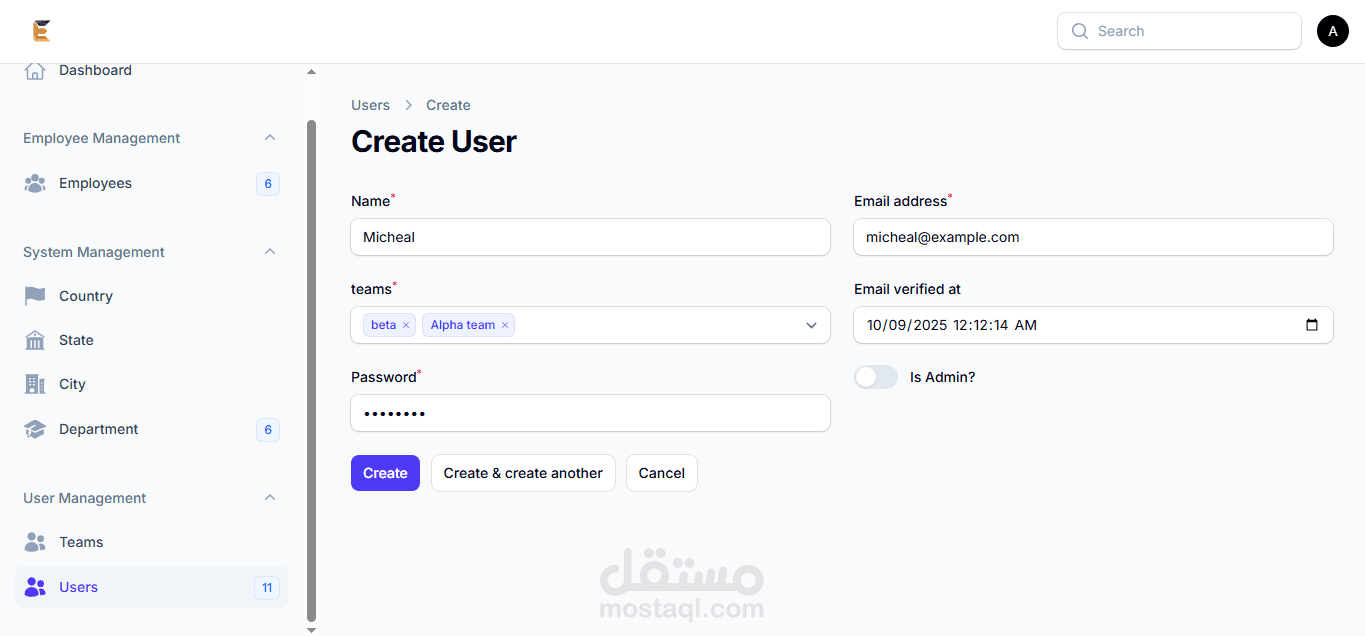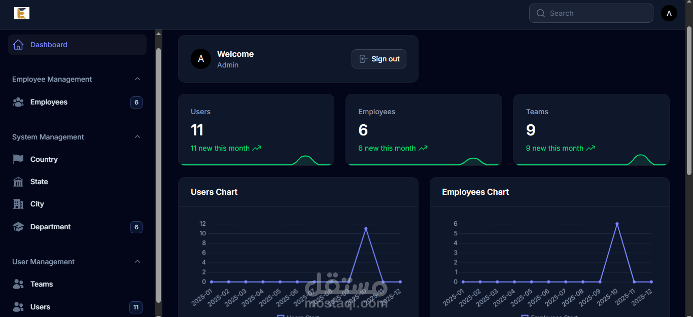 نظام إدارة احترافي متعدد المستأجرين مبني باستخدام Laravel 12 و Filament v4. يتميز بلوحة تحكم إدارية شاملة ولوحة تطبيق منفصلة، مما يتيح إدارة مركزية للدول، الولايات، المدن، الأقسام، الموظفين، والمستخدمين. يدعم النظام تعدد المستأجرين، حيث يمكن للمسؤولين إنشاء فرق عمل، تعيين المستخدمين، وإدارة موارد خاصة بكل فريق. توفر لوحات التحكم المتقدمة إحصائيات ورسوم بيانية شاملة للموظفين والأقسام والمستخدمين. كل مورد يتضمن وظيفة البحث والإدارة العلائقية للتعامل الفعال مع البيانات.