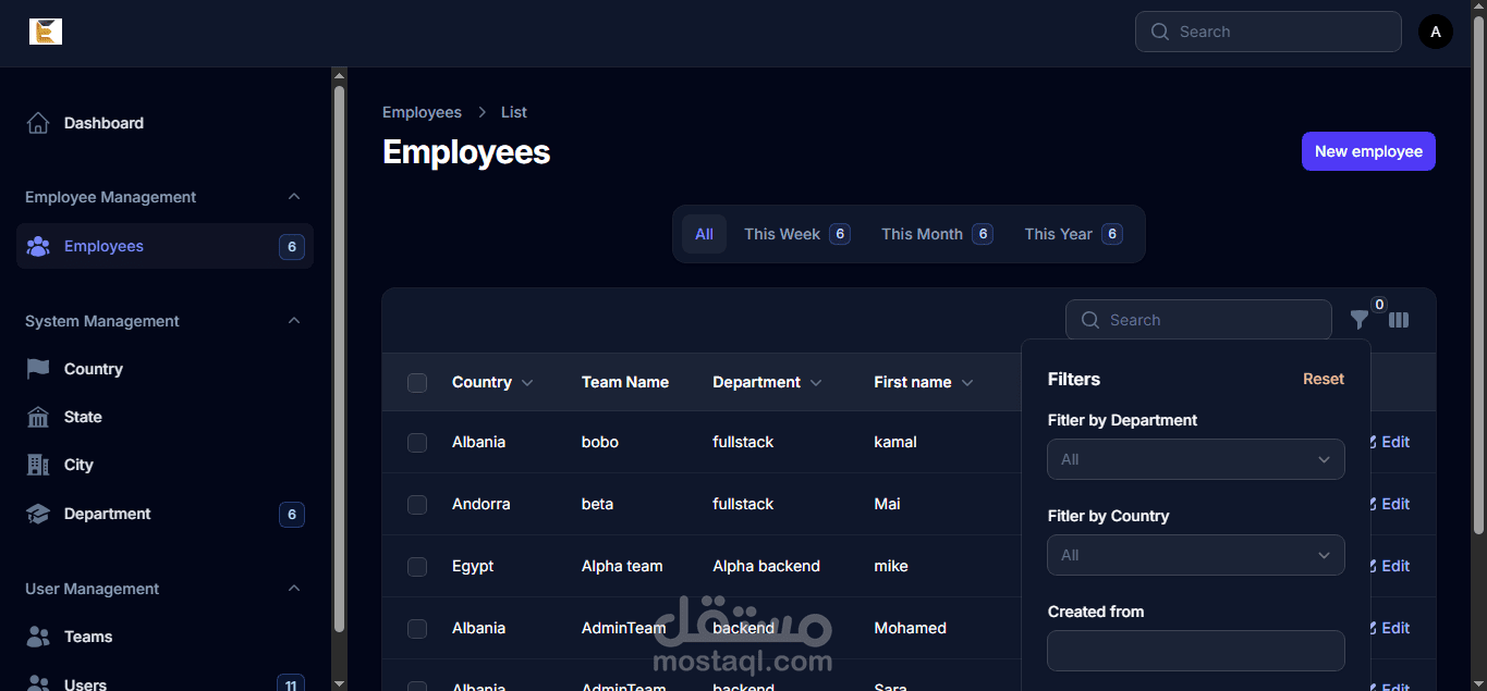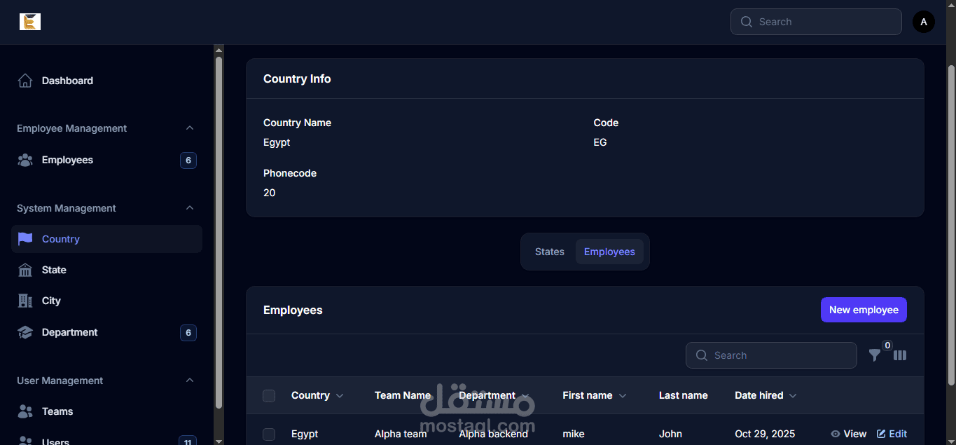 عمليات CRUD كاملة للدول، الولايات، المدن، الأقسام، الموظفين، والمستخدمين
