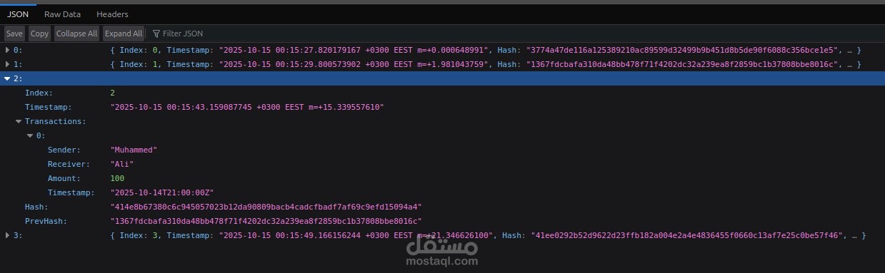 * Blockchain prototype built in Go مع RESTful APIs لإدارة البلوكات: block creation, retrieval, وvalidation.