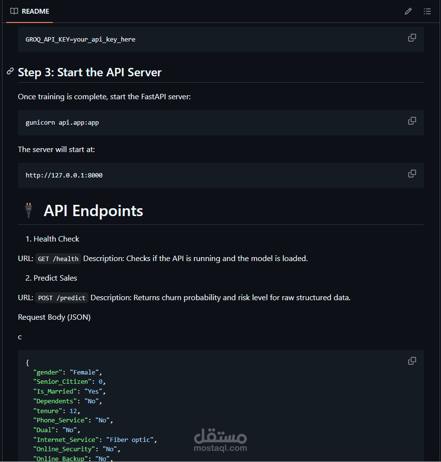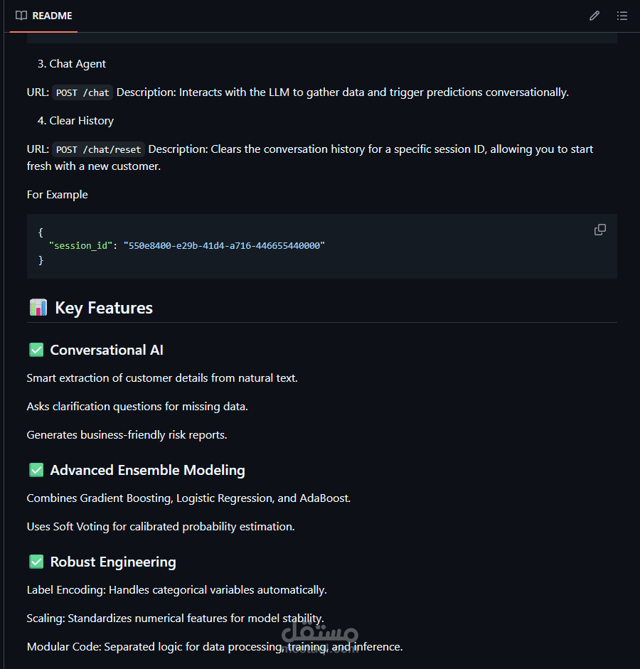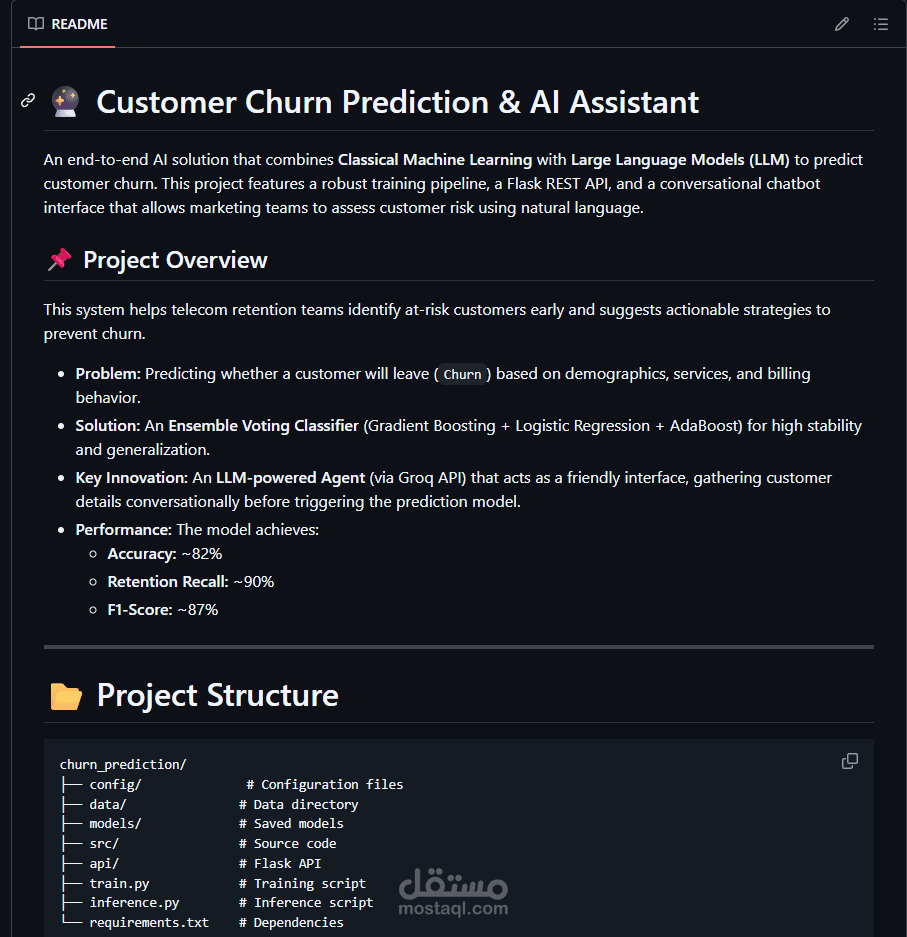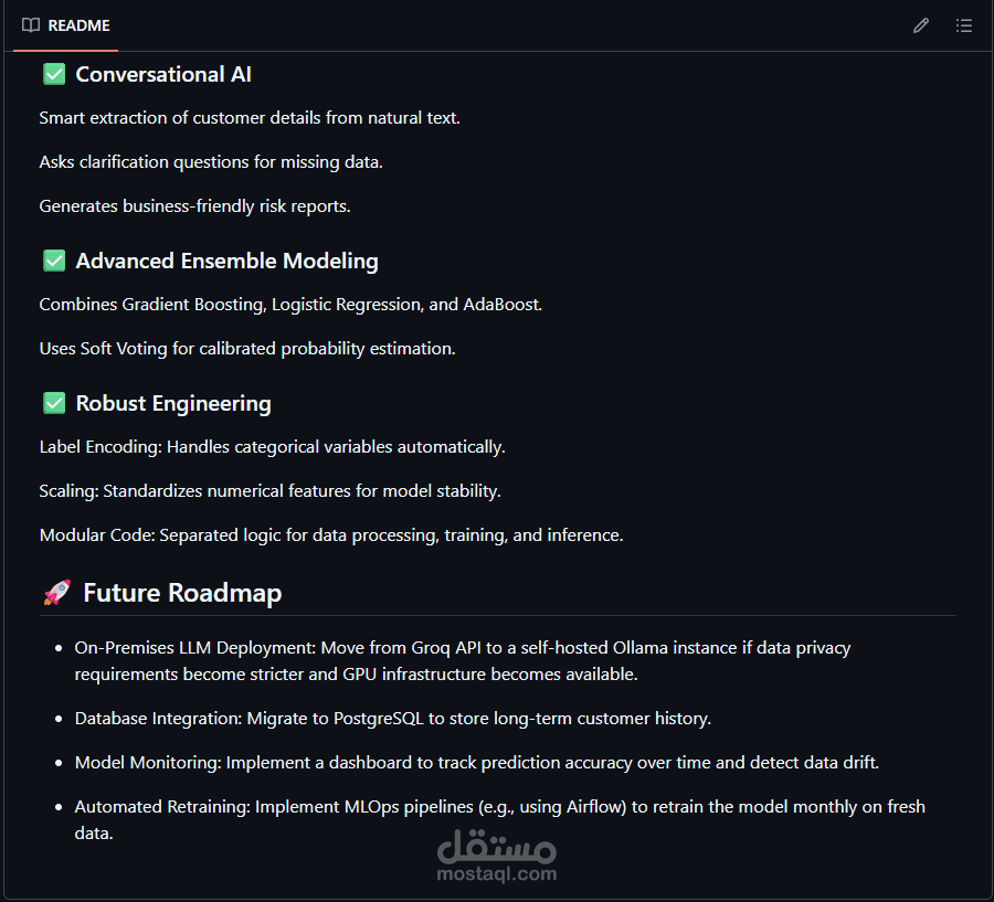 Key Innovation: دمج LLM Agent (via Groq API) ليعمل كـ conversational layer يجمع بيانات العميل بأسلوب بشري قبل تشغيل نموذج التنبؤ