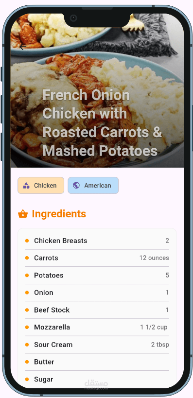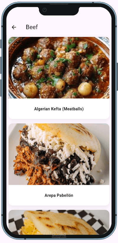 فكرة التطبيق: التطبيق يعرض أصناف الطعام والوصفات بشكل جذاب، مع إمكانية الدخول للتفاصيل ومعرفة المكونات وطريقة التحضير. يعتمد التطبيق على API خارجي (TheMealDB).