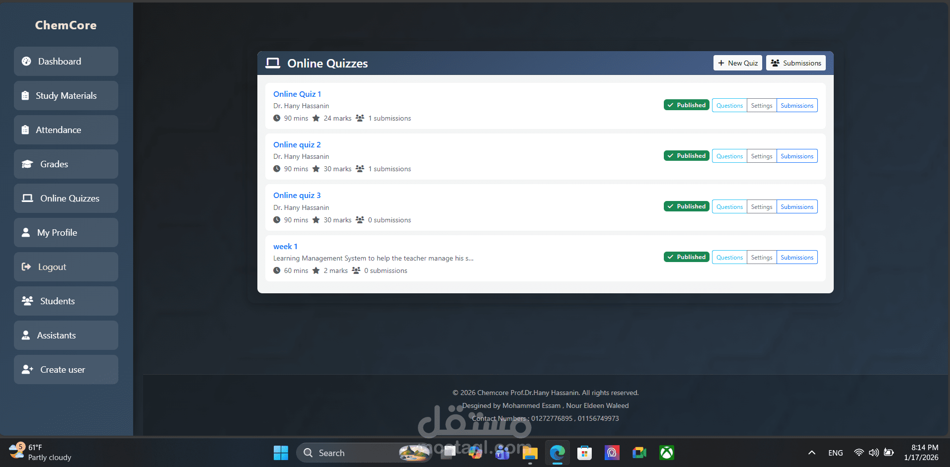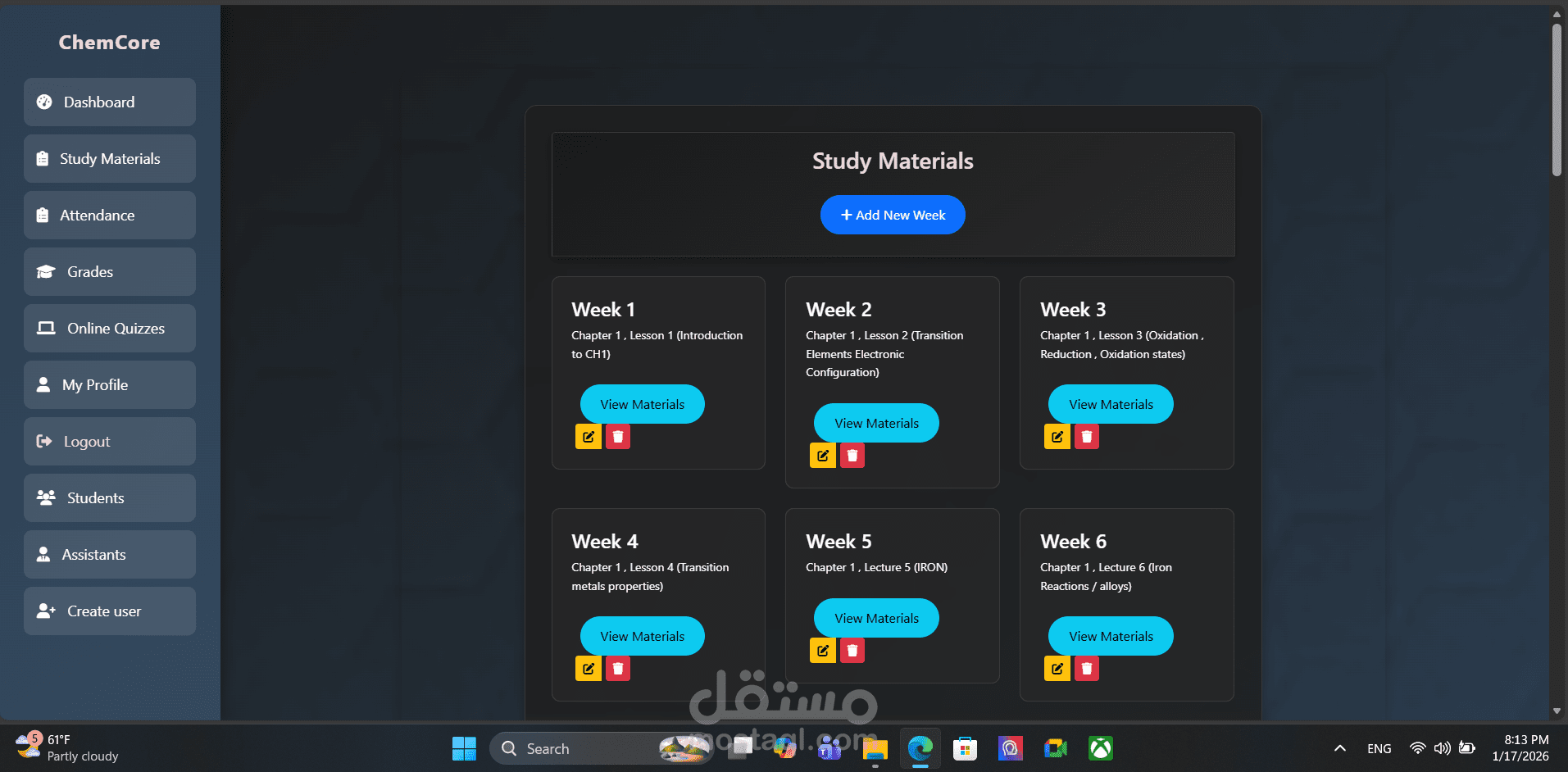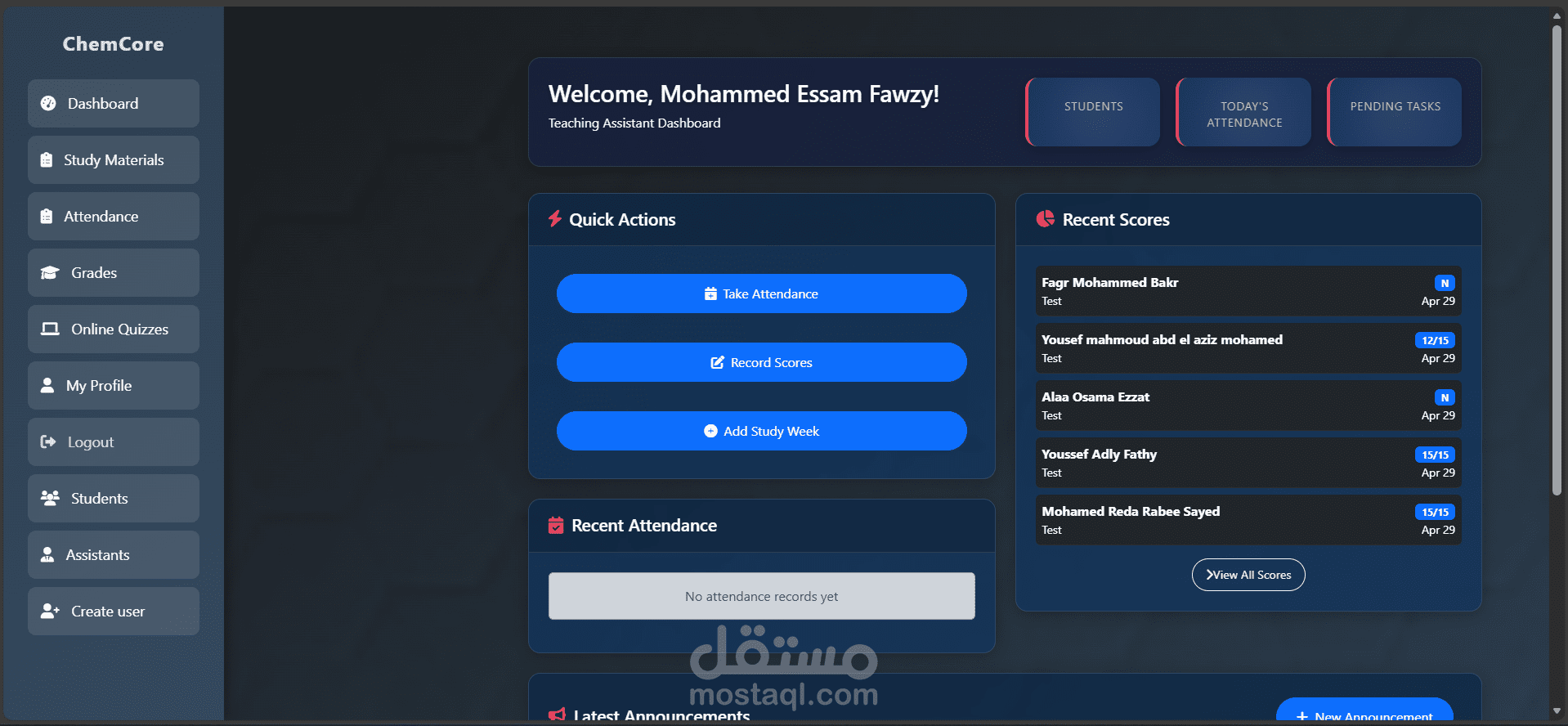 ChemCore is a learning management system made for one teacher that he can add his students , assistants , upload the materials , Track their attendance , And make online quizzes , it's a less powerful version of Edutrack