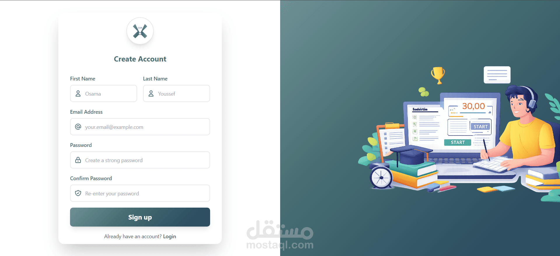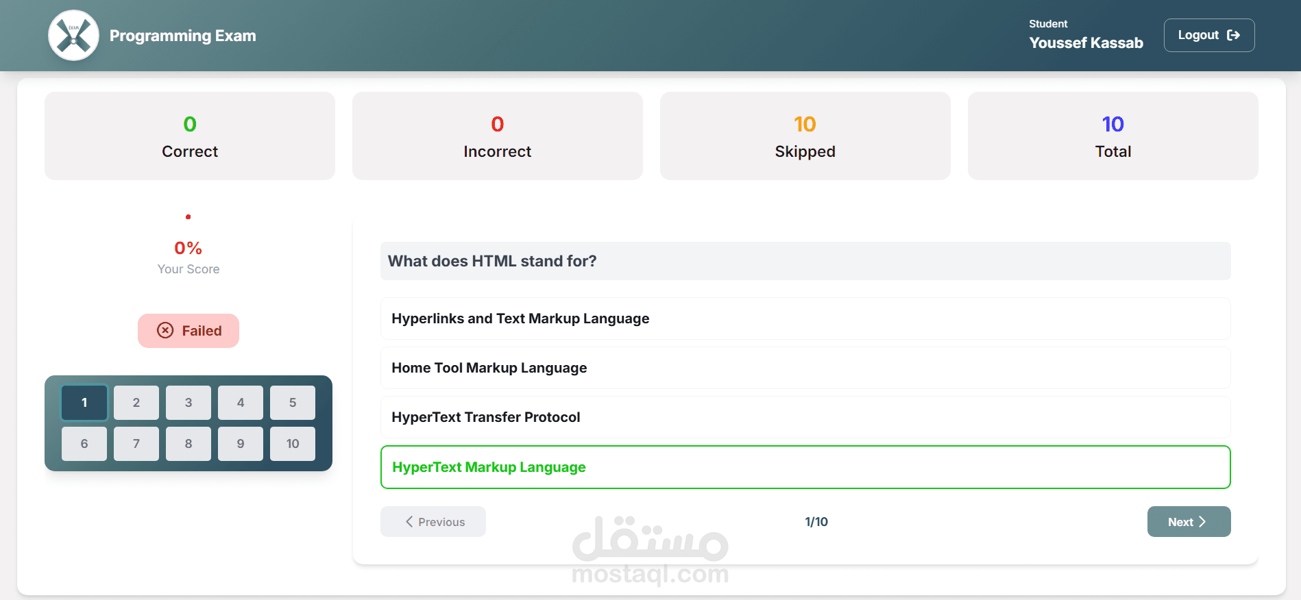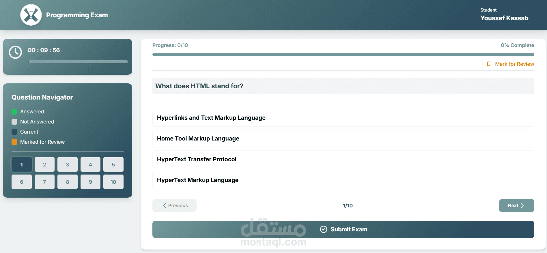 Exam X is a web-based online examination system. The website allows users to take an exam by answering a set of questions within a defined structure and view their results after submission.