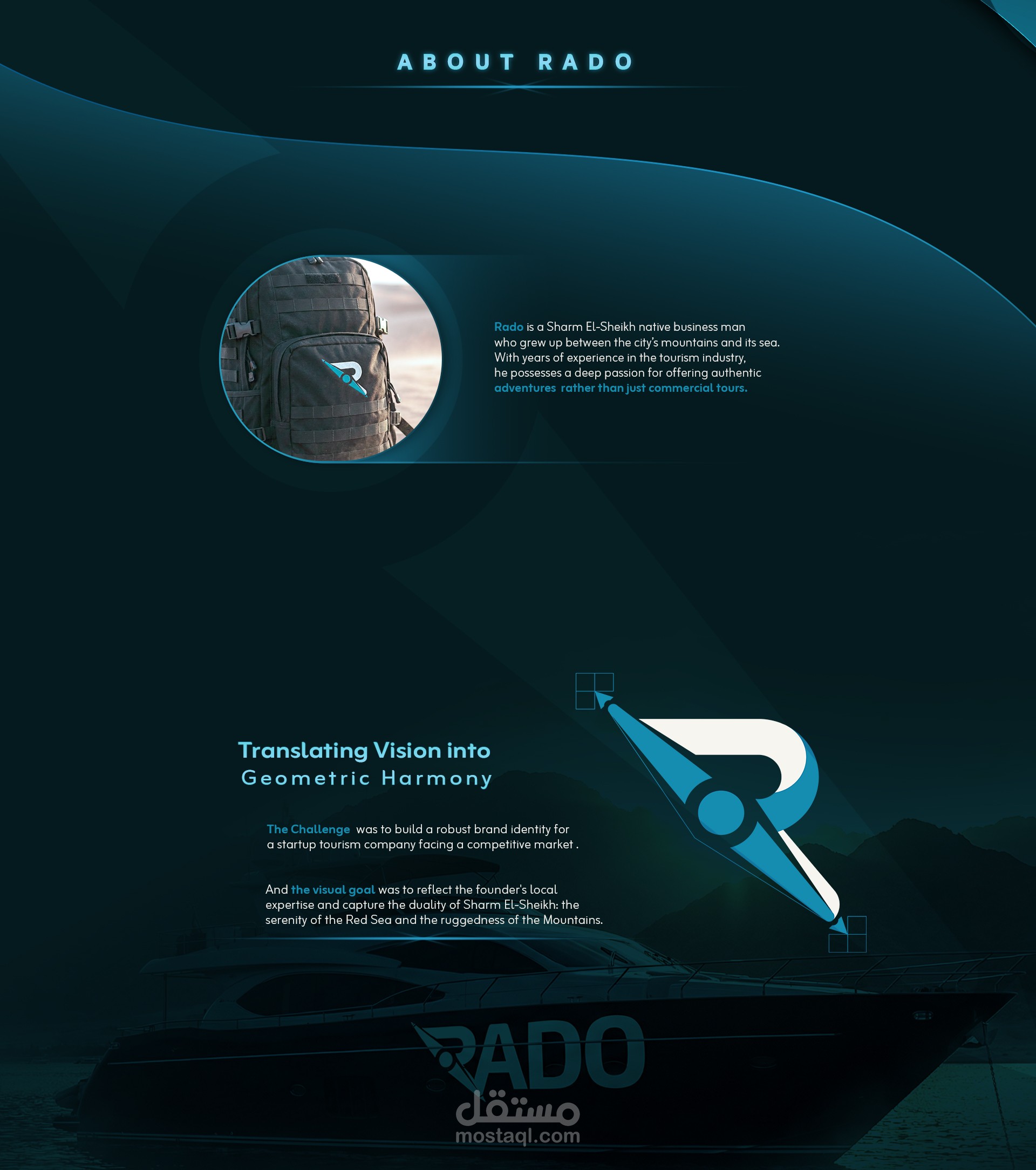 تعتبر "رادو" علامة تجارية ناشئة في قطاع السياحة بمدينة شرم الشيخ، أسسها خبير محلي بهدف تقديم مغامرات استكشافية أصيلة تتجاوز مجرد الرحلات التجارية التقليدية. تطلب المشروع بناء هوية بصرية قوية تعكس روح الاستكشاف والارتباط بالطبيعة الجبلية والبحرية للمدينة.