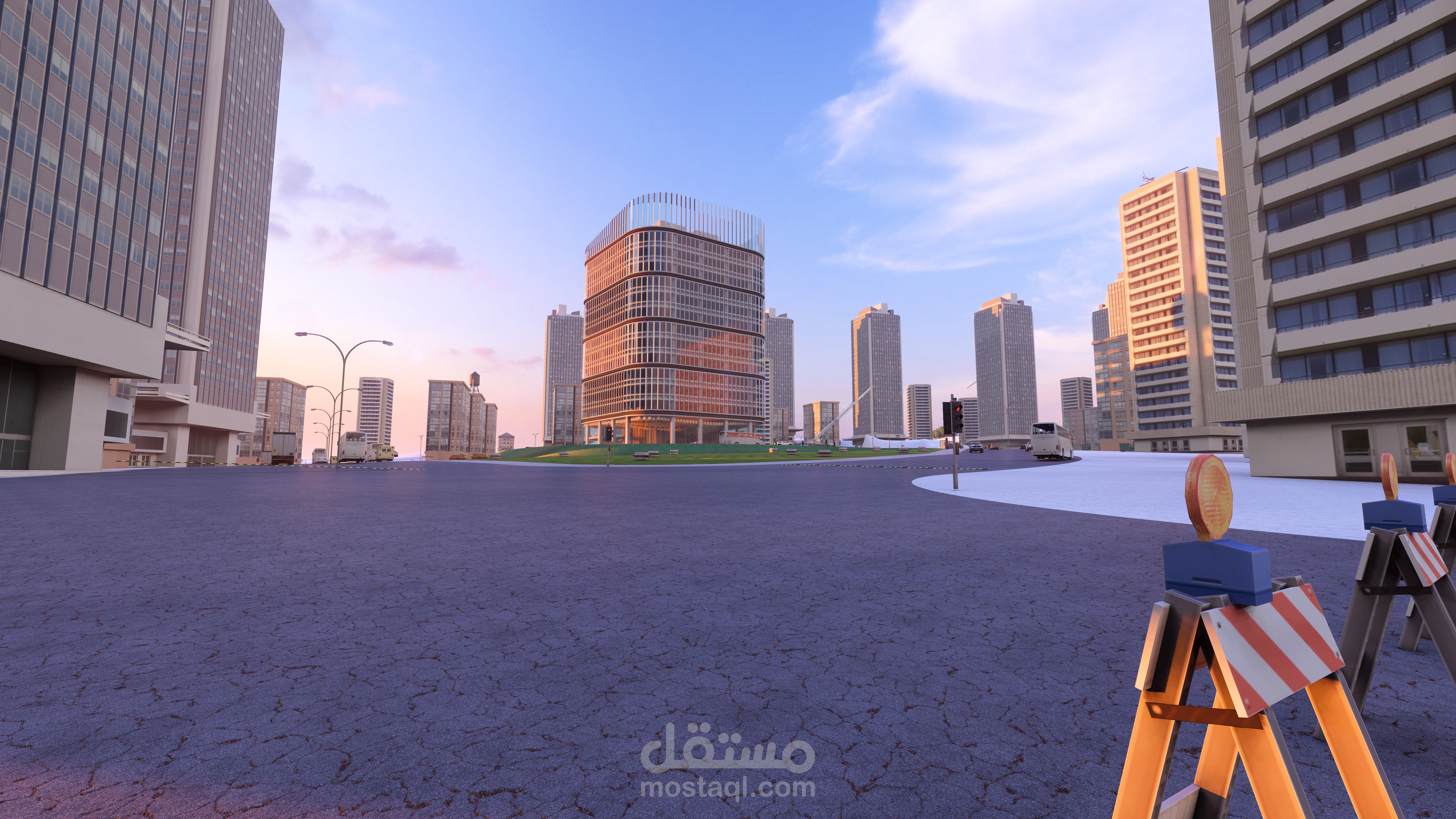 This project is a contemporary mixed-use building designed and modeled in Rhino, characterized by a smooth, rounded form and a layered glass façade that wraps the structure with vertical fins to control sunlight and enhance visual identity. The massing is organized around a central void that brings natural light deep into the interior and creates visual connection between floors, while the transparent envelope reflects the surrounding urban context and waterfront views. The ground level is lifted on pilotis to create an open public plaza that seamlessly connects pedestrians to the site, supported by a landscaped master plan that introduces green buffers, seating areas, and a clear circulation network for vehicles and visitors. Overall, the design aims to combine strong architectural presence with functional spatial organization and an inviting public realm.