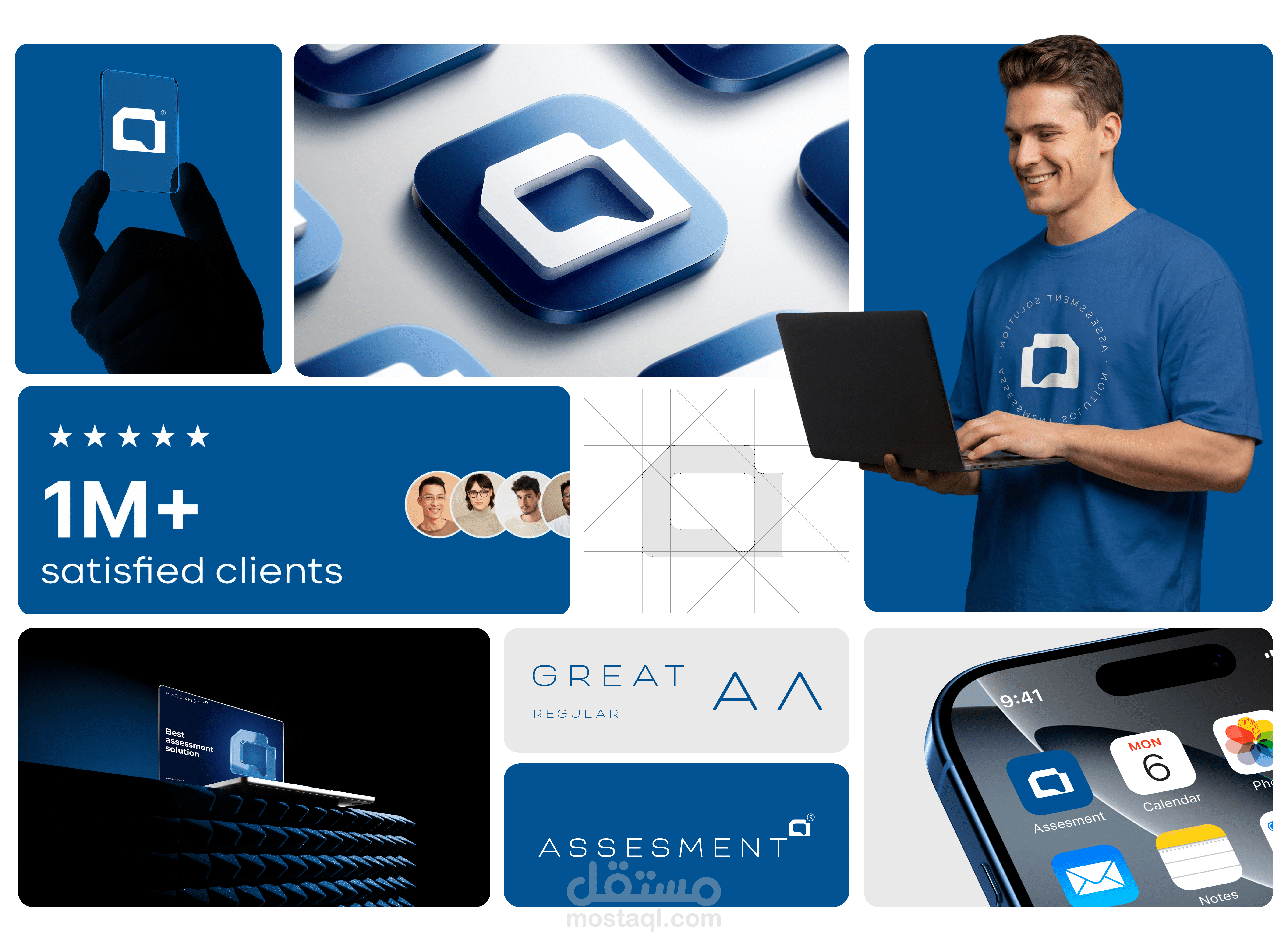 تم بناء الهوية على مفهوم الذكاء – الدقة – الموثوقية، حيث يجمع التصميم بين الطابع التقني الحديث والوضوح البصري ليعكس قوة المنصة وقدرتها على تقديم حلول تقييم احترافية في مجال الـ EdTech.
