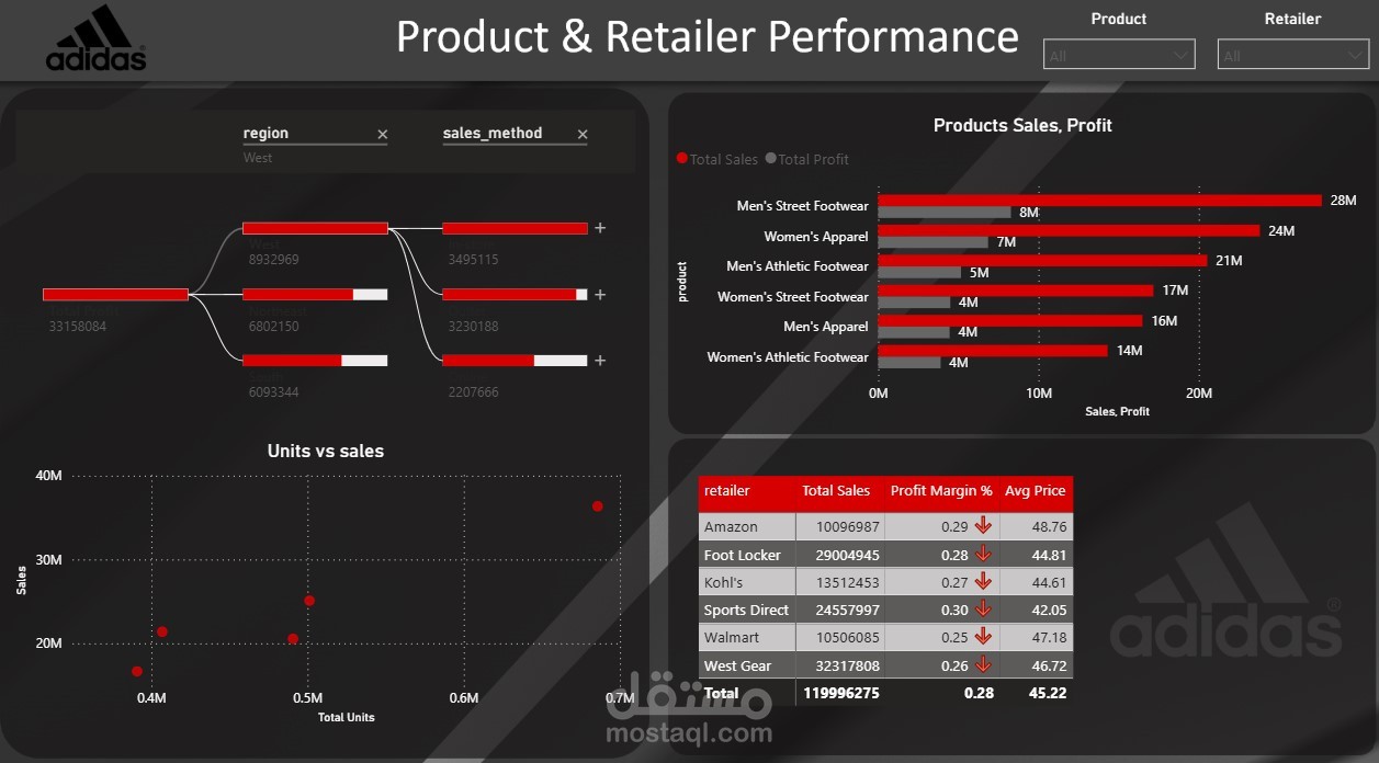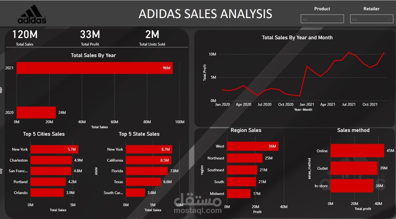 • فلاتر تفاعلية (Product, Retailer, Region, Sales Method)