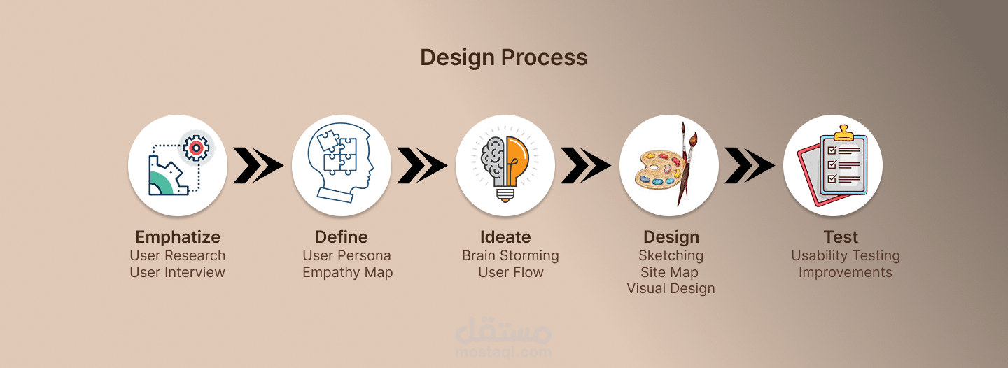 اعتمد التصميم على البحث النوعي لفهم دوافع المستخدمين، نقاط الألم، وتوقعاتهم، ثم ترجمة هذه الرؤى إلى حلول تصميمية واضحة وهيكلة معلومات منطقية تدعم الاستكشاف، اتخاذ القرار، والشعور بالملكية تجاه القطعة المخصّصة.