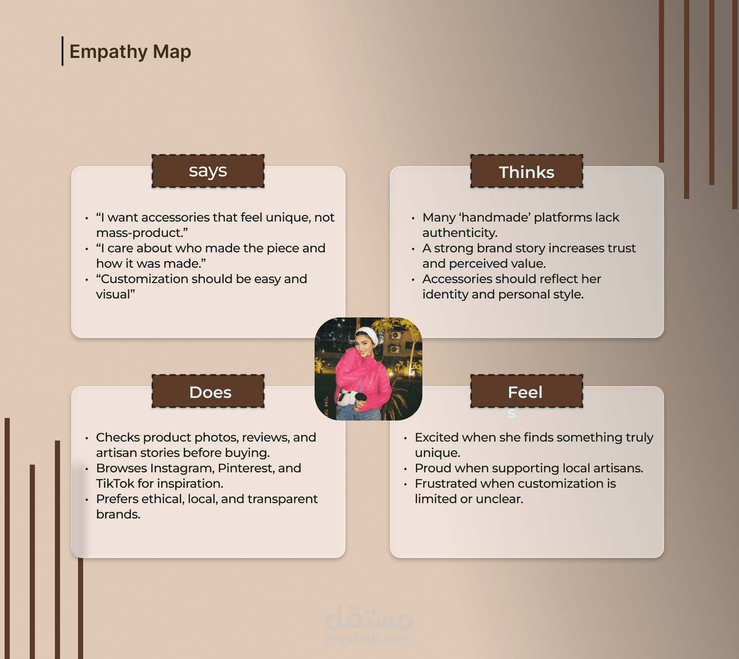 ينطلق المشروع من رؤية User-Centered تهدف إلى إعادة تعريف تجربة شراء الإكسسوارات، بحيث لا تكون مجرد عملية شراء، بل رحلة إبداعية وإنسانية تربط المستخدم بالحِرفة والحرفي والمنتج. تم بناء التجربة على ثلاث ركائز أساسية: الأصالة من خلال شفافية القصص الحرفية، التخصيص البصري في الوقت الفعلي، وتجربة تصفّح سلسة تعزز الثقة والاندماج العاطفي.