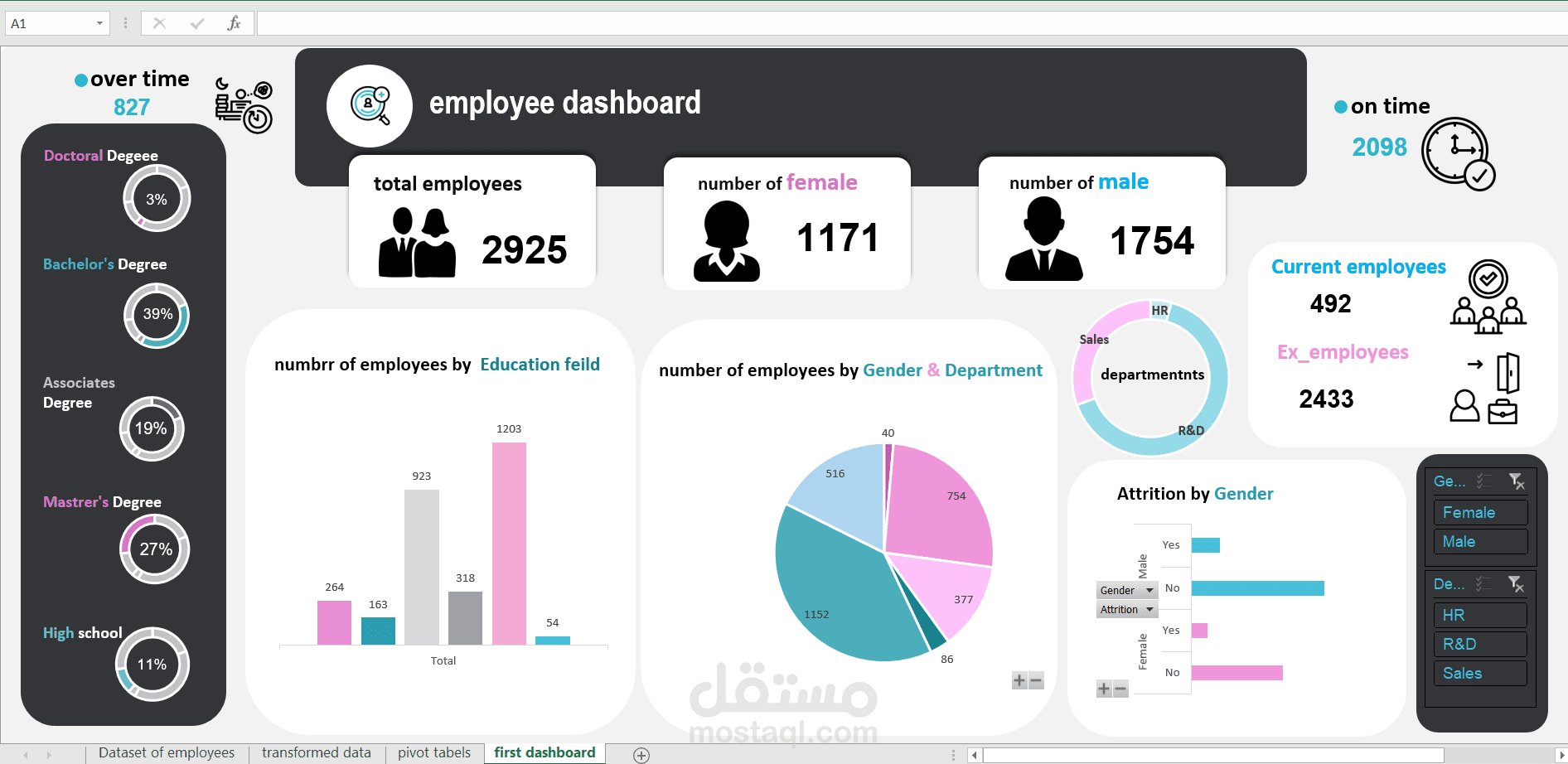 تنفيذ Employee Dashboard تساعد على متابعة أداء الموظفين وتنظيم بياناتهم بشكل واضح وسهل. تعرض اللوحة معلومات مثل عدد الموظفين، الحضور والانصراف، الأداء، الأقسام، ومؤشرات الإنتاجية، مع تقارير ورسومات توضيحية تساعد الإدارة على اتخاذ قرارات فعّالة