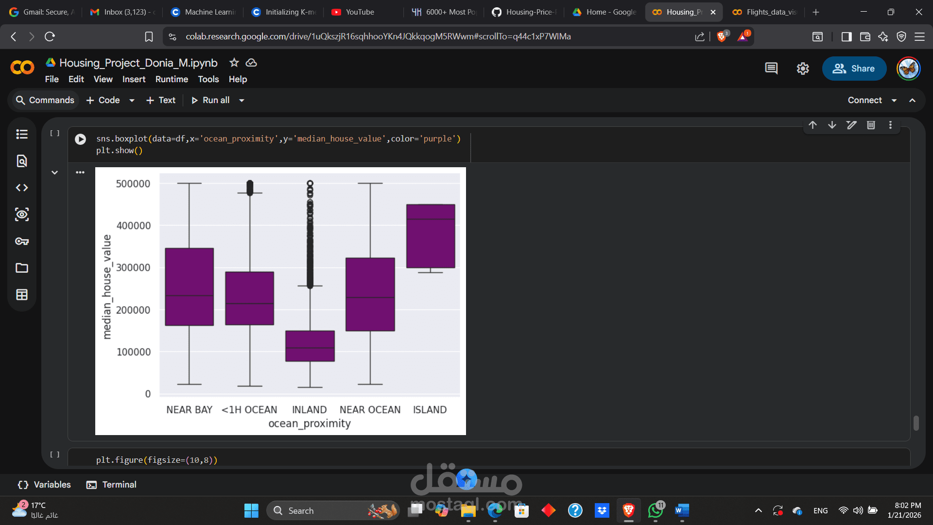صف المشروع: قمت في هذا المشروع بتنفيذ دورة حياة تحليل البيانات (Data Science Lifecycle) كاملة على مجموعة بيانات الإسكان في كاليفورنيا، بهدف بناء نموذج تعلم آلي (Machine Learning) قادر على التنبؤ بالقيمة المتوسطة للمنازل بدقة بناءً على مجموعة من الخصائص الجغرافية والديموغرافية.