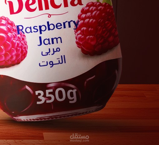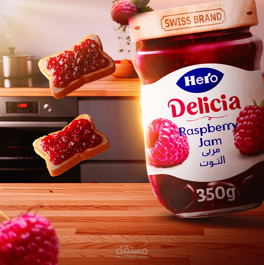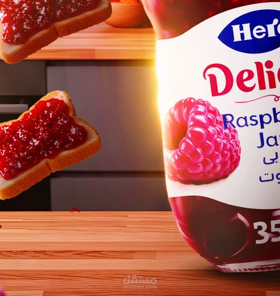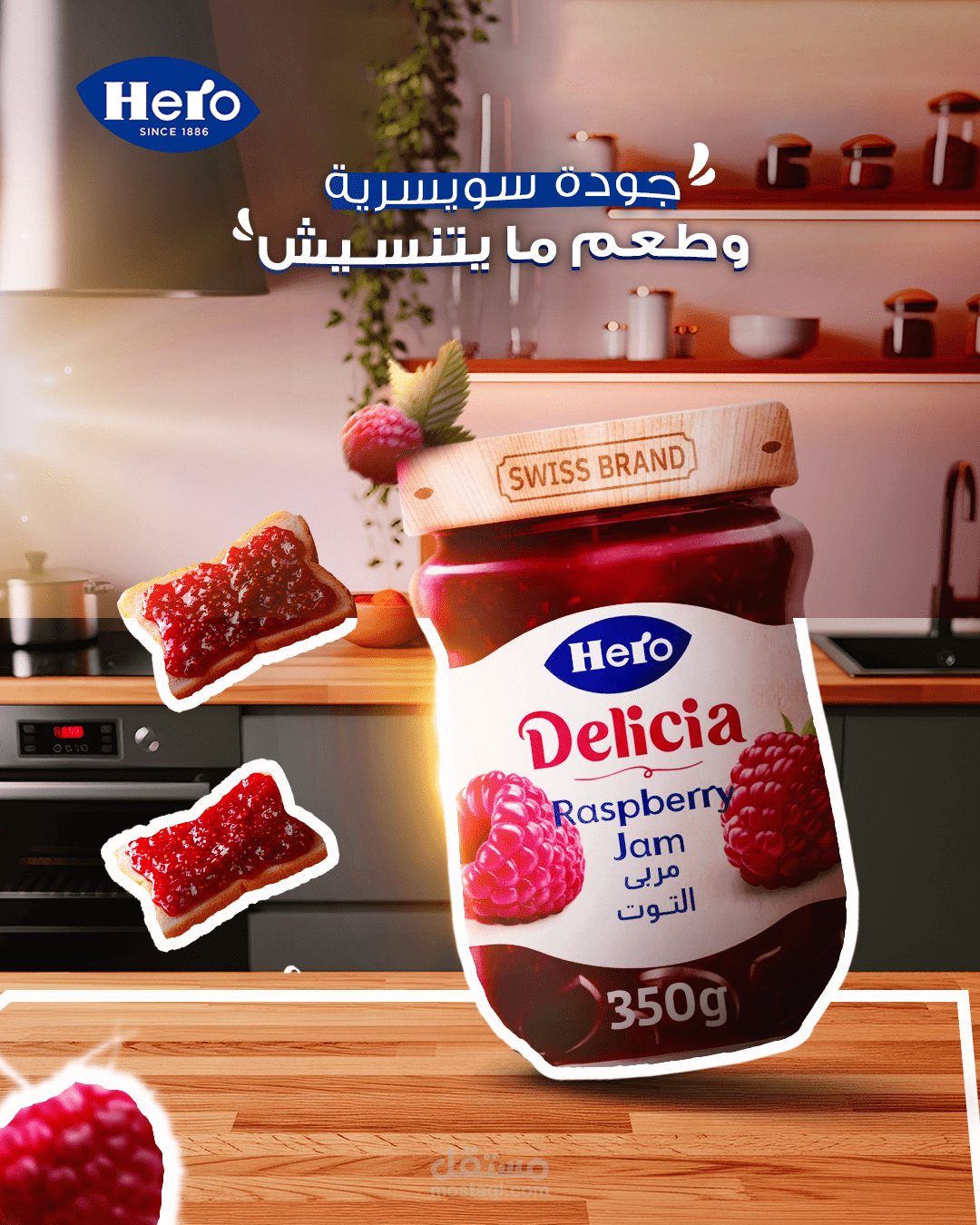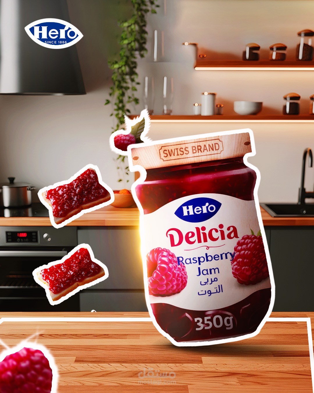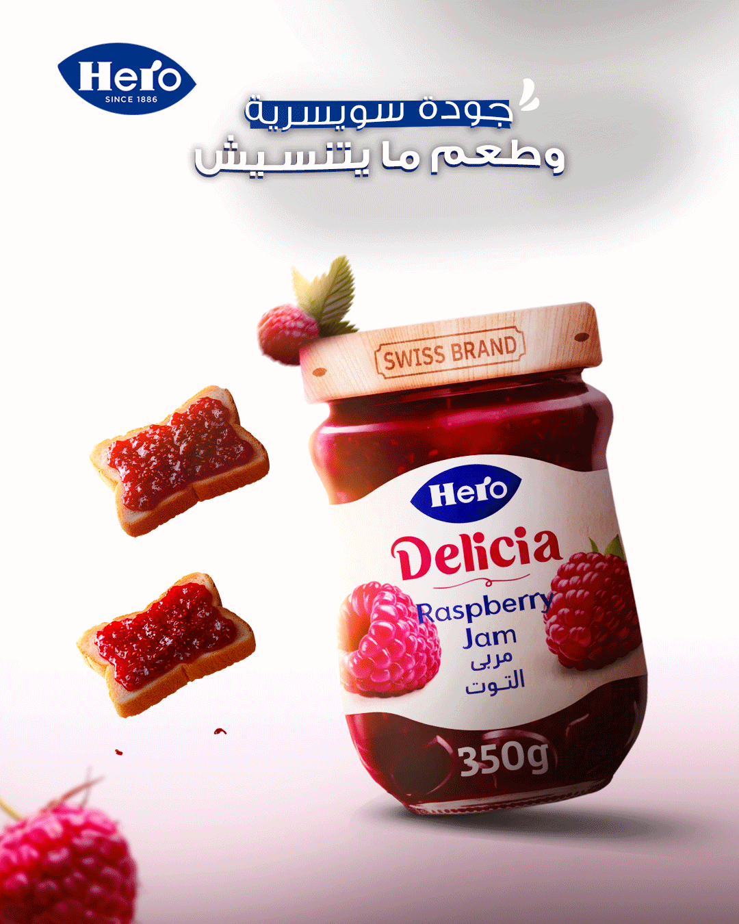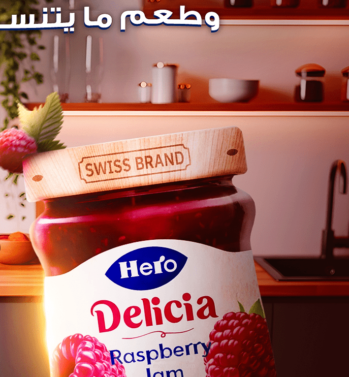 تصميم إعلاني لمنتج Hero Delicia Raspberry Jam بأسلوب بصري دافئ وشهي، يركز على إبراز جودة المنتج وطعمه الغني.