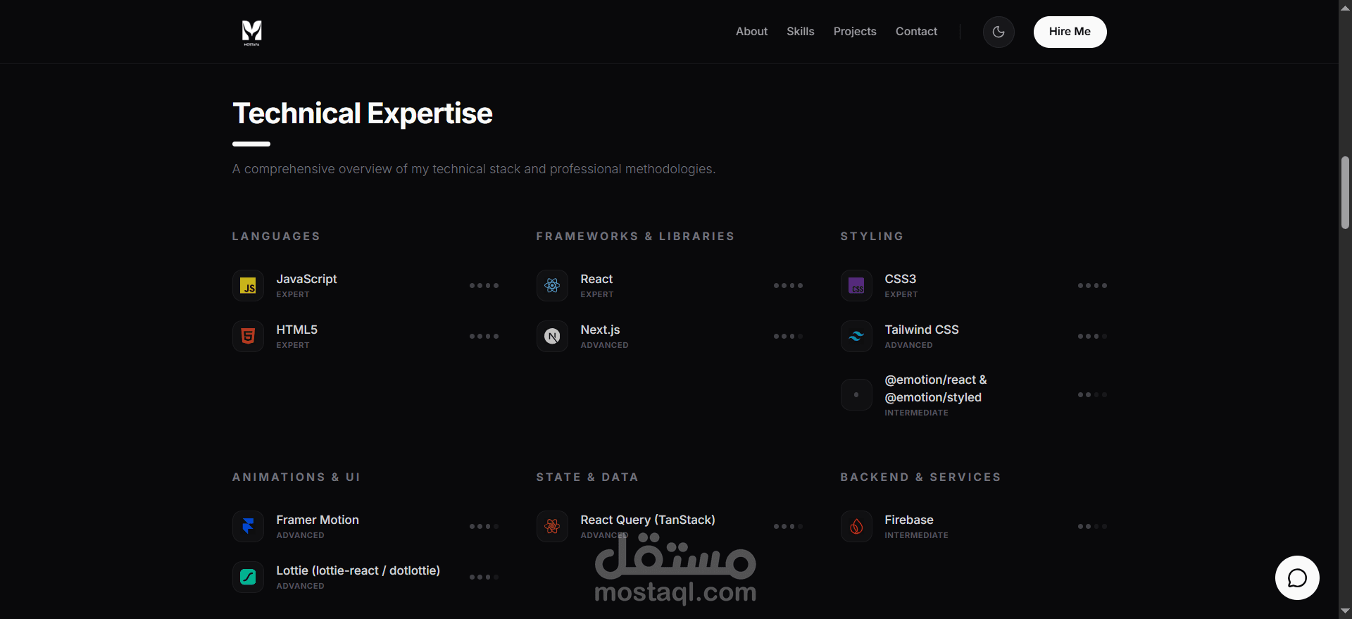 نظام عرض مشاريع ديناميكي: صفحات مخصصة لكل مشروع مع استعراض كامل للمميزات، التقنيات المستخدمة، روابط الـ Source Code، والمعاينة الحية.
