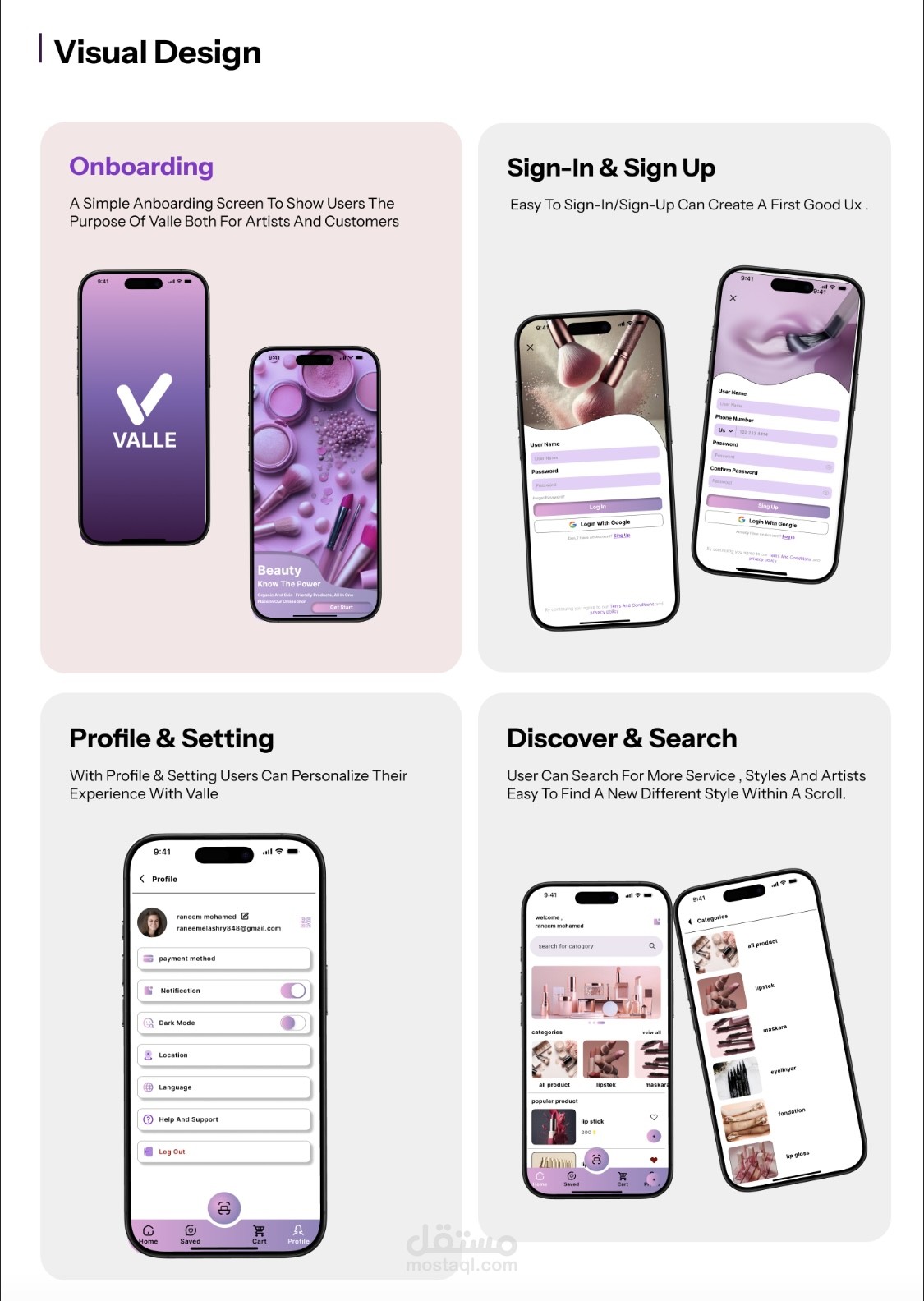 Valle هو تطبيق تسوق للمكياج عبر الهاتف المحمول، تم تصميمه لتقديم تجربة مستخدم عصرية وأنيقة تجمع بين السهولة والإلهام. يهدف التطبيق إلى تبسيط عملية اكتشاف وشراء منتجات التجميل من خلال واجهات استخدام بديهية، وتنقل سلس، وتصميم بصري جذاب يعكس عالم الجمال والموضة.