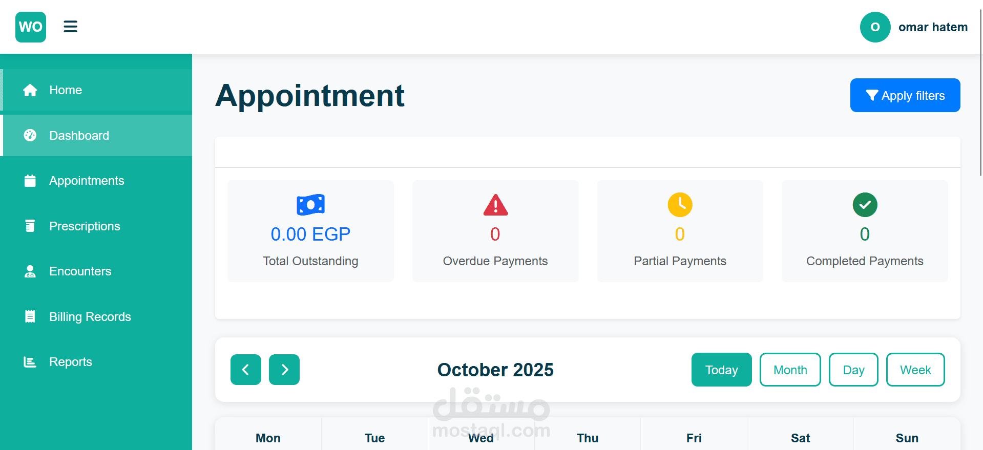 متابعة مدفوعات مرضاه وإيراداته وتقارير يومية/شهرية