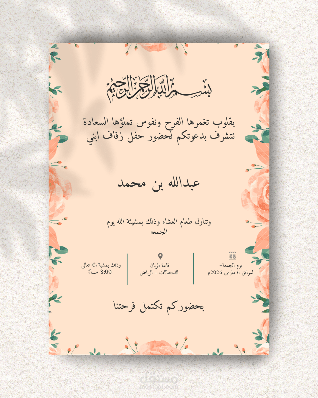 هذا المشروع عبارة عن مجموعة من 6 تصاميم دعوات تم تنفيذها بأسلوب أنيق وعصري، مع التركيز على البساطة، التوازن البصري، وجمالية الخط العربي. تم تصميم الدعوات لتناسب: دعوات مناسبات عائلية دعوات مواليد مناسبات خاصة استخدامات رقمية أو للطباعة وتم عرضها داخل Mockup احترافي لإبراز التصميم بشكل واقعي وجذاب، هدف المشروع: إظهار قوة التصميم، اختيار الألوان، وتناسق العناصر بأسلوب راقٍ يعكس هوية المصمم.