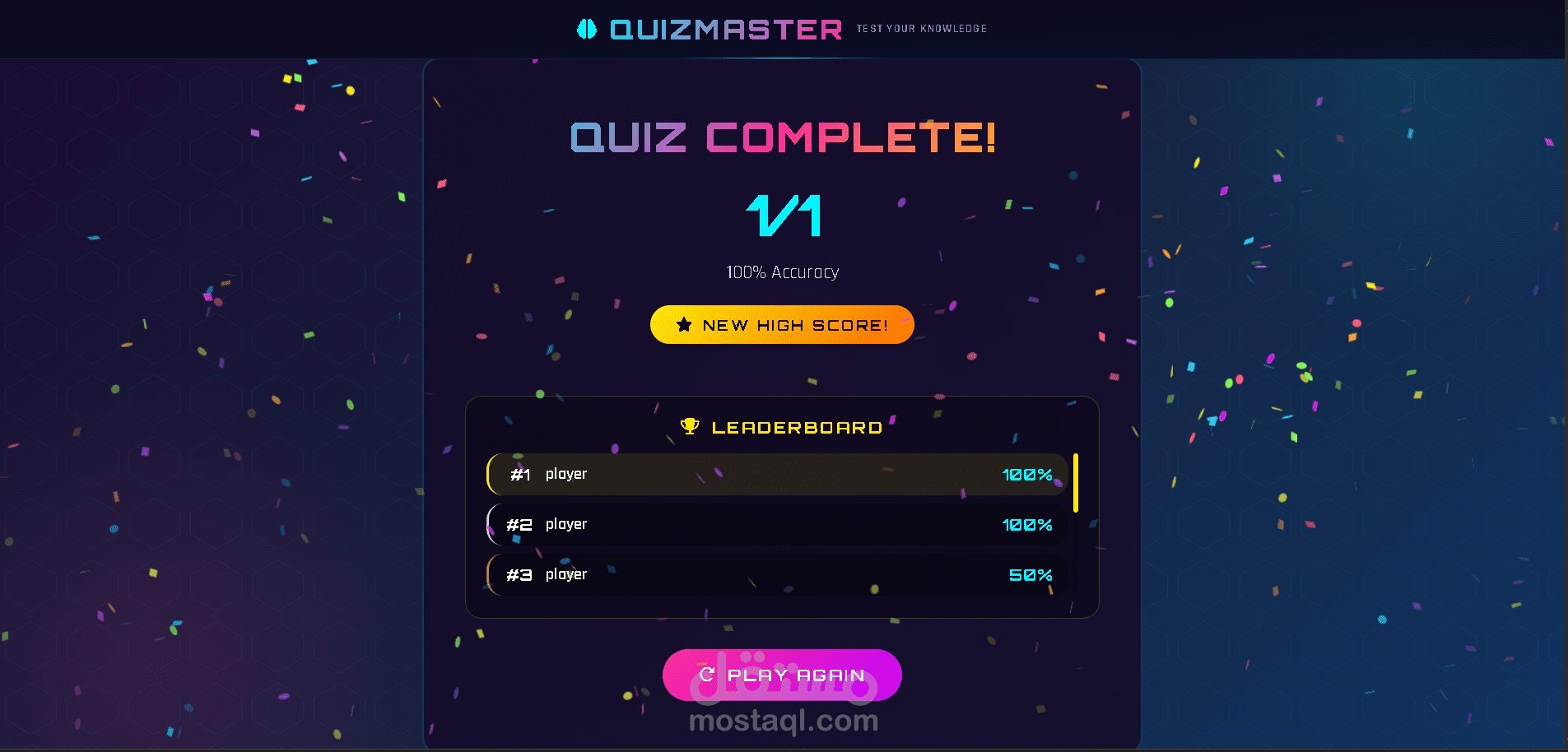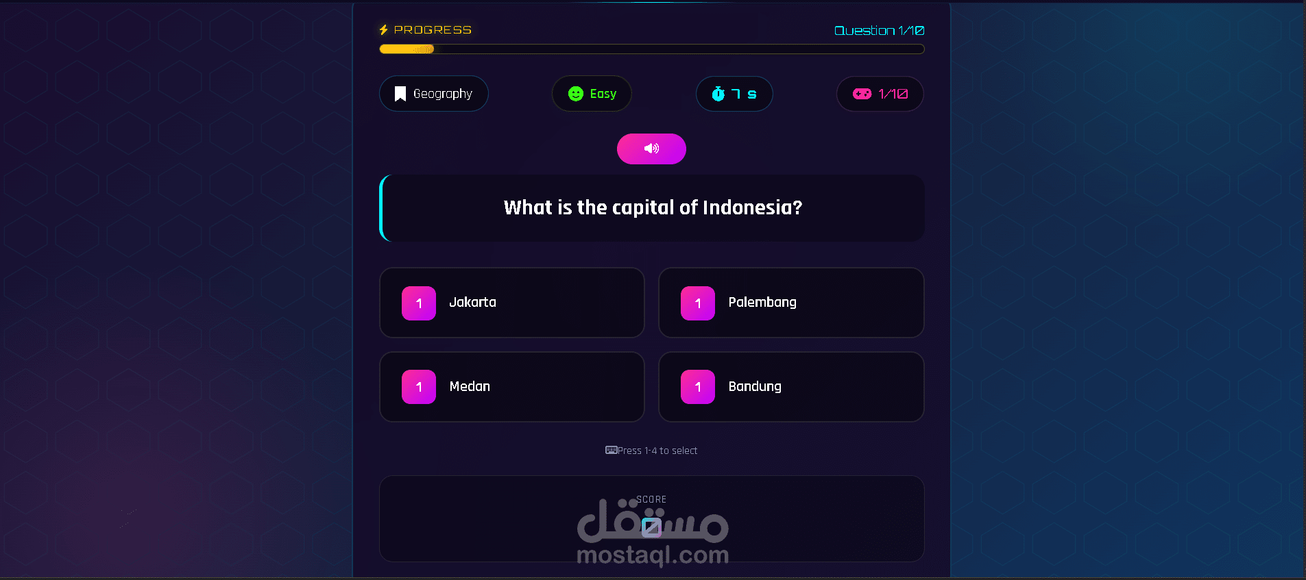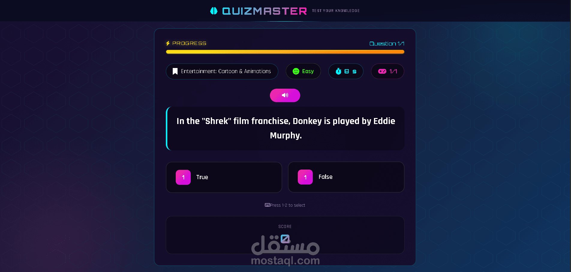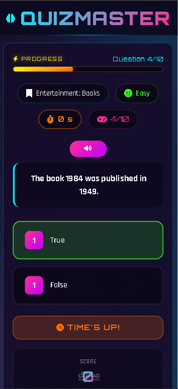 يقدم هذا المشروع تجربة اختبار تفاعلية وجذابة مع تكامل واجهة برمجة التطبيقات (API) في الوقت الفعلي، ومؤثرات صوتية مخصصة، وتتبع مستمر للنتائج، مما يجعله مثاليًا كمنصة تعليمية، أو مشروع تجريبي، أو قاعدة جاهزة للإنتاج.